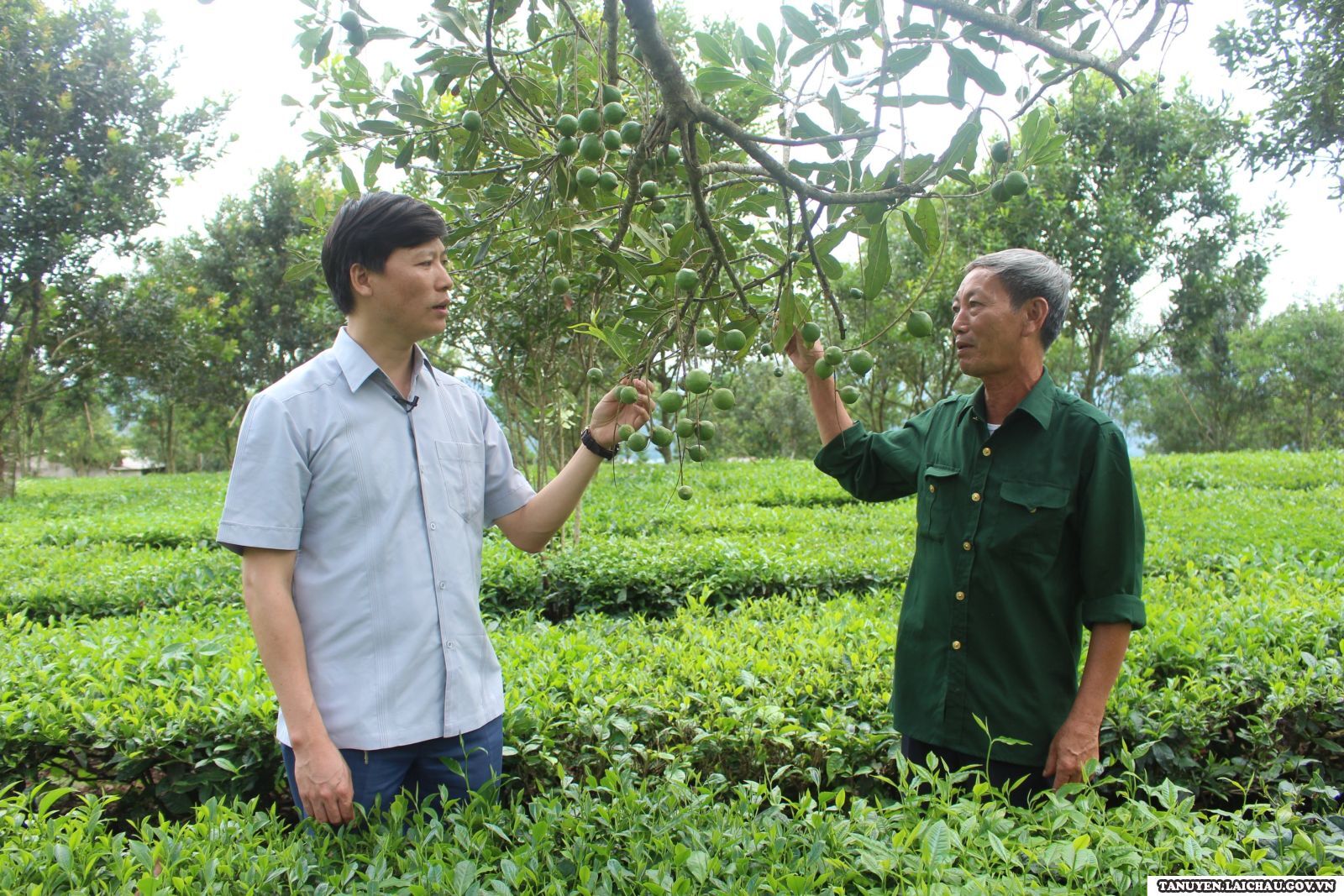 Ảnh: Đồng chí Bùi Huy Phương - Ủy viên BCH Đảng bộ huyện, Bí thư Huyện ủy, Chủ tịch HĐND huyện thăm vườn Mắc Ca của hội viên Nguyễn Xuân Cát tại Tổ dân phố 1, thị trấn Tân Uyên