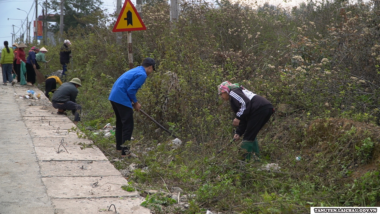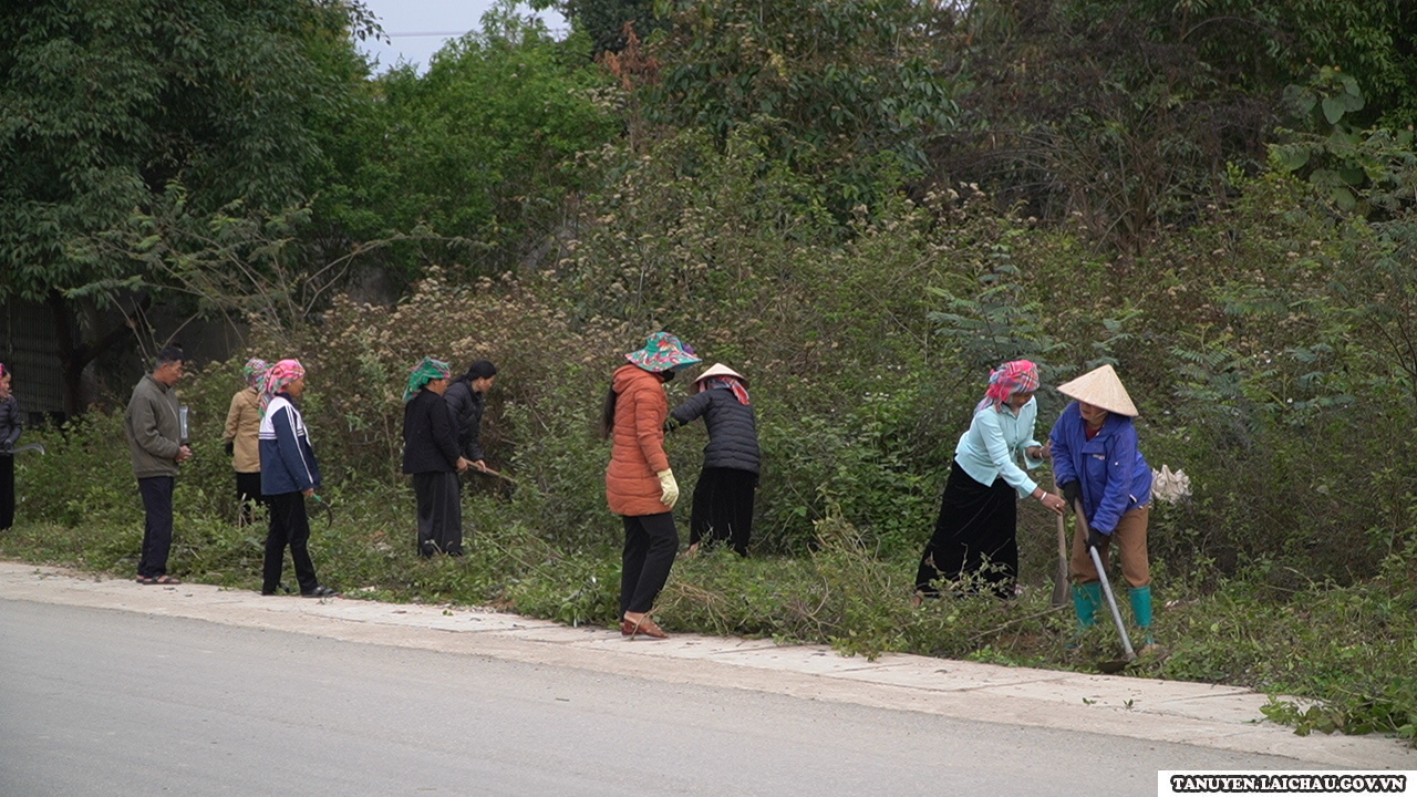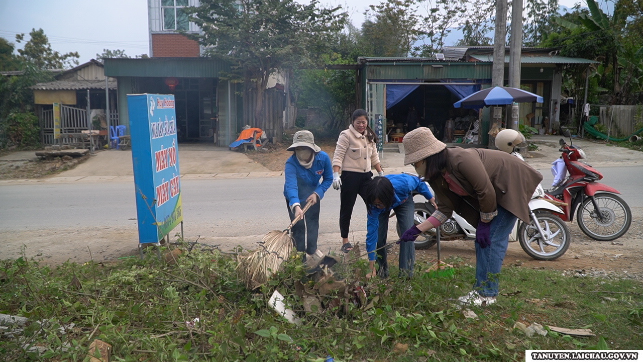 Ảnh: Nhân dân bản Chom Chăng, xã Thân Thuộc ra quân dọn vệ sinh các tuyến đường của bản