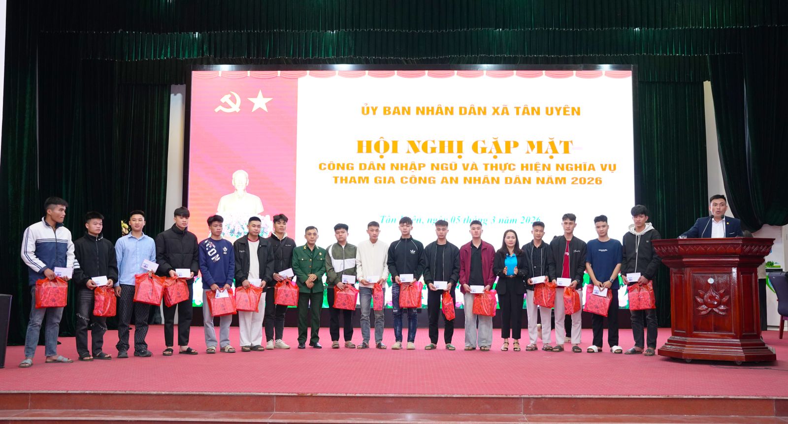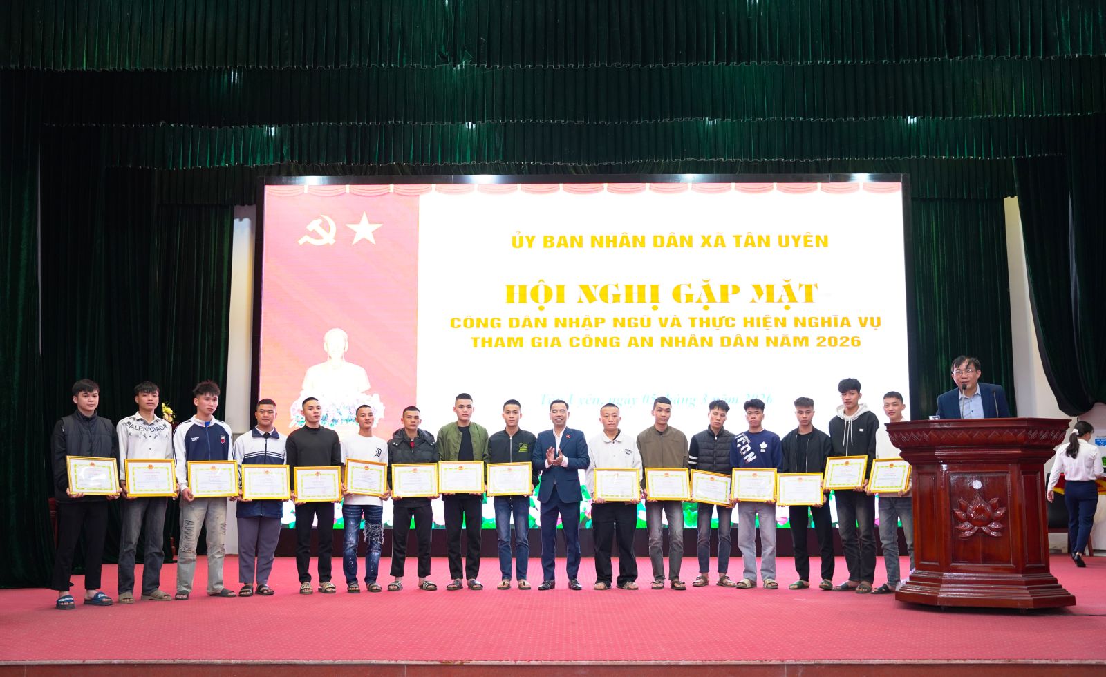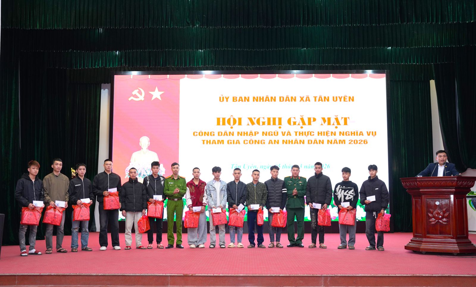 Phát biểu tại buổi gặp mặt, đồng chí Chu Văn Thanh – Phó Bí thư, Chủ tịch UBND xã nhấn mạnh, Đảng bộ, chính quyền, Nhân dân xã luôn tin tưởng 64 công dân trúng tuyển nghĩa vụ Quân sự và tham gia Công an nhân dân năm 2026; có nhận thức đúng đắn, đầy đủ về trách nhiệm, nghĩa vụ của bản thân đối với quê hương, đất nước. Dù trong bất kỳ điều kiện, hoàn cảnh nào cũng phải đoàn kết khắc phục khó khăn, vững vàng, toàn tâm, toàn ý, phấn đấu rèn luyện vươn lên hoàn thành xuất sắc nghĩa vụ thiêng liêng đối với Tổ quốc; trong học tập, huấn luyện và công tác, phải đoàn kết gắn bó tương trợ giúp đỡ nhau cùng tiến bộ, trở thành người quân nhân tốt, nhiều đồng chí được đứng trong hàng ngũ của Đảng. Khi hoàn thành nghĩa vụ trở về địa phương, các đồng chí là hạt nhân, nhân tố trong các chi bộ trực thuộc Đảng bộ xã Tân Uyên để tiếp tục góp phần cùng với cán bộ, đảng viên và Nhân dân xây dựng quê hương ngày càng giàu đẹp. Đồng thời đồng chí đề nghị, trong thời gian tới, cấp ủy, chính quyền, MTTQ và các tổ chức chính trị - xã hội xã tiếp tục quan tâm, thực hiện tốt chính sách hậu phương quân đội, kịp thời thăm hỏi, động viên các gia đình; phối hợp chặt chẽ với đơn vị nhận quân để nắm bắt tình hình, tạo điều kiện thuận lợi nhất cho các đồng chí hoàn thành nghĩa vụ; đồng chí nhấn mạnh, phát huy truyền thống vẻ vang của quê hương, của Quân đội nhân dân và Công an nhân dân Việt Nam tôi kêu gọi các đồng chí thanh niên hãy mang theo niềm tự hào của gia đình và quê hương, quyết tâm phấn đấu, rèn luyện, xứng đáng với niềm tin yêu của Đảng bộ, chính quyền và nhân dân trong xã. Chúc các Tân binh lên đường mạnh khỏe, hoàn thành xuất sắc nhiệm vụ được giao.