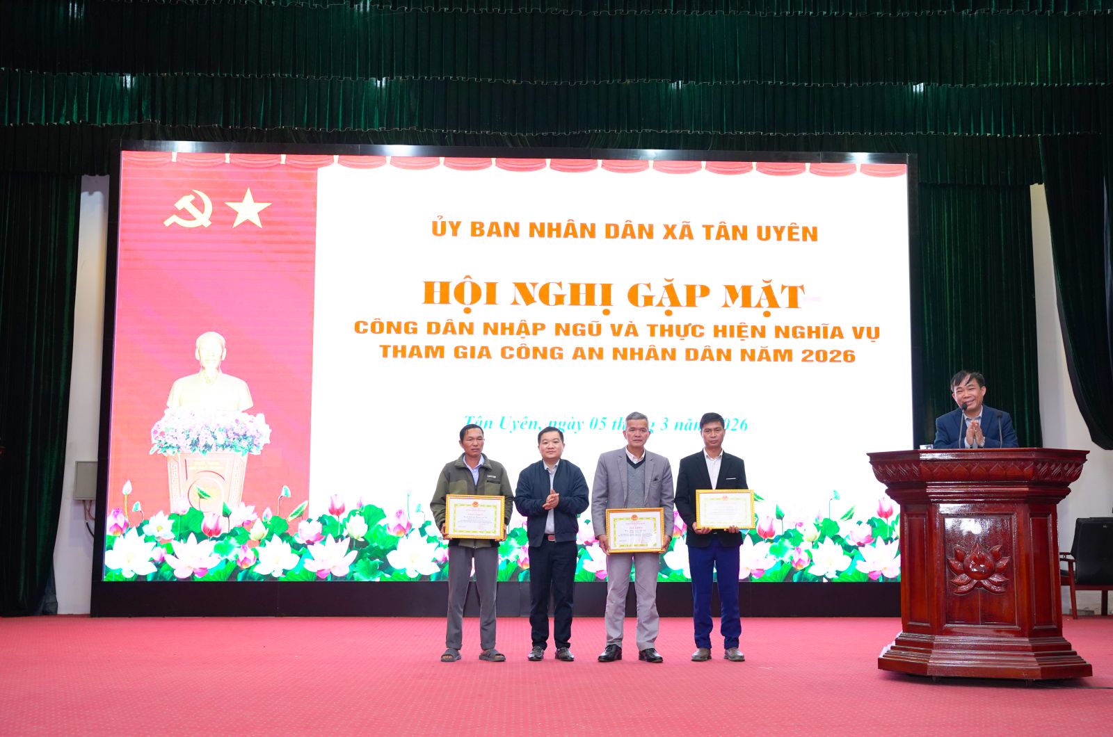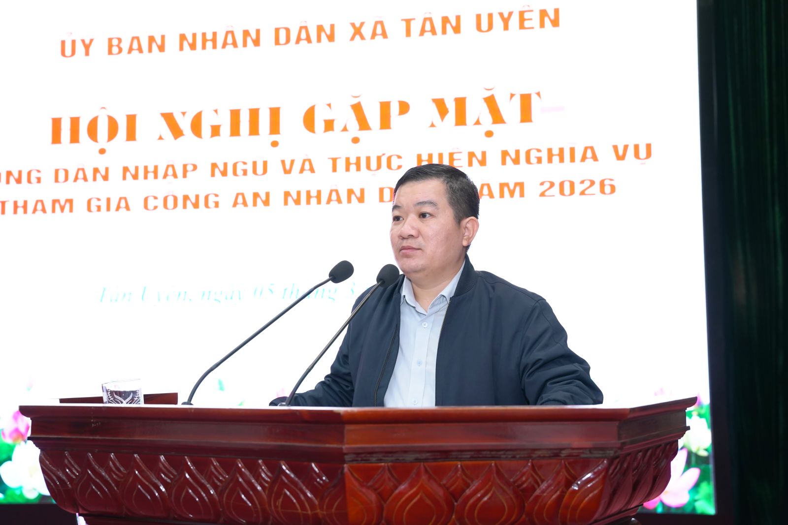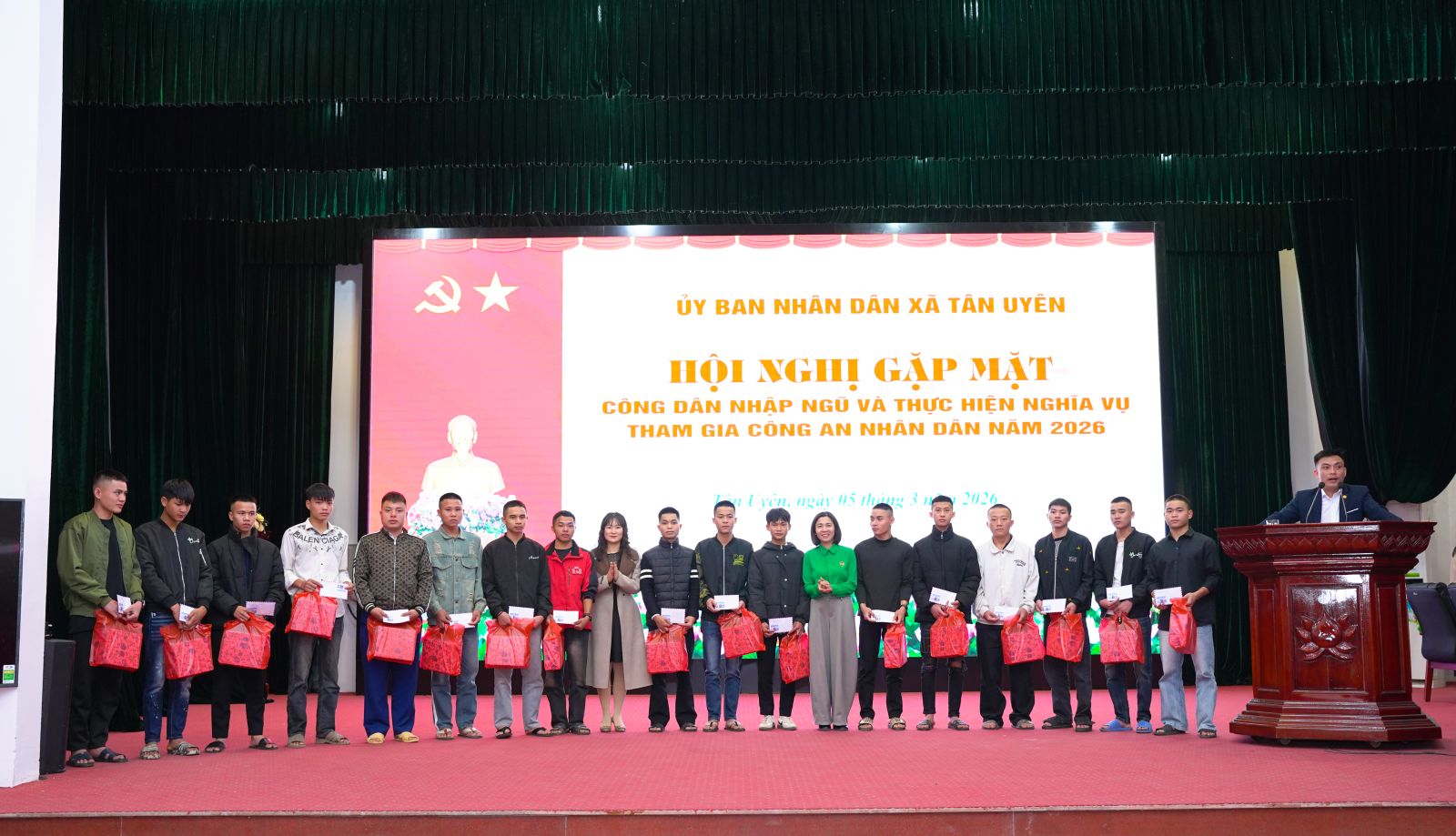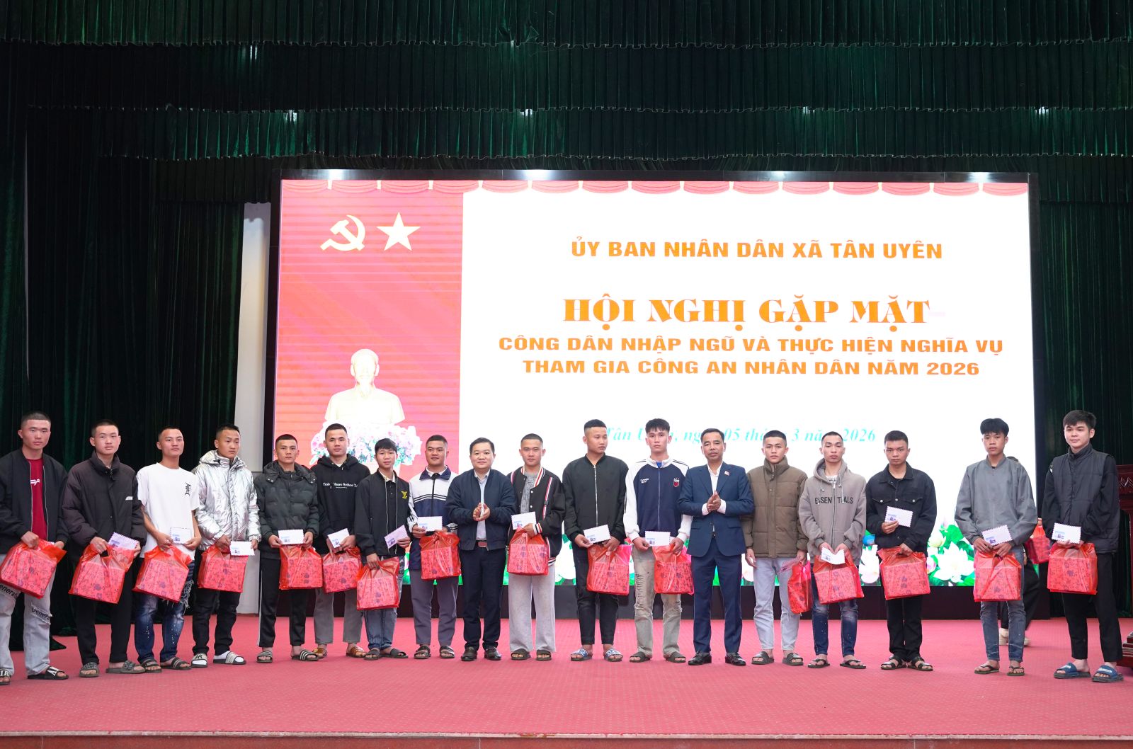Phát biểu tại buổi gặp mặt, đồng chí Chu Văn Thanh – Phó Bí thư, Chủ tịch UBND xã nhấn mạnh, Đảng bộ, chính quyền, Nhân dân xã luôn tin tưởng 64 công dân trúng tuyển nghĩa vụ Quân sự và tham gia Công an nhân dân năm 2026; có nhận thức đúng đắn, đầy đủ về trách nhiệm, nghĩa vụ của bản thân đối với quê hương, đất nước. Dù trong bất kỳ điều kiện, hoàn cảnh nào cũng phải đoàn kết khắc phục khó khăn, vững vàng, toàn tâm, toàn ý, phấn đấu rèn luyện vươn lên hoàn thành xuất sắc nghĩa vụ thiêng liêng đối với Tổ quốc; trong học tập, huấn luyện và công tác, phải đoàn kết gắn bó tương trợ giúp đỡ nhau cùng tiến bộ, trở thành người quân nhân tốt, nhiều đồng chí được đứng trong hàng ngũ của Đảng. Khi hoàn thành nghĩa vụ trở về địa phương, các đồng chí là hạt nhân, nhân tố trong các chi bộ trực thuộc Đảng bộ xã Tân Uyên để tiếp tục góp phần cùng với cán bộ, đảng viên và Nhân dân xây dựng quê hương ngày càng giàu đẹp. Đồng thời đồng chí đề nghị, trong thời gian tới, cấp ủy, chính quyền, MTTQ và các tổ chức chính trị - xã hội xã tiếp tục quan tâm, thực hiện tốt chính sách hậu phương quân đội, kịp thời thăm hỏi, động viên các gia đình; phối hợp chặt chẽ với đơn vị nhận quân để nắm bắt tình hình, tạo điều kiện thuận lợi nhất cho các đồng chí hoàn thành nghĩa vụ; đồng chí nhấn mạnh, phát huy truyền thống vẻ vang của quê hương, của Quân đội nhân dân và Công an nhân dân Việt Nam tôi kêu gọi các đồng chí thanh niên hãy mang theo niềm tự hào của gia đình và quê hương, quyết tâm phấn đấu, rèn luyện, xứng đáng với niềm tin yêu của Đảng bộ, chính quyền và nhân dân trong xã. Chúc các Tân binh lên đường mạnh khỏe, hoàn thành xuất sắc nhiệm vụ được giao.