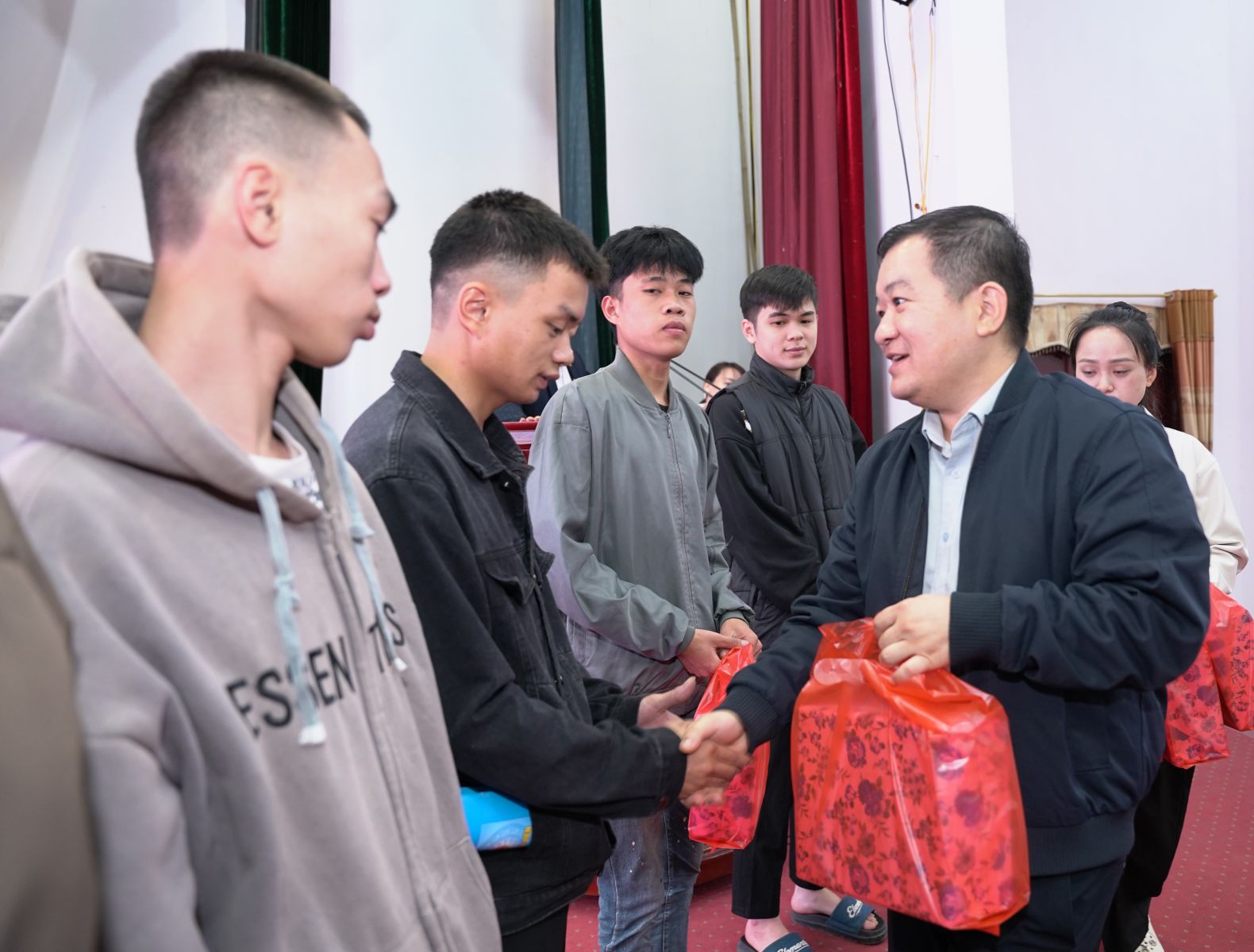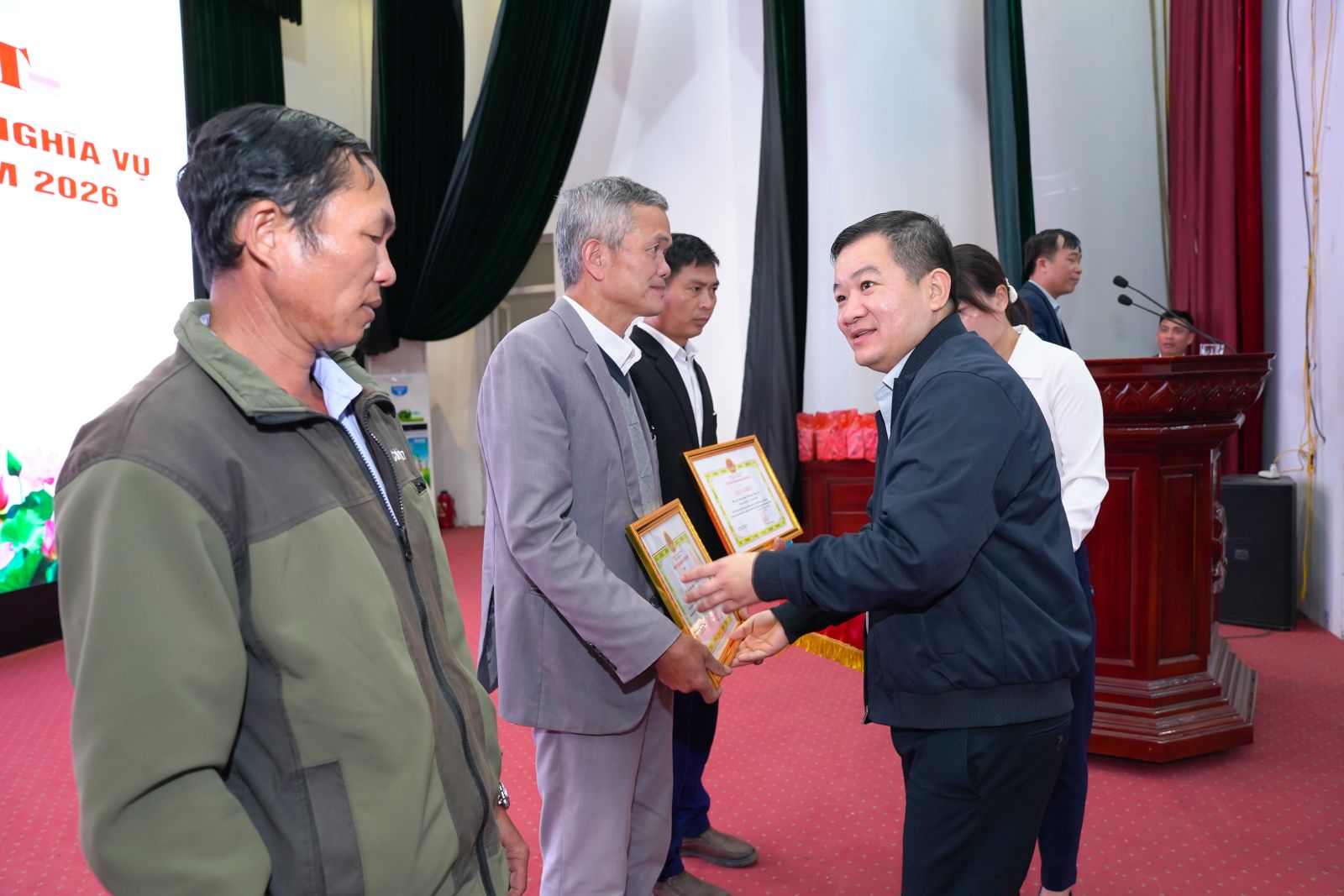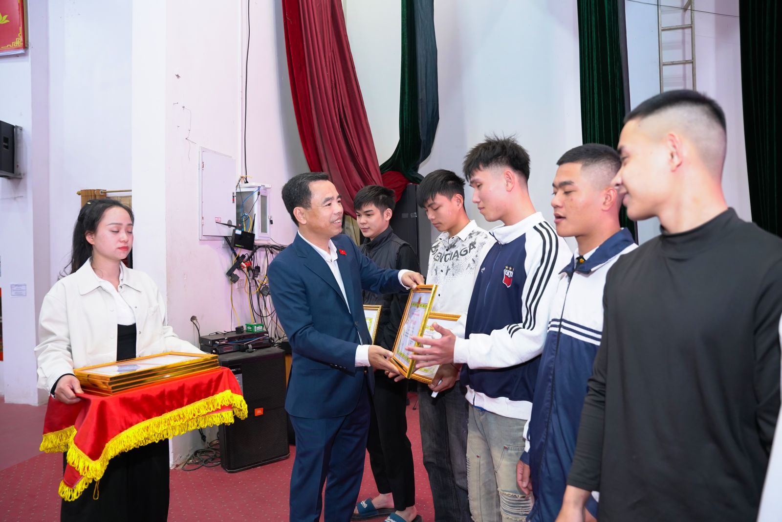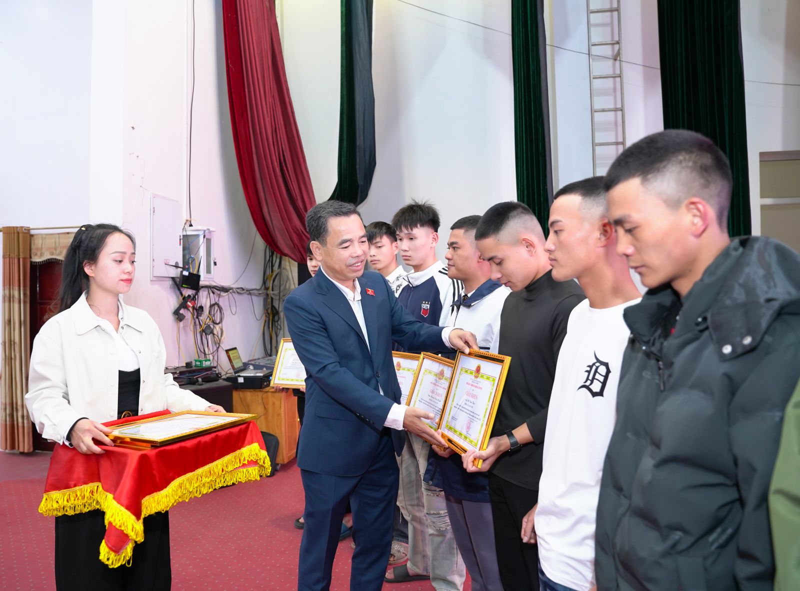 Ảnh: Đồng chí Nguyễn Minh Hiệu, Bí thư Đảng ủy; đồng chí Chu Văn Thanh, Chủ tịch UBND xã; lãnh đạo UBND, các ban, ngành, đoàn thể xã trao quà và giấy khen cho các thanh niên và hộ gia đình.