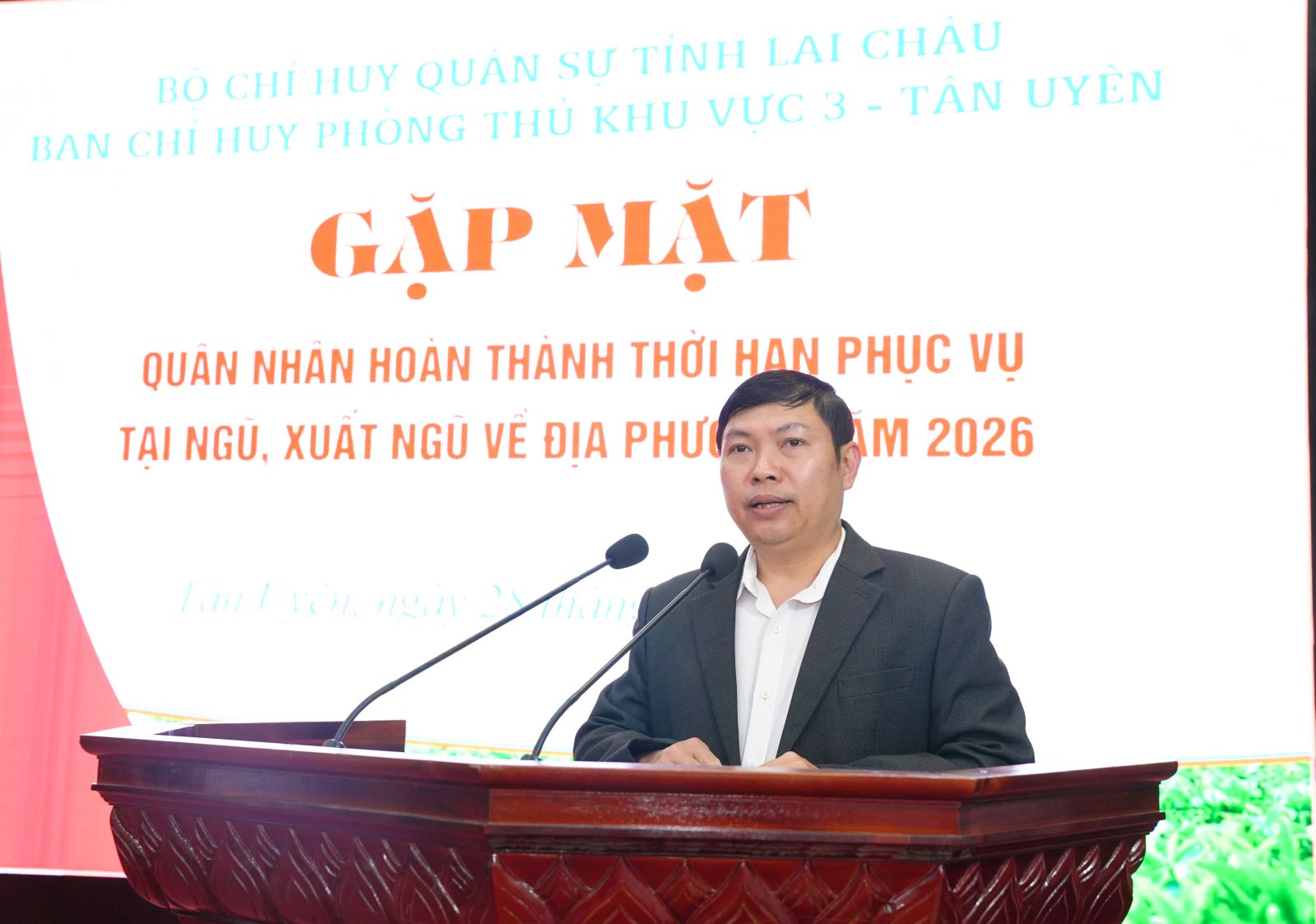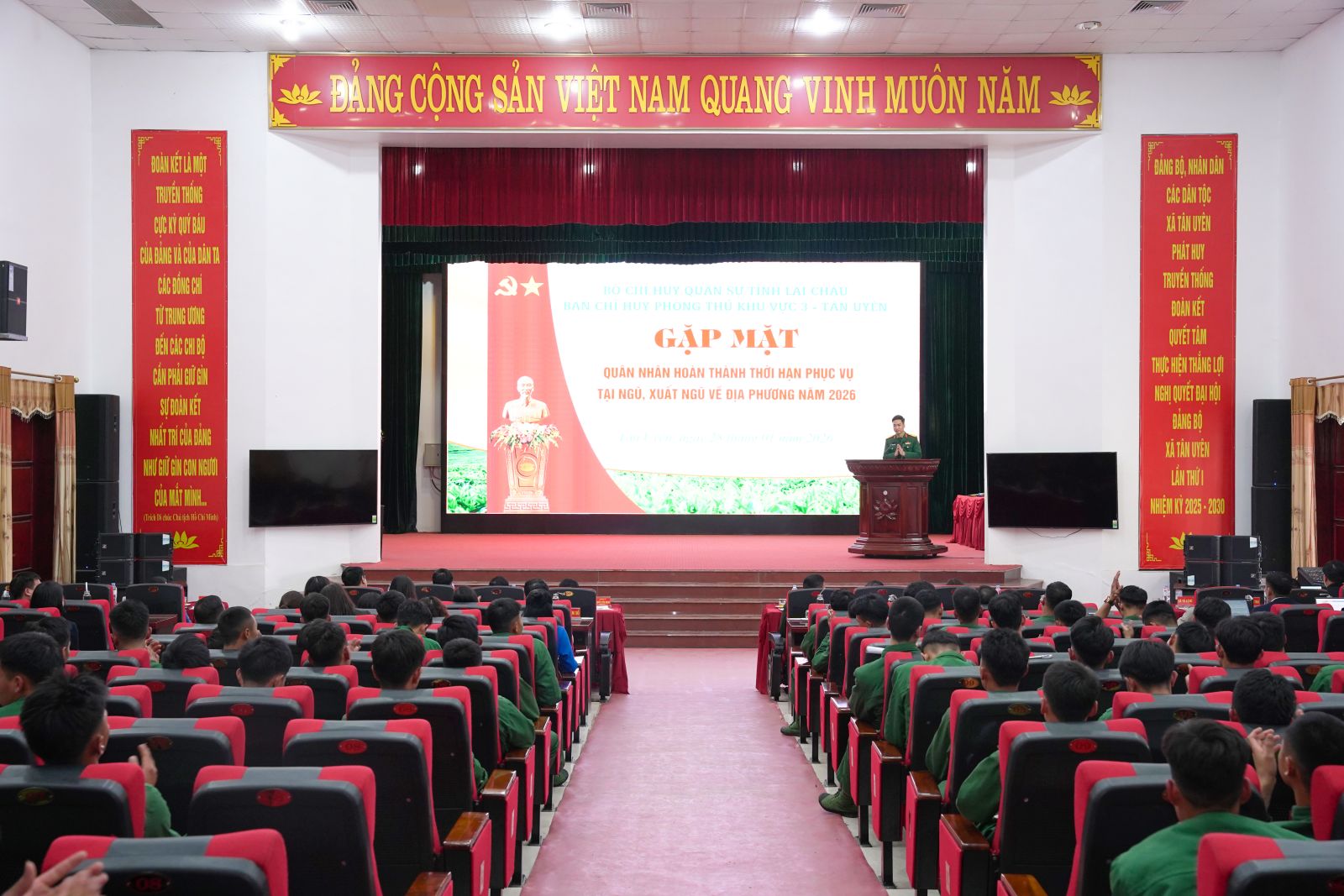 Chiều ngày (28/01), tại xã Tân Uyên, Ban Chỉ huy Phòng thủ khu vực 3 Tân Uyên tổ chức gặp mặt các quân nhân hoàn thành thời hạn phục vụ tại ngũ, xuất ngũ trở về địa phương năm 2026. Dự buổi gặp mặt có đồng chí đại tá: Nguyễn Hữu Đức – Chỉ huy Trưởng Ban Chỉ huy Phòng thủ khu vực 3 Tân Uyên; lãnh đạo, cán bộ, chiến sỹ Ban chỉ huy phòng thủ khu vực 3 – Tân Uyên; đại diện lãnh đạo các xã Than Uyên; Pắc Ta; Nậm Sỏ; Mường Than, Mường Kim; Kheo on; Bản Bo; Bình Lư: Tà Lẻng; Nậm Cuổi. Về phía xã Tân Uyên có đồng chí Chu Văn Thanh – Phó Bí thư, Chủ tịch UBND xã; lãnh đạo Thường trực HĐND – UBND – UBMTTQVN xã; các ban, ngành, đoàn thể chính trị - xã hội xã cùng 262 quân nhân.