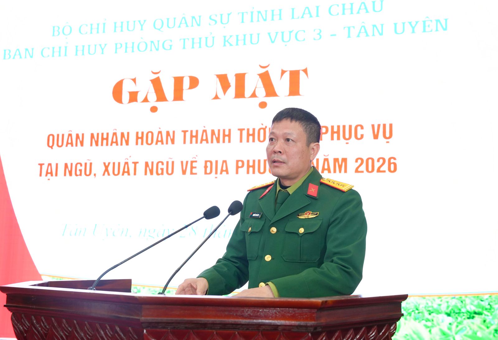 Phát biểu tại buổi gặp mặt, đồng chí Đại tá: Nguyễn Hữu Đức – Chỉ huy Trưởng Ban Chỉ huy Phòng thủ khu vực 3 Tân Uyên ghi nhận và biểu dương tinh thần trách nhiệm, ý thức tổ chức kỷ luật, sự nỗ lực hoàn thành tốt nhiệm vụ của các quân nhân trong suốt thời gian phục vụ tại ngũ. Đồng thời mong muốn khi trở về địa phương, các đồng chí tiếp tục phát huy phẩm chất “Bộ đội Cụ Hồ”, gương mẫu chấp hành chủ trương của Đảng, chính sách, pháp luật của Nhà nước, tích cực tham gia lao động sản xuất, xây dựng quê hương ngày càng phát triển.