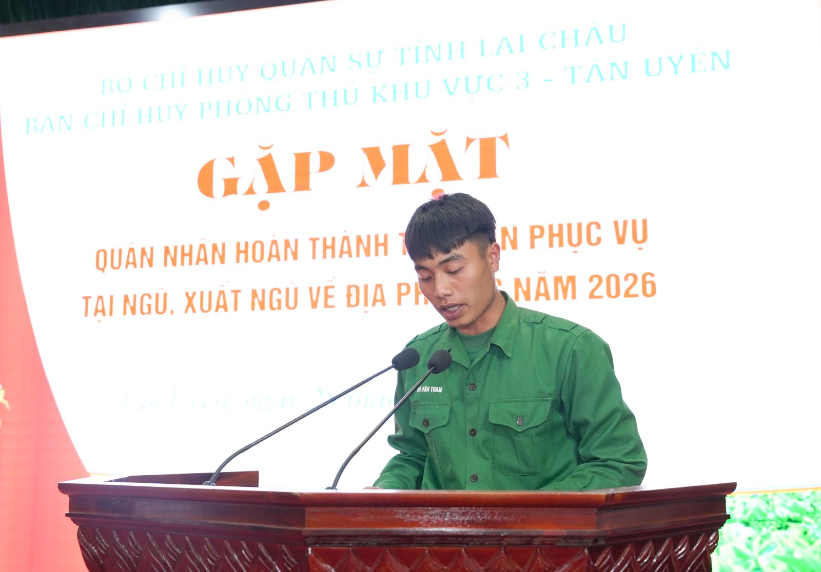 Đại diện các quân nhân xuất ngũ, quân nhân Hà Văn Toan đã phát biểu bày tỏ niềm tự hào khi được rèn luyện, cống hiến trong Quân đội nhân dân Việt Nam; đồng thời hứa sẽ tiếp tục giữ vững bản lĩnh chính trị, tinh thần kỷ luật, sẵn sàng tham gia lực lượng dự bị động viên khi Tổ quốc cần.