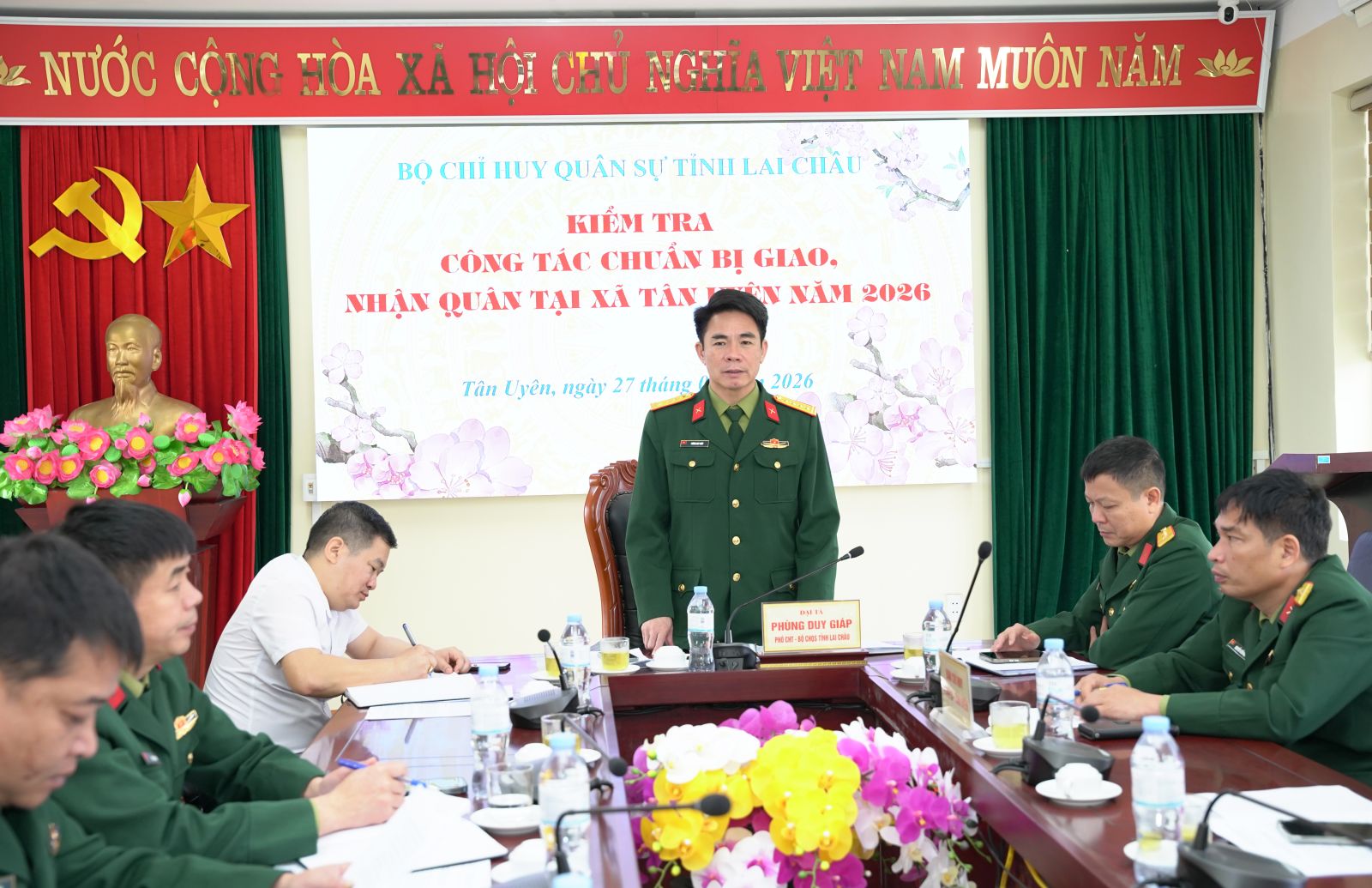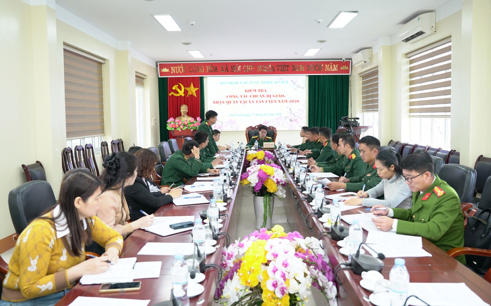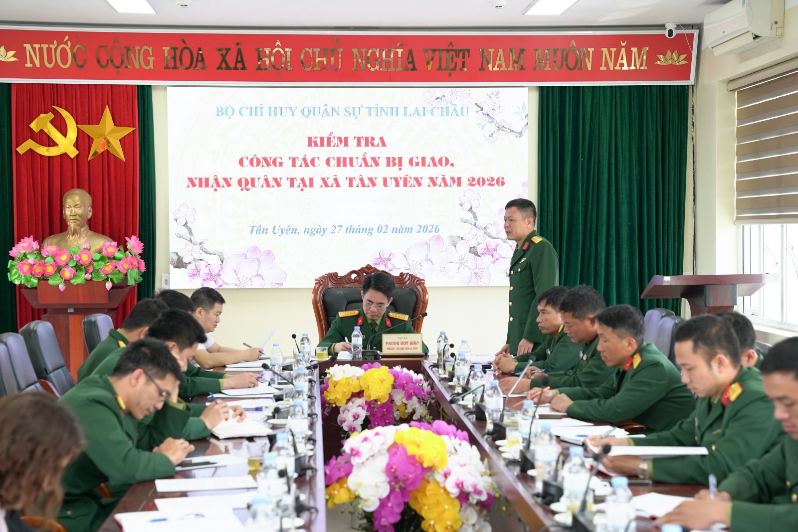 Sáng 27/2, Đoàn công tác của Bộ Chỉ huy Quân sự tỉnh, do Đại tá Phùng Duy Giáp - Phó Chỉ huy trưởng Bộ Chỉ huy Quân sự tỉnh làm Trưởng đoàn đã kiểm tra công tác chuẩn bị Lễ giao, nhận quân năm 2026 tại xã Tân Uyên. Tham gia cùng đoàn có lãnh đạo các Phòng Tham mưu, Chính trị Bộ Chỉ huy Quân sự tỉnh.