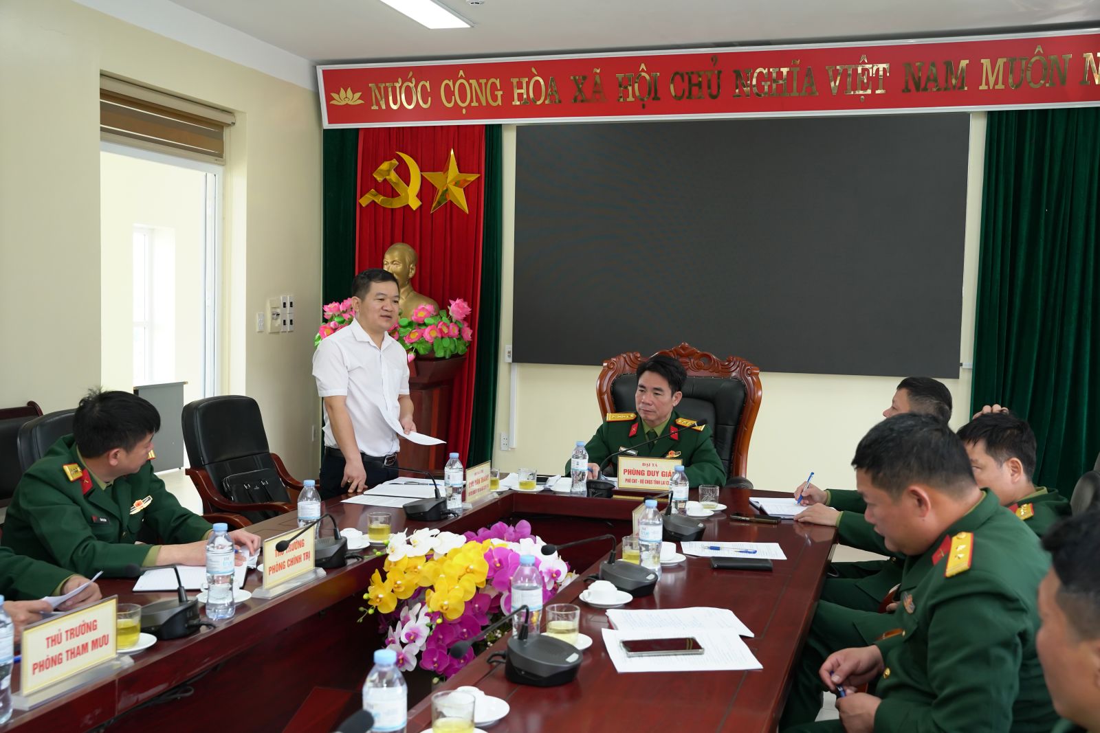 Tiếp và làm việc, có lãnh đạo Ban Chỉ huy Phòng thủ khu vực 3 – Tân Uyên. Về phía xã Tân Uyên, có đồng chí Chu Văn Thanh – Phó Bí thư, Chủ tịch UBND xã, Chủ tịch Hội đồng nghĩa vụ quân sự xã; các đồng chí là thành viên Hội đồng nghĩa vụ Quân sự xã.