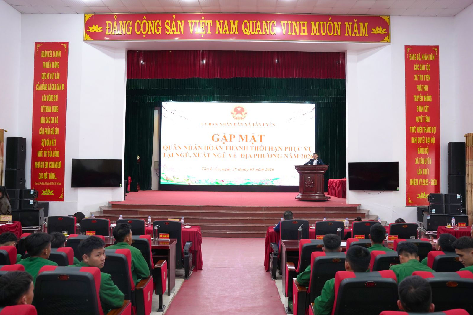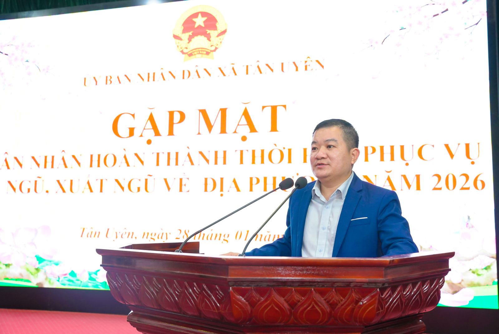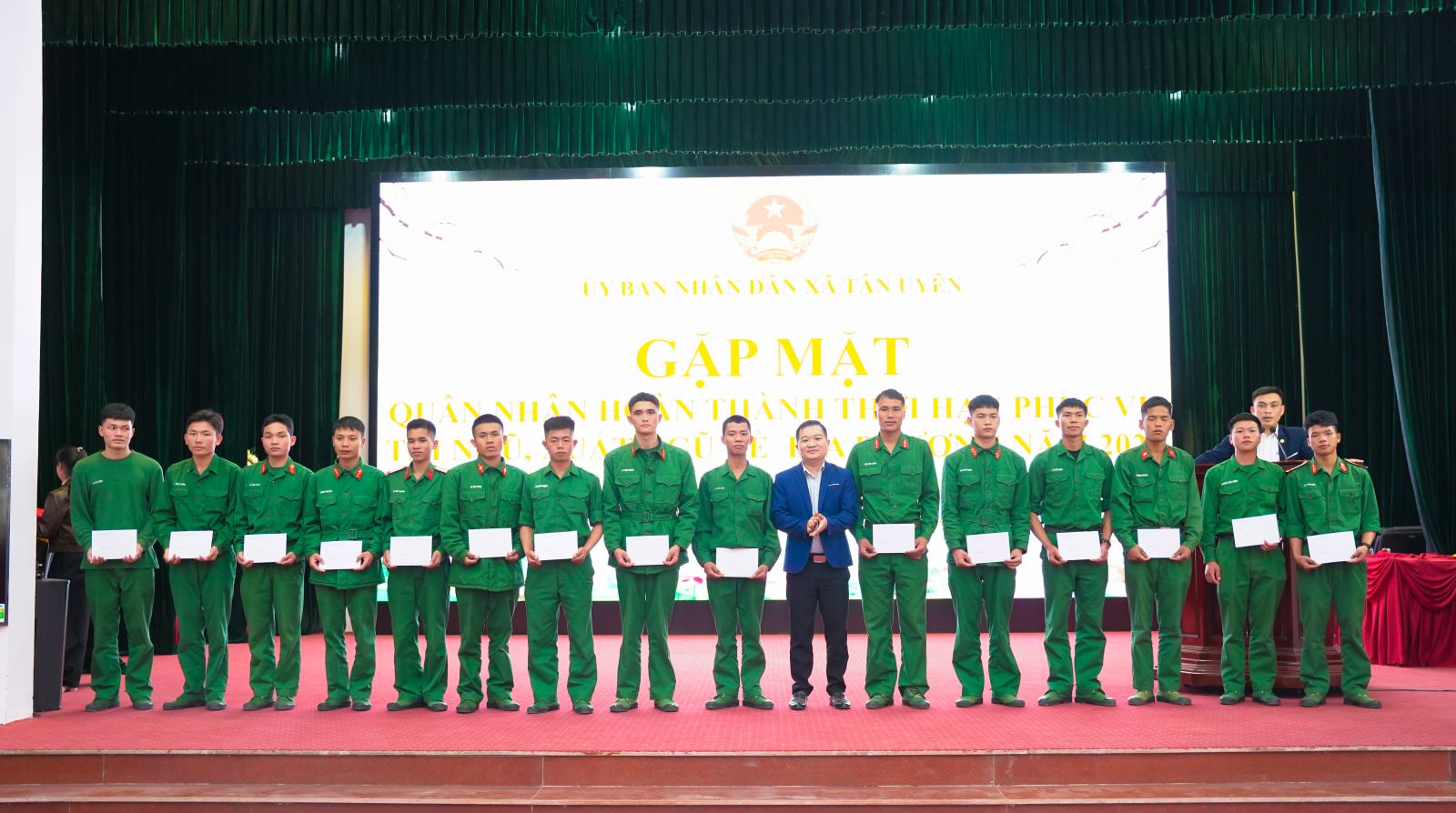 Tại buổi gặp mặt, Đồng chí Chu Văn Thanh, Phó Bí thư, Chủ tịch UBND xã đã khái quát kết quả phát triển kinh tế – xã hội của xã Tân Uyên trong thời gian qua, đồng thời mong muốn các quân nhân sau khi trở về địa phương tiếp tục phát huy truyền thống “Bộ đội Cụ Hồ”, gương mẫu chấp hành chủ trương của Đảng, chính sách, pháp luật của Nhà nước, tích cực tham gia lao động sản xuất, phát triển kinh tế gia đình, đóng góp sức trẻ vào xây dựng quê hương Tân Uyên ngày càng giàu đẹp, văn minh.