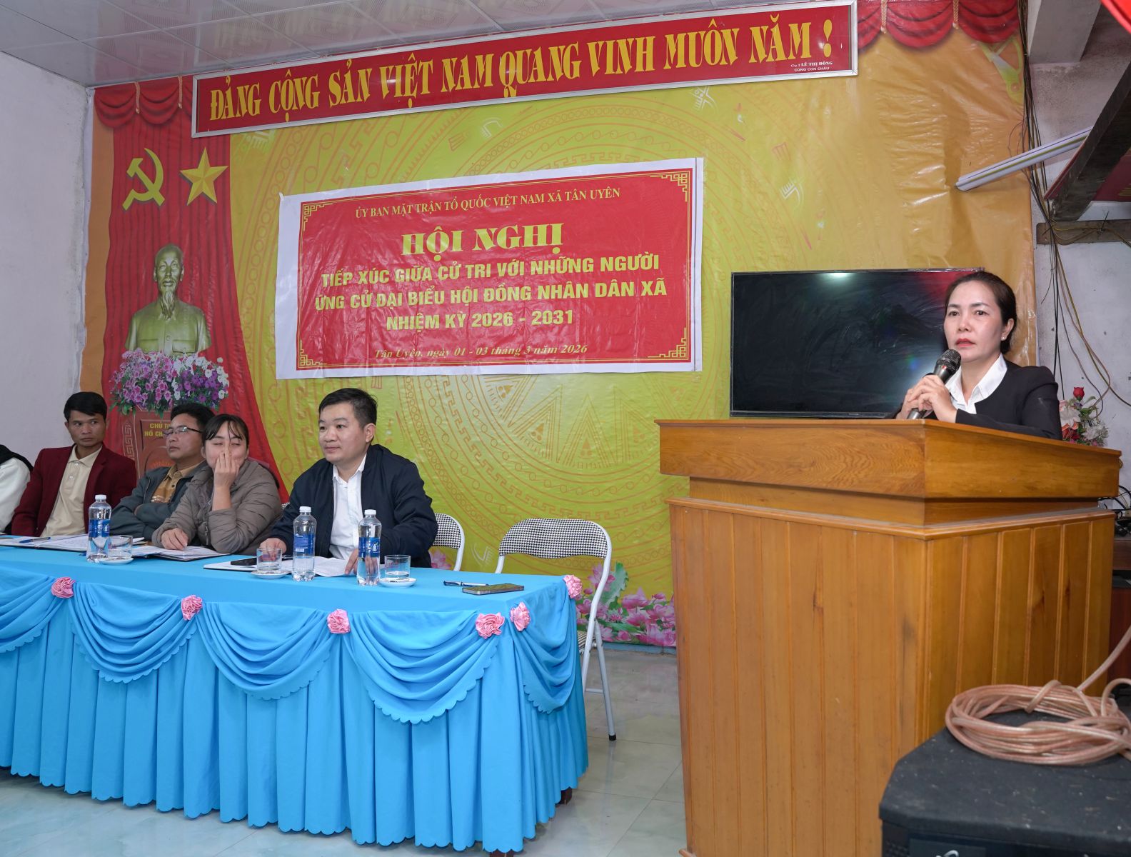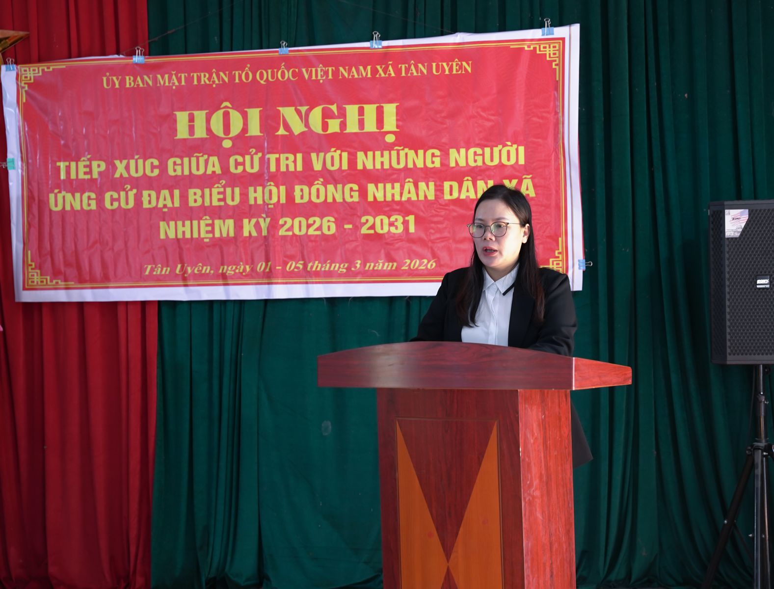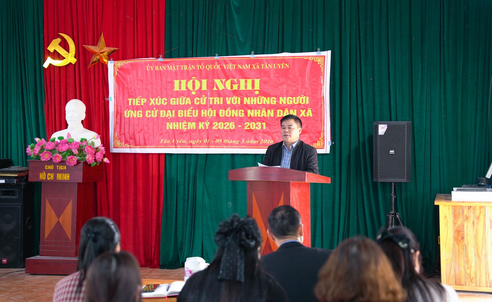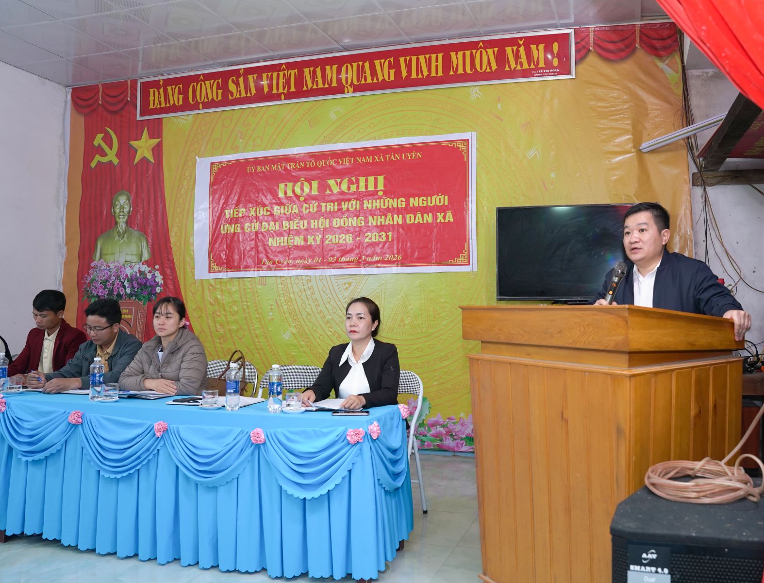 Ngày 01/3, tại Thôn Tân Dương và 17, Ban Thường trực Ủy ban Mặt trận Tổ quốc Việt Nam xã Tân Uyên, tổ chức hội nghị tiếp xúc giữa cử tri với những người ứng cử đại biểu Hội đồng nhân dân (HĐND) xã khóa II, nhiệm kỳ 2026 – 2031. Dự Hội nghị có các đồng chí Lò Văn Học – Phó Bí thư Thường trực Đảng ủy; đồng chí Chu Văn Thanh, Phó Bí thư, Chủ tịch UBND xã, người ứng cử đại biểu HĐND xã và các đồng chí ứng cử tại tổ bầu cử số 2 và số 4.