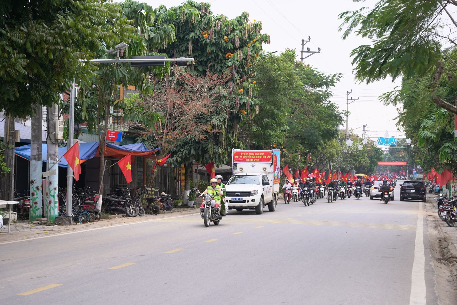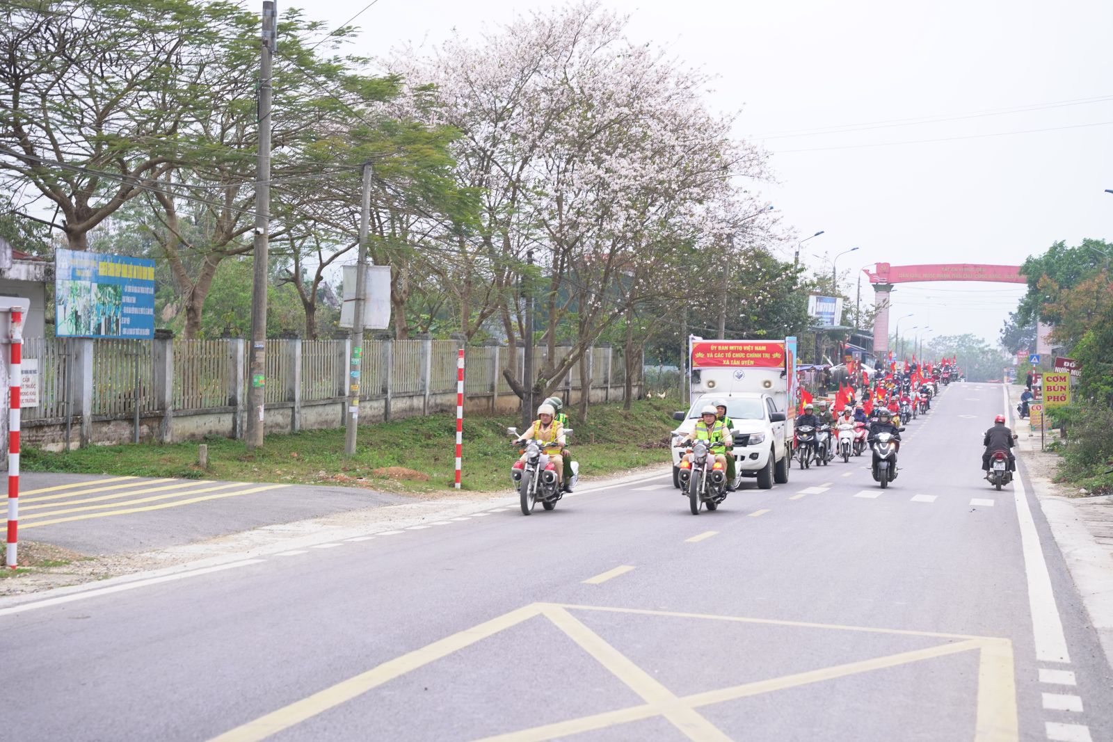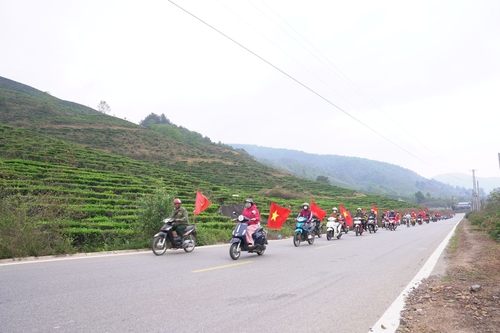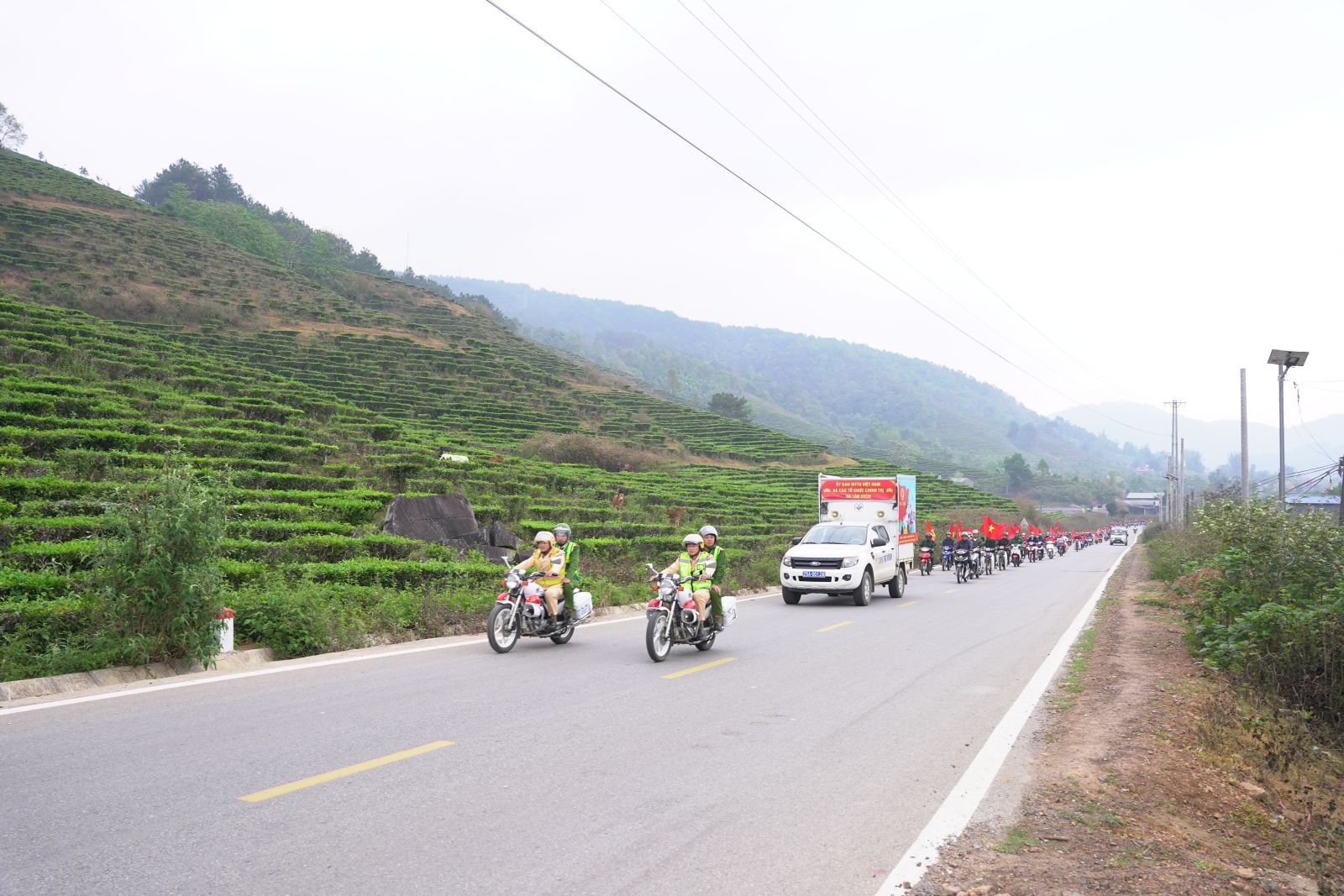 Ảnh: Đoàn cổ động diễu hành qua các trục đường chính của xã Tân Uyên