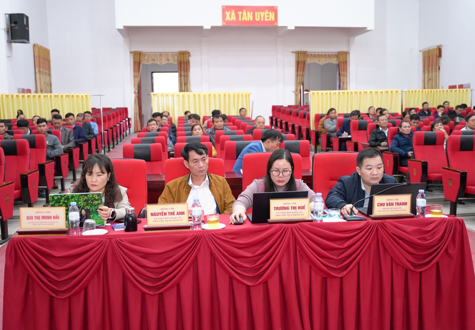 Tham dự tại điểm cầu xã Tân Uyên có các đồng chí Chu Văn Thanh – Phó Bí thư, Chủ tịch UBND xã; đồng chí Trương Thị Huế - Ủy viên Ban Thường vụ Đảng ủy, Phó Chủ tịch HĐND xã; lãnh đạo UBND – UBMTTQVN xã; các đồng chí là thành viên Ủy ban bầu cử xã.
