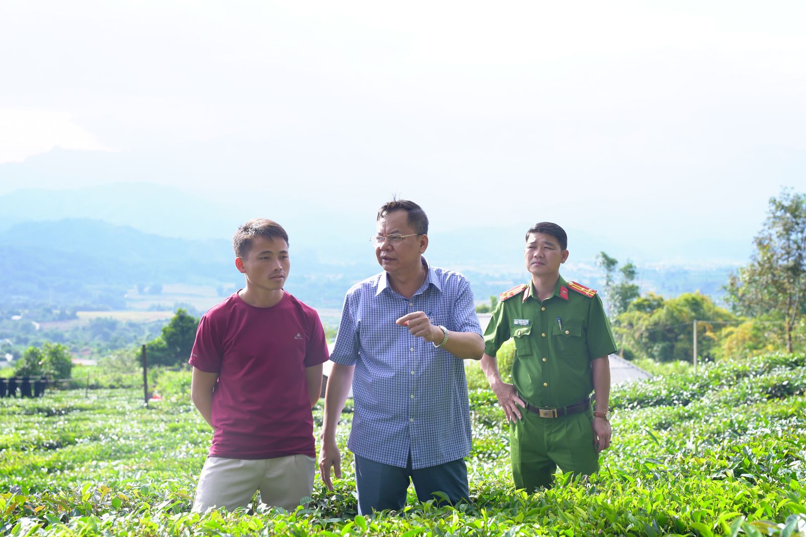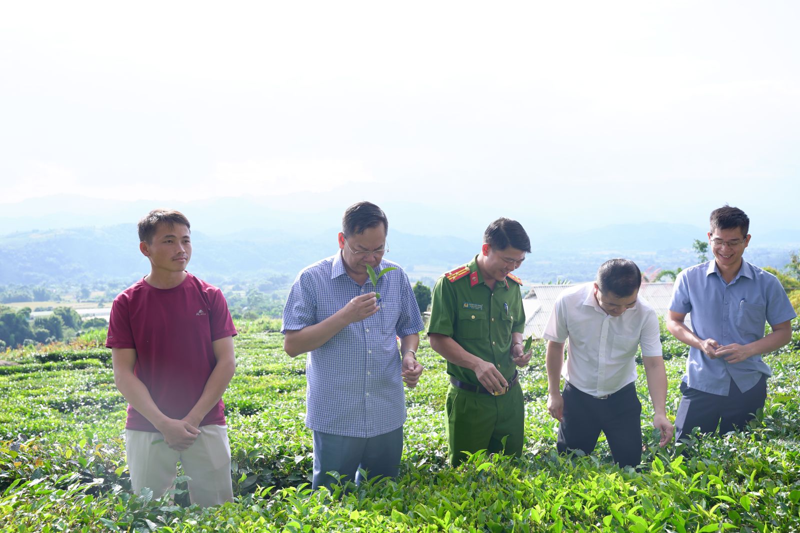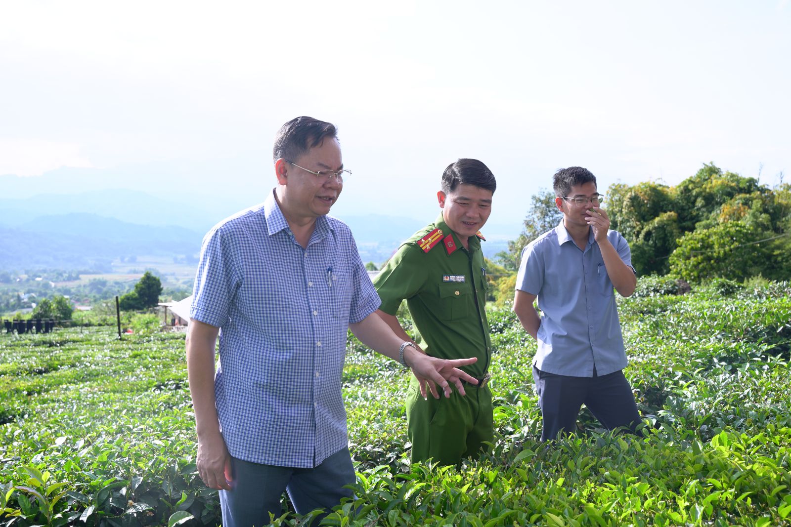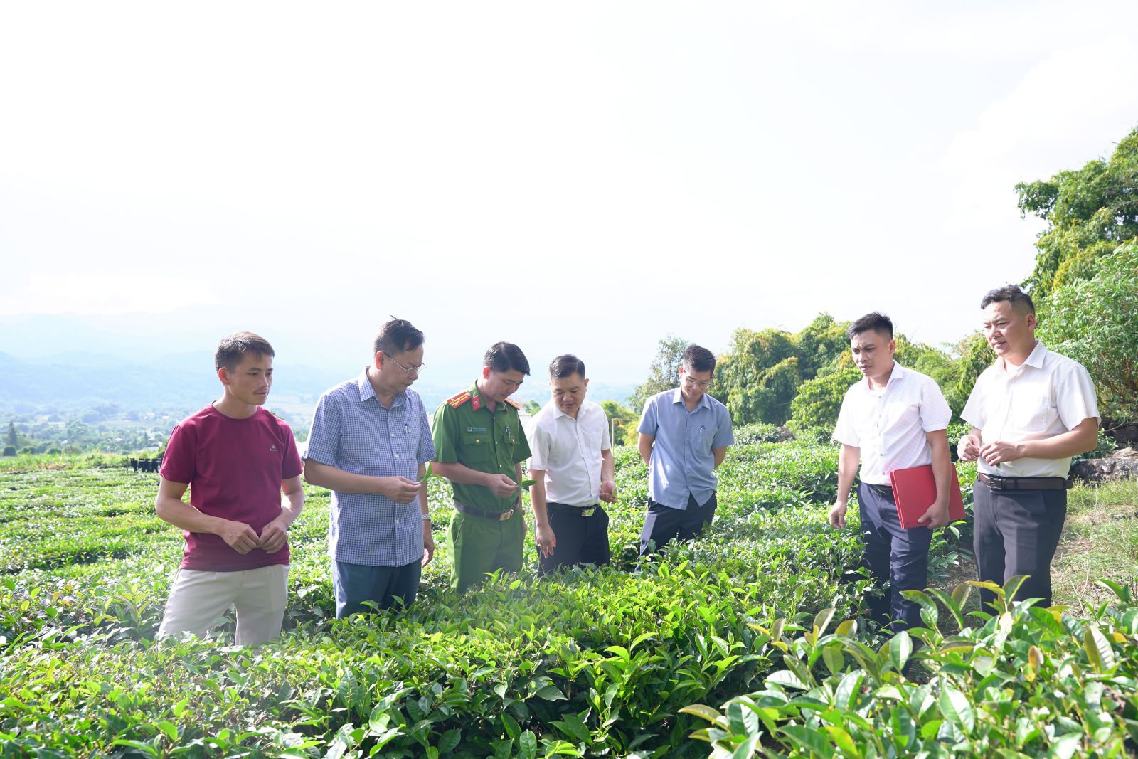 Ảnh: Đồng chí Bí thư Đảng ủy Dương Đình Đức và Đoàn công tác kiểm tra diện tích chè tại thôn Hua Cưởm 2