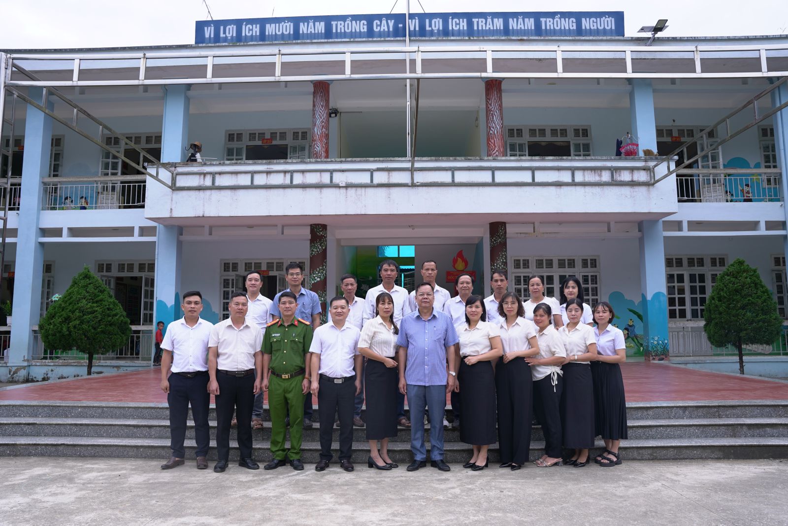 Ảnh: Đoàn công tác chụp ảnh với Ban giám hiệu, giáo viên, nhân viên Trường tiểu học Trung Đồng