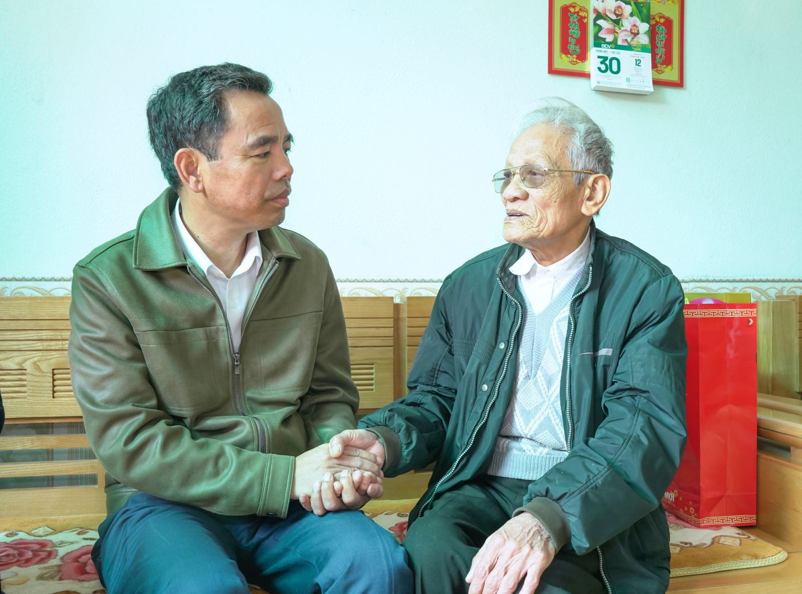 Ảnh: Bí thư Đảng ủy Nguyễn Minh Hiệu thăm, tặng quà đảng viên Phạm Trí Tường, 66 năm tuổi Đảng