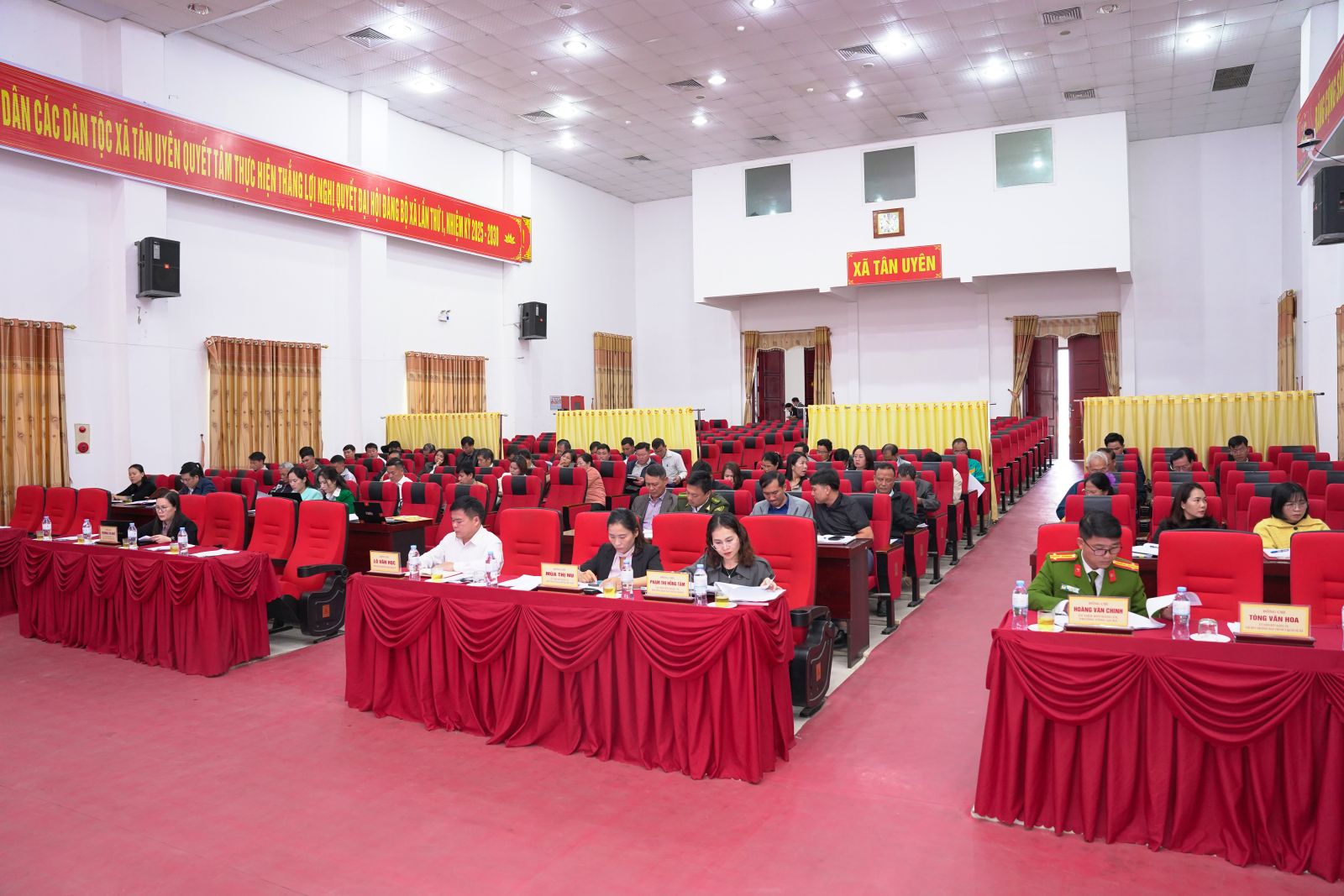 Tại Hội nghị, đã thông qua Dự thảo Quyết định giao chỉ tiêu kế hoạch phát triển kinh tế - xã hội năm 2026. Báo cáo kết quả thực hiện kế hoạch phát triển kinh tế - xã hội tháng 12 năm 2025; nhiệm vụ trọng tâm tháng 01 năm 2026. Năm 2025 là năm đầu tiên xã Tân Uyên vận hành theo mô hình chính quyền địa phương 02 cấp, được thành lập trên cơ sở sáp nhập 4 đơn vị hành chính của huyện Tân Uyên cũ. Đây là năm có ý nghĩa đặc biệt quan trọng, vừa phải kiện toàn tổ chức bộ máy, vừa phải ổn định đời sống nhân dân, vừa phải duy trì và thúc đẩy phát triển kinh tế - xã hội trong điều kiện còn nhiều khó khăn. Song dưới sự lãnh đạo của Đảng ủy, sự giám sát của HĐND, sự điều hành quyết liệt của UBND và sự đồng thuận của nhân dân, xã Tân Uyên đã đạt được nhiều kết quả tích cực; kinh tế - xã hội của xã tiếp tục phát triển ổn định. Tổng sản lượng lương thực toàn xã đạt 12.274 tấn (đạt 102% kế hoạch); diện tích chè đạt 1.500ha, sản lượng chè búp tươi ước đạt 14.360 tấn; tỷ lệ che phủ rừng đạt 49,57%. Thu ngân sách trên địa bàn ước đạt 939 triệu đồng; giá trị xuất khẩu hàng địa phương đạt 2,8 triệu USD. Toàn xã có 19 sản phẩm OCOP đạt từ 3 - 4 sao; xã đạt 15/19 tiêu chí xây dựng nông thôn mới. Các lĩnh vực văn hóa - xã hội tiếp tục được quan tâm; công tác quốc phòng - an ninh được giữ vững, trật tự an toàn xã hội bảo đảm.