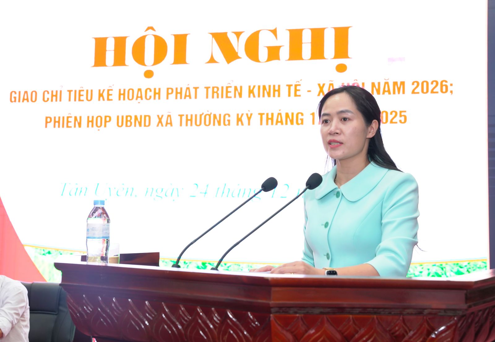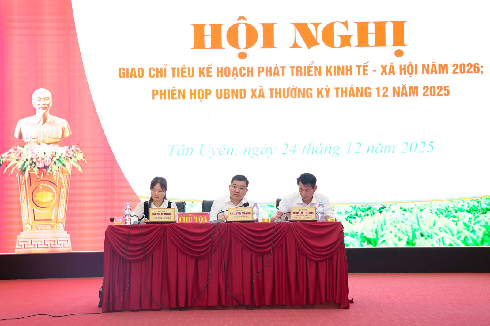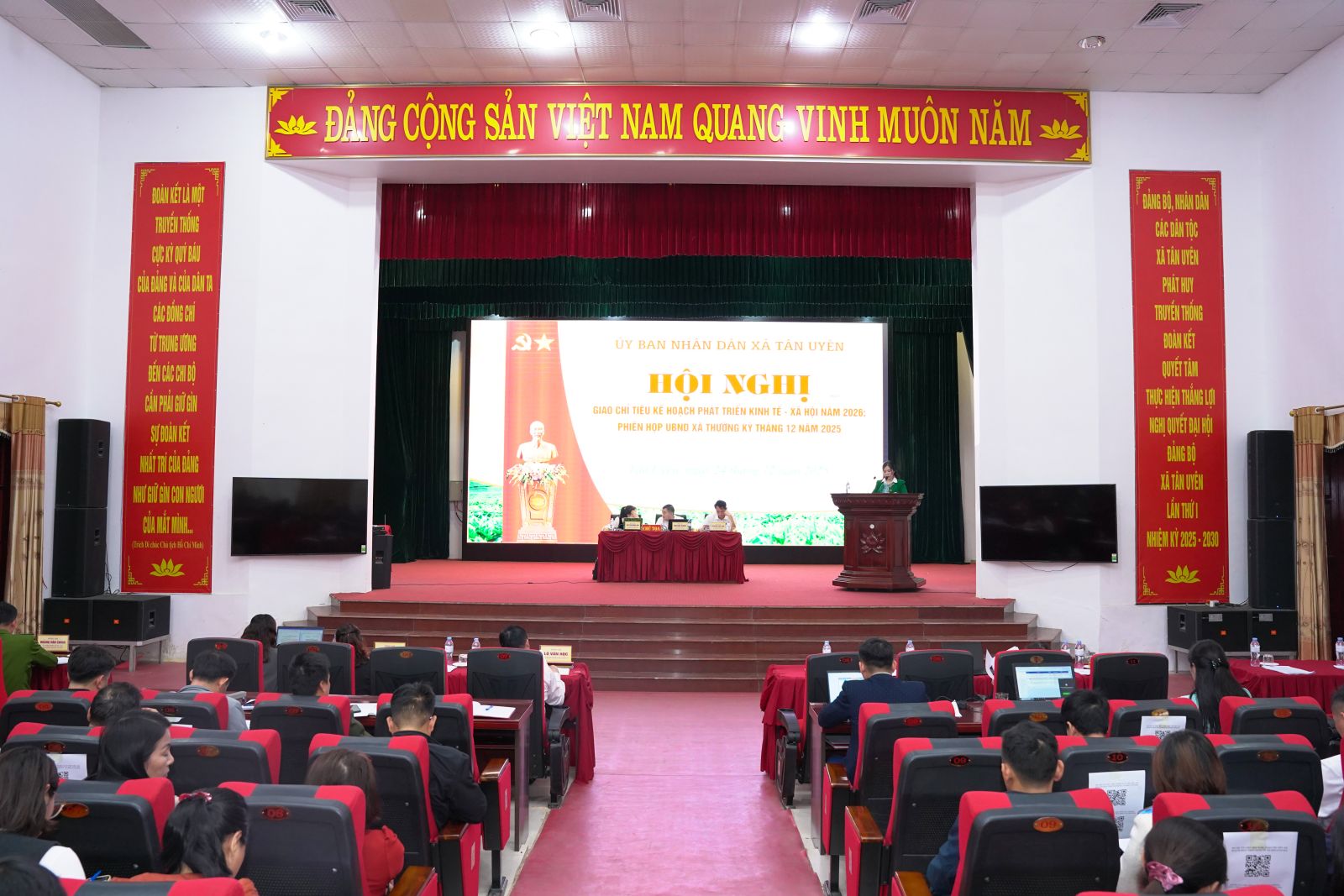 Chiều ngày 24/12, UBND xã Tân Uyên tổ chức Hội nghị giao chỉ tiêu kế hoạch phát triển kinh tế - xã hội năm 2026; phiên họp UBND xã thường kỳ tháng 12 năm 2025. Đồng chí Chu Văn Thanh – Phó Bí thư, Chủ tịch UBND xã; đồng chí Nguyễn Thế Anh - Ủy viên Ban Thường vụ, Phó Chủ tịch UBND xã; đồng chí Bùi Thị Minh Hải - Ủy viên Ban Thường vụ, Phó Chủ tịch UBND xã dự chủ trì Hội nghị. Tham dự Hội nghị có đồng chí Lò Văn Học – Phó Bí thư Thường trực Đảng ủy; đồng chí Mùa Thị Nu - Ủy viên BTV, Chủ tịch UBMTTQVN xã; đồng chí Trương Thị Huế - Ủy viên BTV, Phó Chủ tịch HĐND xã; đồng chí Phạm Thị Hồng Tâm - Ủy viên BTV, Trưởng ban Xây dựng Đảng Đảng ủy xã; đại diện lãnh đạo các ban, ngành, đoàn thể xã; lãnh đạo các cơ quan ngành dọc đóng trên địa bàn; Trưởng thôn trên địa bàn xã.