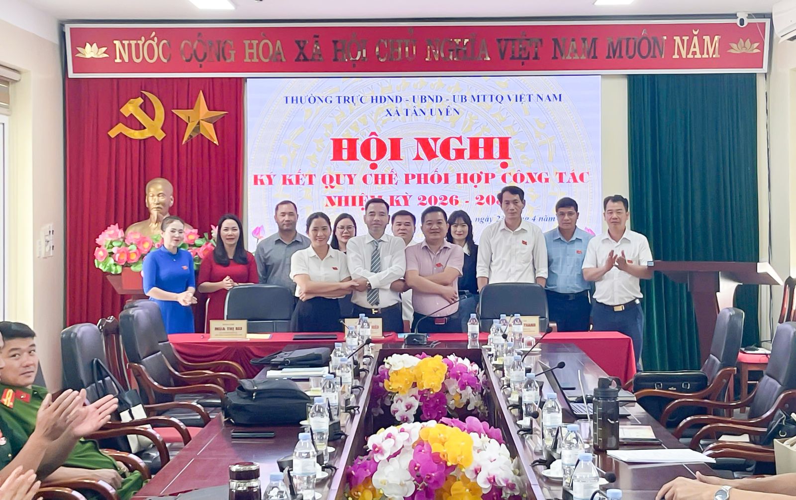 Thực hiện yêu cầu tăng cường sự phối hợp chặt chẽ giữa Hội đồng nhân dân, Ủy ban nhân dân và Ủy ban Mặt trận Tổ quốc Việt Nam xã trong thực hiện nhiệm vụ chính trị tại địa phương; nhằm phát huy vai trò, trách nhiệm của mỗi cơ quan trong hệ thống chính trị. Chiều ngày 23/4, Thường trực HĐND xã tổ chức Hội nghị ký kết Quy chế phối hợp công tác giữa HĐND – UBND – Ủy ban MTTQ Việt Nam xã. Tham dự Lễ ký kết có đồng chí Nguyễn Minh Hiệu - Ủy viên BCH Đảng bộ tỉnh, Bí thư Đảng ủy, Chủ tịch HĐND xã; đồng chí Lò Văn Học – Phó Bí thư Thường trực Đảng ủy; đồng chí Chu Văn Thanh – Phó Bí thư, Chủ tịch UBND xã; lãnh đạo Thường trực HĐND – UBND – UBMTTQVN xã; lãnh đạo các ban, ngành, đoàn thể, chính trị xã hội xã; Đại biểu HĐND xã khóa II, nhiệm kỳ 2026-2031.
