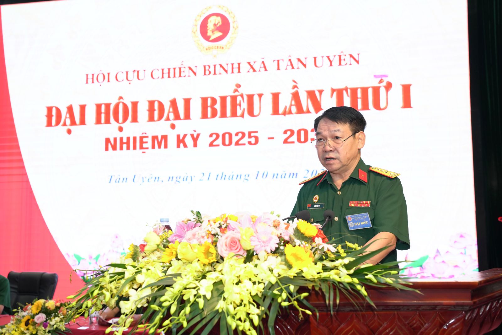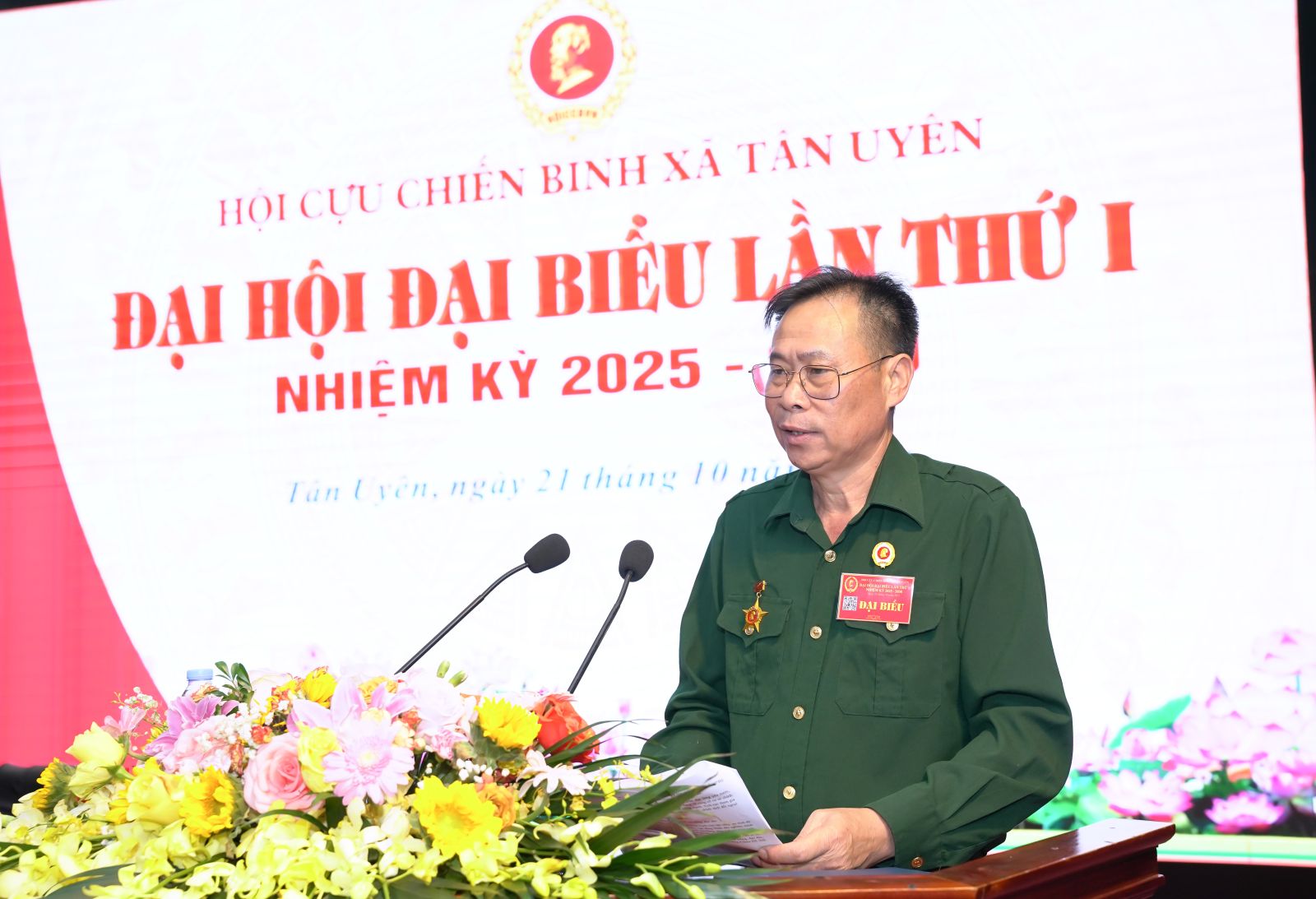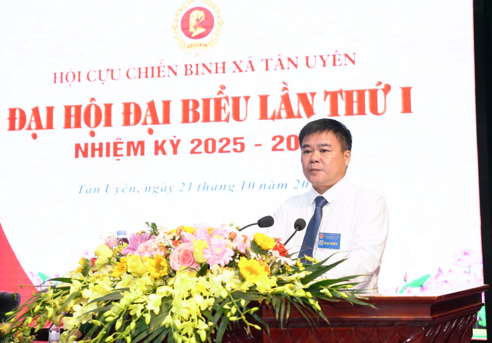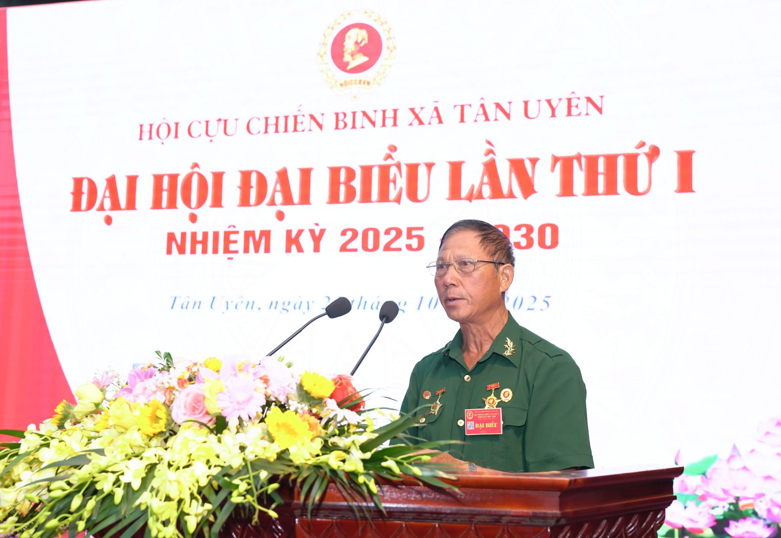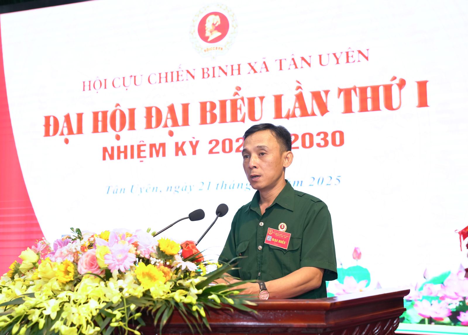 Phát biểu chỉ đạo tại Đại hội, đồng chí Đại tá Sừng Xè Po - Phó Chủ tịch Hội Cựu chiến binh tỉnh; đồng chí Lò Văn Học – Phó Bí thư Thường trực Đảng ủy biểu dương và ghi nhận những kết quả Hội cựu chiến binh xã Tân Uyên đã đạt được trong thời gian qua. Đồng thời các đồng chí đề nghị: Hội cựu chiến binh xã tiếp tục tăng cường giáo dục chính trị, tư tưởng cho hội viên. Đổi mới nội dung, phương thức hoạt động Hội, ứng dụng công nghệ và chuyển đổi số. Đẩy mạnh phong trào “Cựu chiến binh giúp nhau làm kinh tế giỏi, giảm nghèo bền vững”. Làm tốt công tác giáo dục truyền thống yêu nước, cách mạng cho thế hệ trẻ. Chăm lo, bảo vệ quyền và lợi ích hợp pháp, chính đáng của hội viên. Phát huy sức mạnh đoàn kết, xây dựng Hội thực sự là mái nhà chung của các thế hệ Cựu chiến binh.