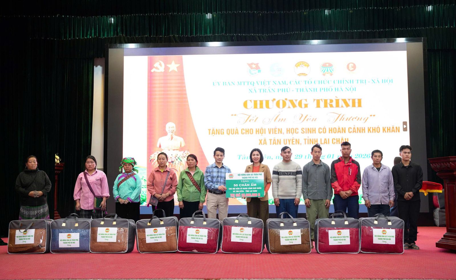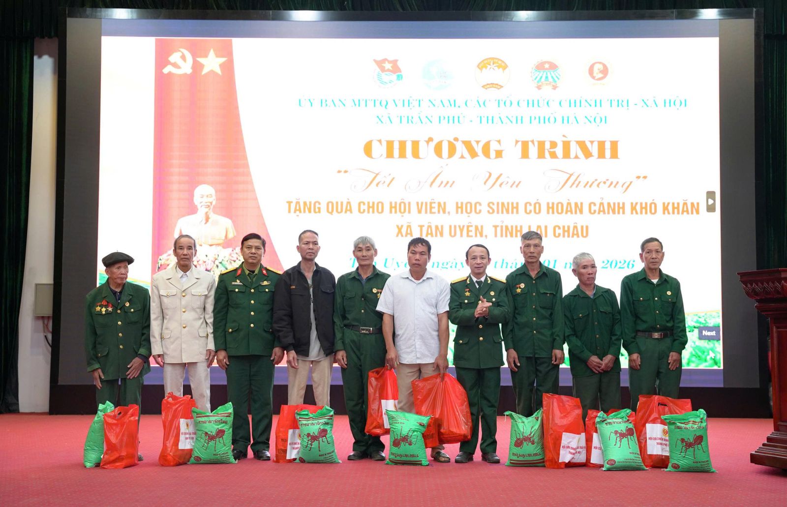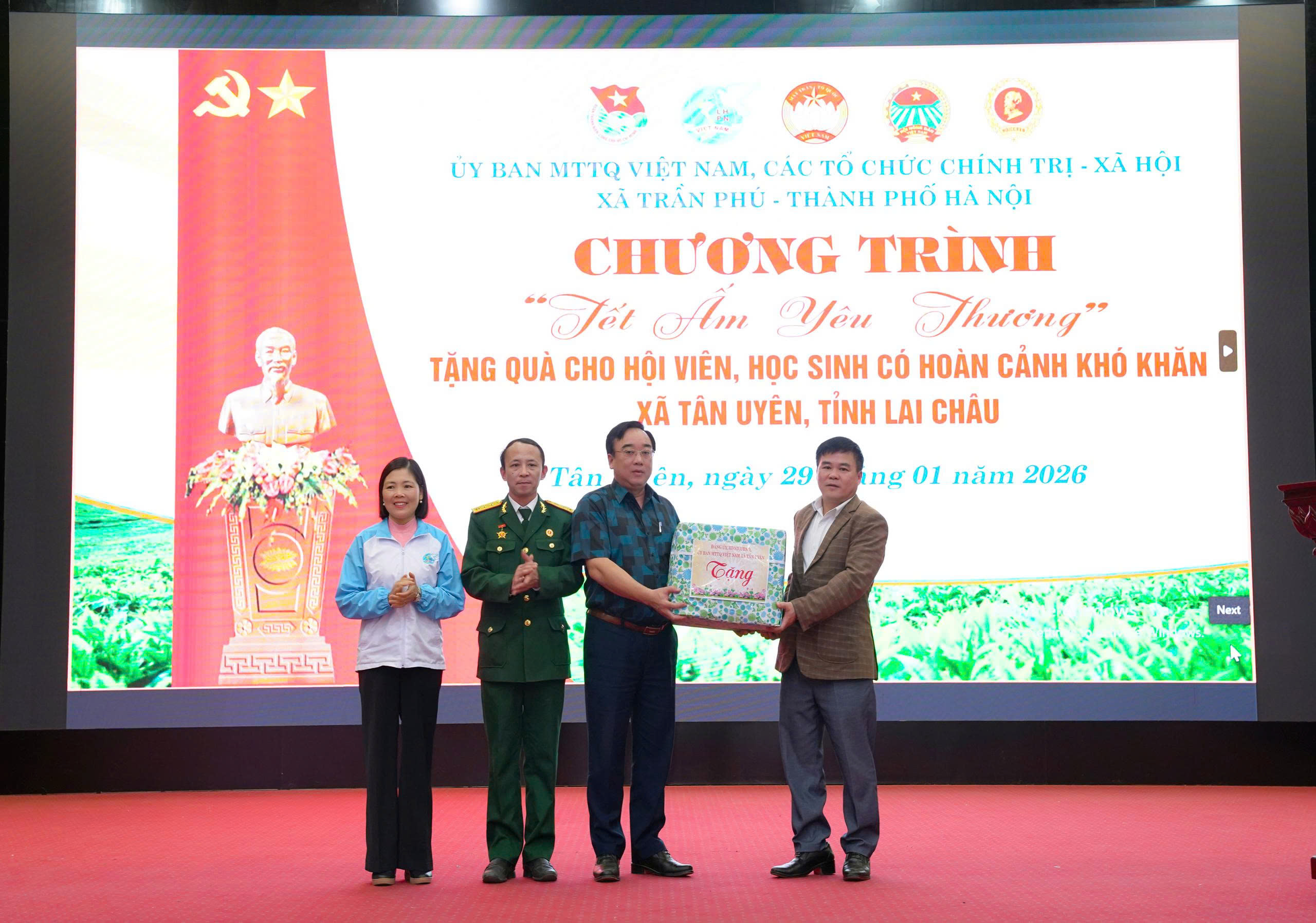 Nhằm giúp các hội viên nghèo và học sinh có hoàn cảnh khó có một cái Tết sung túc và ấm áp. Chiều ngày (29/01), tại xã Tân Uyên, Ủy ban MTTQVN xã Tân Uyên phối hợp với Ủy ban MTTQVN xã; các tổ chức chính trị - xã hội xã Trần Phú, thành phố Hà Nội tổ chức Chương trình “Tết ấm tình yêu thương”, trao quà cho hội viên và học sinh có hoàn cảnh khó khăn trên địa bàn. Tham dự Chương trình về phía xã Trần Phú, Thành phố Hà Nội có đồng chí Trần Trọng Phú - Ủy viên BTV Đảng ủy, Chủ tịch UBMTTQVN xã; các đoàn thể chính trị - xã hội xã Trần Phú, thành Phố Hà Nội. Về phía xã Tân Uyên có các đồng chí Lò Văn Học – Phó Bí thư Thường trực Đảng ủy; đồng chí Chu Văn Thanh – Phó Bí thư, Chủ tịch UBND xã; lãnh đạo Thường trực HĐND - Ủy ban MTTQVN xã; các đoàn thể chính trị - xã hội xã Tân Uyên và hội viên, học sinh được nhận quà.