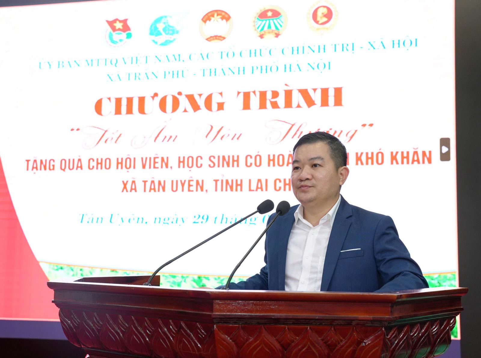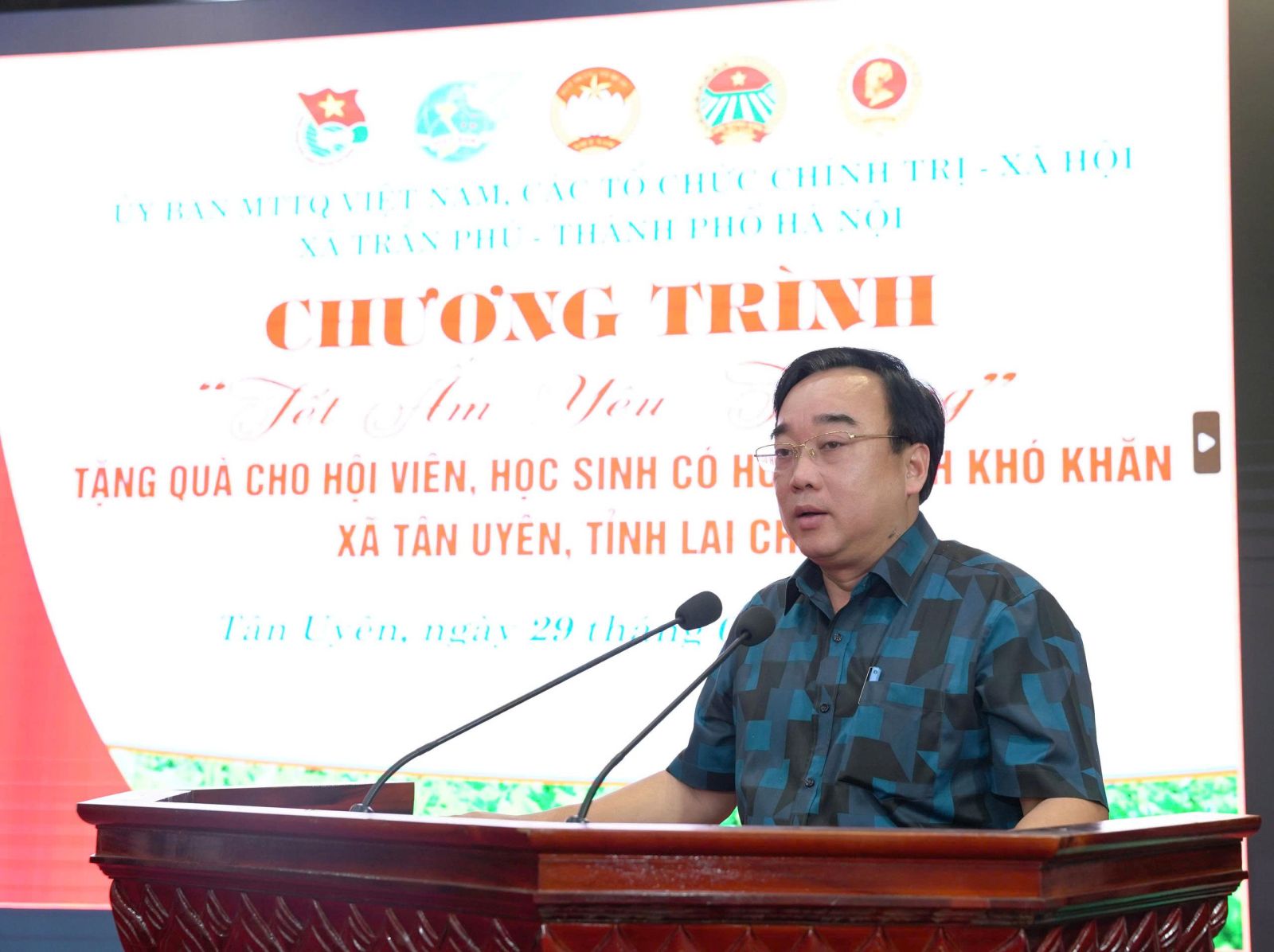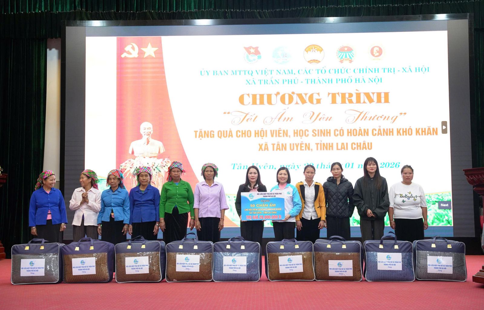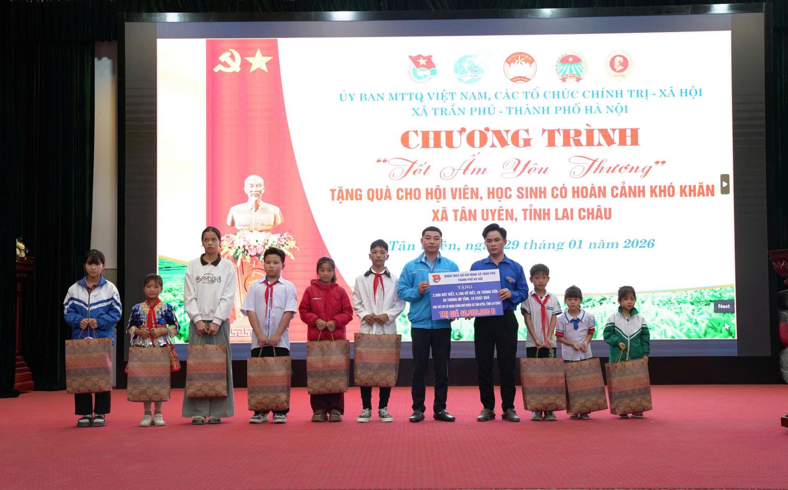Nhằm giúp các hội viên nghèo và học sinh có hoàn cảnh khó có một cái Tết sung túc và ấm áp. Chiều ngày (29/01), tại xã Tân Uyên, Ủy ban MTTQVN xã Tân Uyên phối hợp với Ủy ban MTTQVN xã; các tổ chức chính trị - xã hội xã Trần Phú, thành phố Hà Nội tổ chức Chương trình “Tết ấm tình yêu thương”, trao quà cho hội viên và học sinh có hoàn cảnh khó khăn trên địa bàn. Tham dự Chương trình về phía xã Trần Phú, Thành phố Hà Nội có đồng chí Trần Trọng Phú - Ủy viên BTV Đảng ủy, Chủ tịch UBMTTQVN xã; các đoàn thể chính trị - xã hội xã Trần Phú, thành Phố Hà Nội. Về phía xã Tân Uyên có các đồng chí Lò Văn Học – Phó Bí thư Thường trực Đảng ủy; đồng chí Chu Văn Thanh – Phó Bí thư, Chủ tịch UBND xã; lãnh đạo Thường trực HĐND - Ủy ban MTTQVN xã; các đoàn thể chính trị - xã hội xã Tân Uyên và hội viên, học sinh được nhận quà.