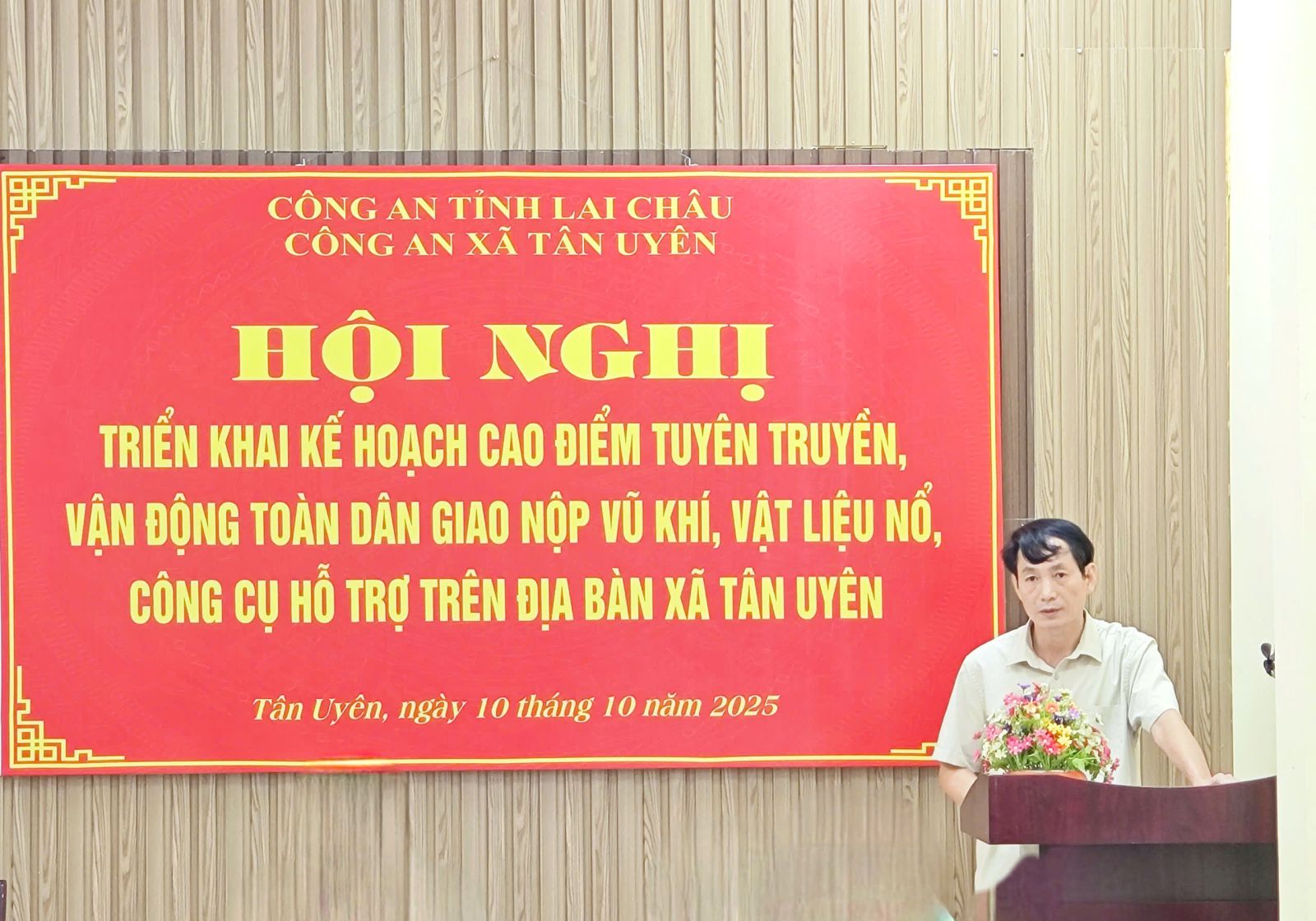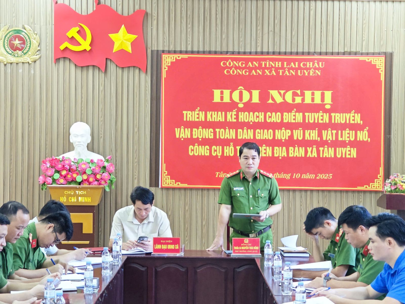 Ngày 10/10/2025, Công an xã Tân Uyên tổ chức Hội nghị triển khai đợt cao điểm tuyên truyền, vận động toàn dân giao nộp vũ khí, vật liệu nổ, công cụ hỗ trợ. Dự Hội nghị có đồng chí Nguyễn Thế Anh - Phó Chủ tịch UBND xã; thiếu tá Nguyễn Thái Đồng - Phó trưởng Công an xã; lãnh đạo Phòng Kinh tế, Bí thư Đoàn TNCSHCM xã, đại diện Tổ công tác tại Công an xã Tân Uyên, tập thể lãnh đạo, cán bộ Công an xã, lực lượng tham gia bảo vệ ANTT tại cơ sở.