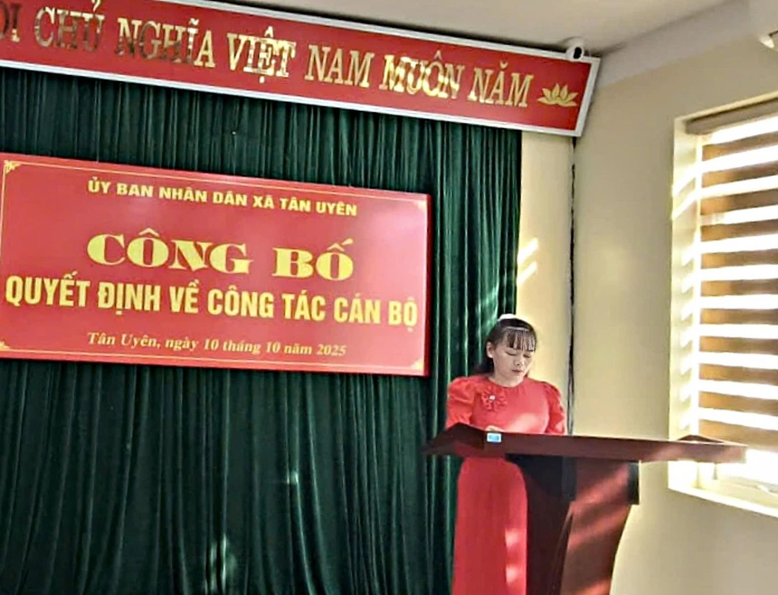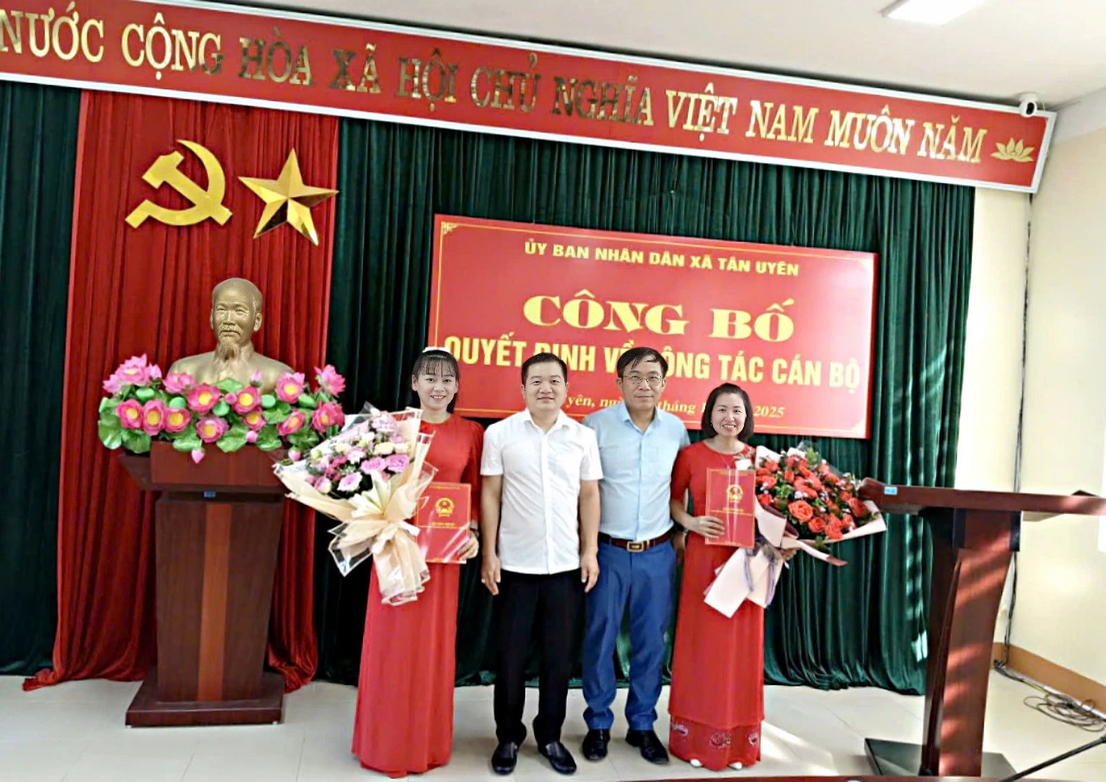 Tại buổi công bố lãnh đạo Văn phòng UBND xã đã công bố các quyết định số 584, 588 về việc bổ nhiệm lại đối với bà Trần Thị Thoa - Phó Hiệu trưởng Trường Mầm non Thân Thuộc và bà Trương Lệ Thanh - Phó Hiệu trưởng Trường Mầm non Nậm Cần, quyết định có thời hạn 5 năm kể từ ngày 01/10/2025. Đồng chí Chu Văn Thanh - Phó Bí thư, Chủ tịch UBND xã đã trao Quyết định và chúc mừng các đồng chí được bổ nhiệm lại đồng thời biểu dương những nỗ lực, đóng góp của 2 đồng chí được bổ nhiệm lại trong công tác quản lý, điều hành nhà trường thời gian qua. Đồng thời bày tỏ mong muốn trong thời gian tới, đồng chí sẽ tiếp tục phát huy năng lực, tinh thần trách nhiệm, đoàn kết cùng tập thể cán bộ, giáo viên và nhân viên nhà trường, hoàn thành tốt nhiệm vụ được giao, góp phần nâng cao chất lượng giáo dục trên địa bàn xã Tân Uyên.
