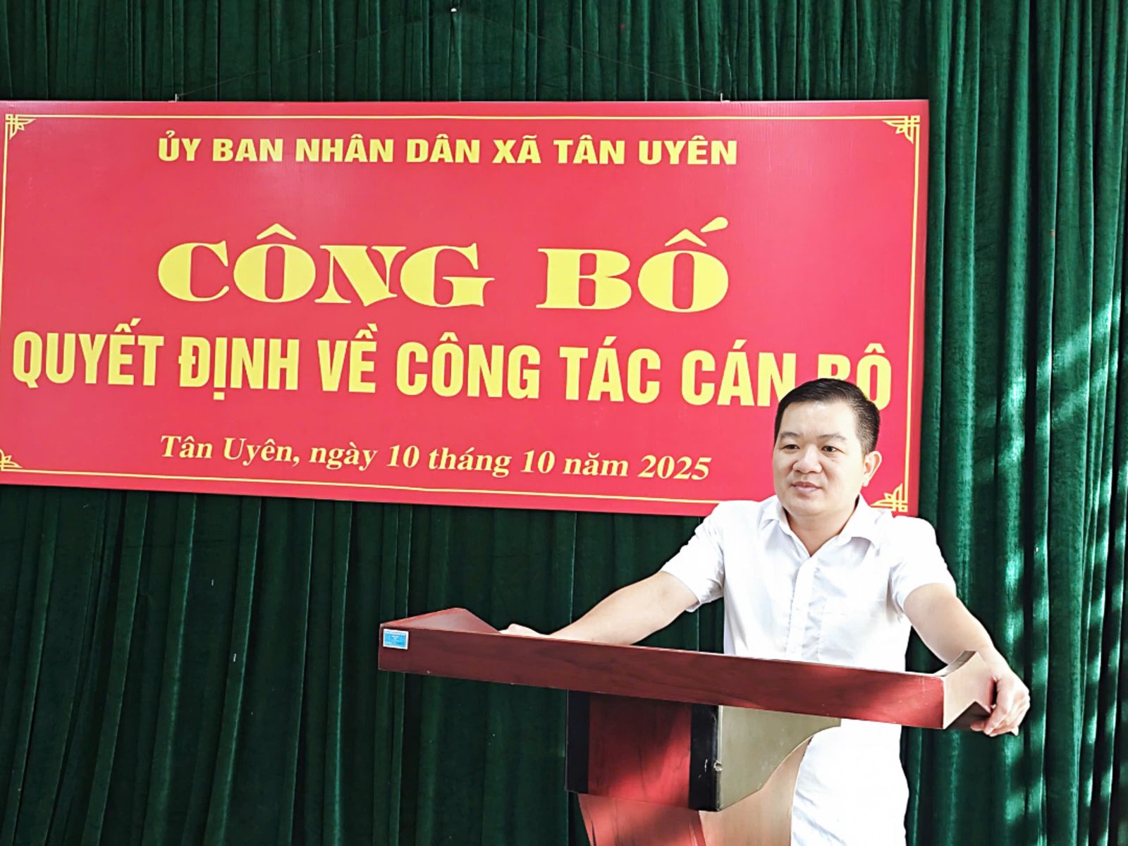 Ngày 10/10/2025, UBND xã Tân Uyên tổ chức công bố quyết định về công tác cán bộ. Dự lễ công bố có đồng chí Chu Văn Thanh - Phó Bí thư, Chủ tịch UBND xã; đại diện lãnh đạo Văn phòng UBND, phòng Văn hóa - Xã hội xã, cùng toàn thể giáo viên nhân viên 2 Trường Mầm non Nậm cần, Mầm non Thân Thuộc.