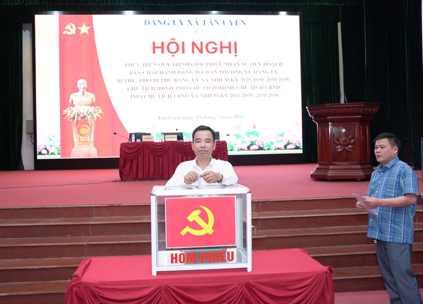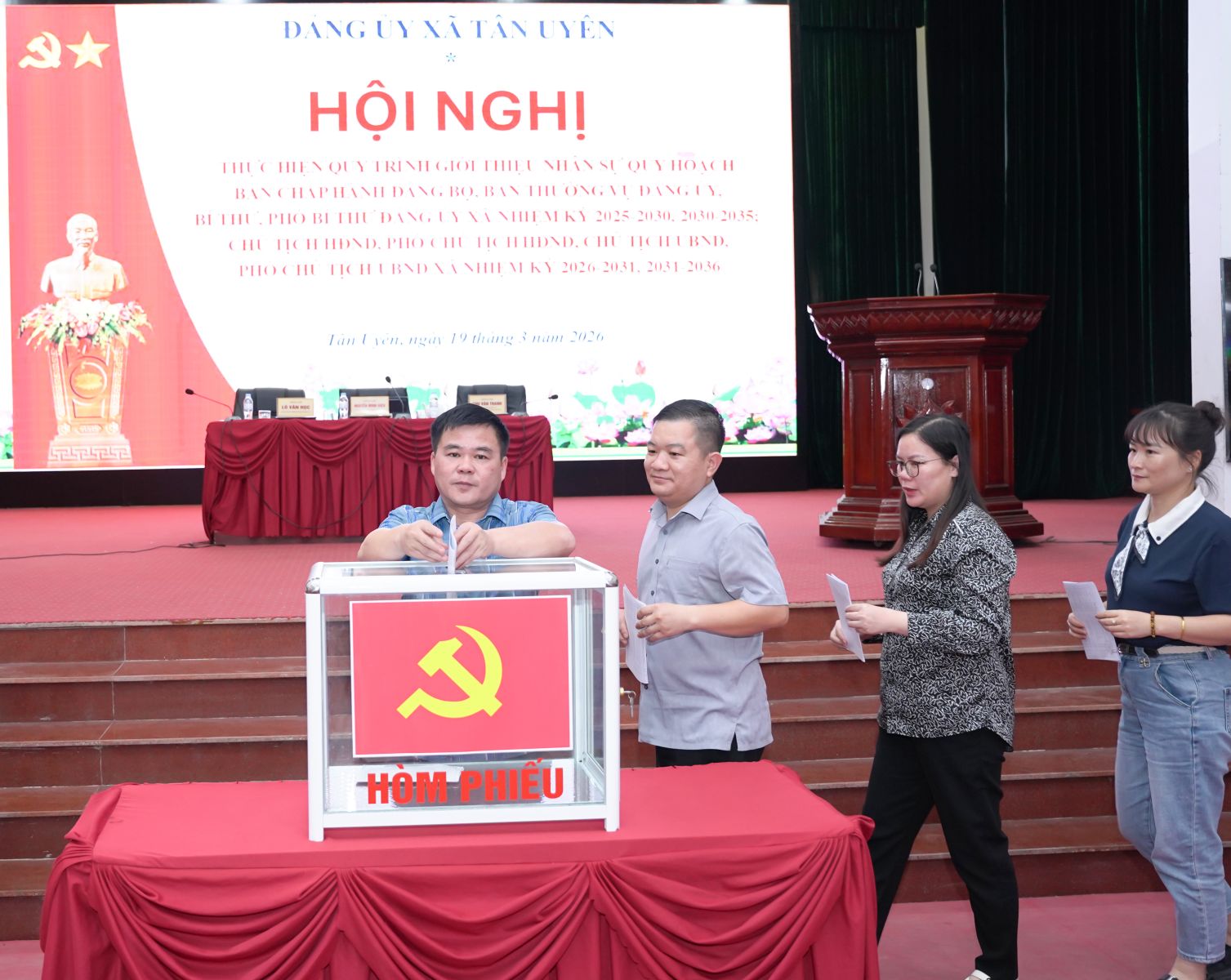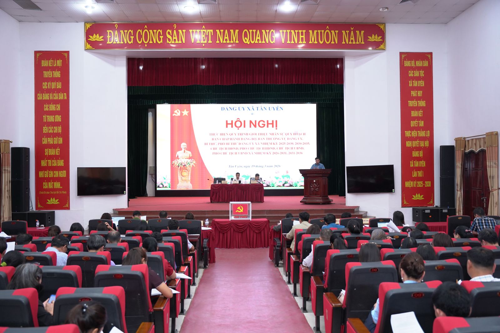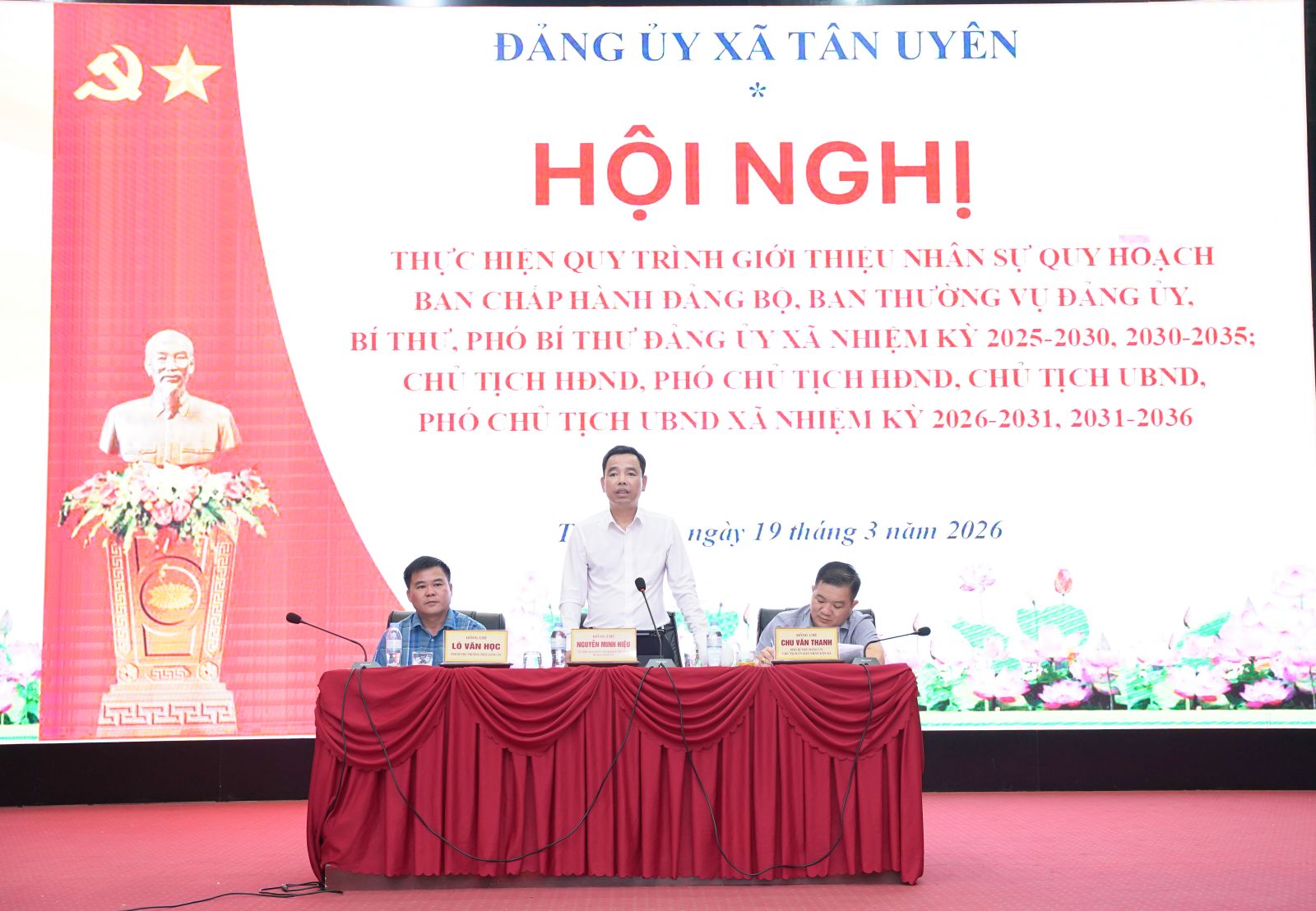 Chiều ngày 19/3/2026, Đảng ủy xã Tân Uyên tổ chức hội nghị hiện quy trình quy hoạch các chức danh lãnh đạo nhiệm kỳ 2025-2030, 2026-2031. Đồng chí Nguyễn Minh Hiệu - Ủy viên Ban Chấp hành Đảng bộ tỉnh, Bí thư Đảng ủy; đồng chí Lò Văn Học – Phó Bí thư Thường trực Đảng ủy; đồng chí Chu Văn Thanh – Phó Bí thư, Chủ tịch UBND xã dự chủ trì hội nghị.