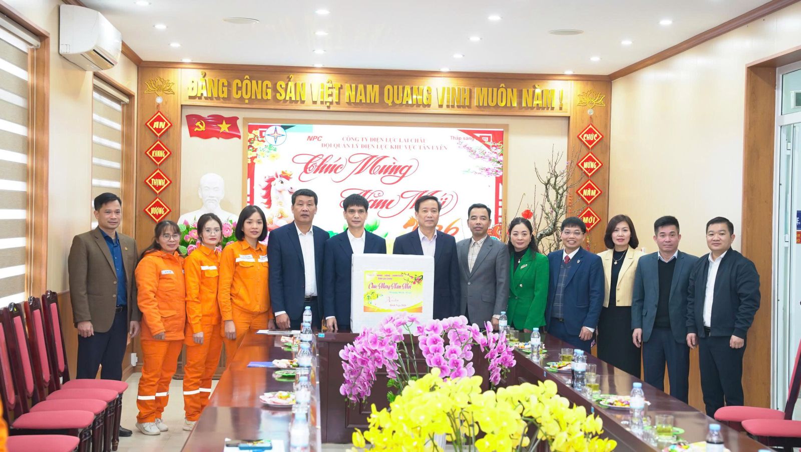 Ảnh: Đồng chí Lê Đức Dục - Trưởng Ban Tuyên giáo và Dân vận Tỉnh ủy, lãnh đạo các Sở, ban, ngành tỉnh, xã Tân Uyên trao quà cho Đội Quản lý Điện lực khu vực Tân Uyên