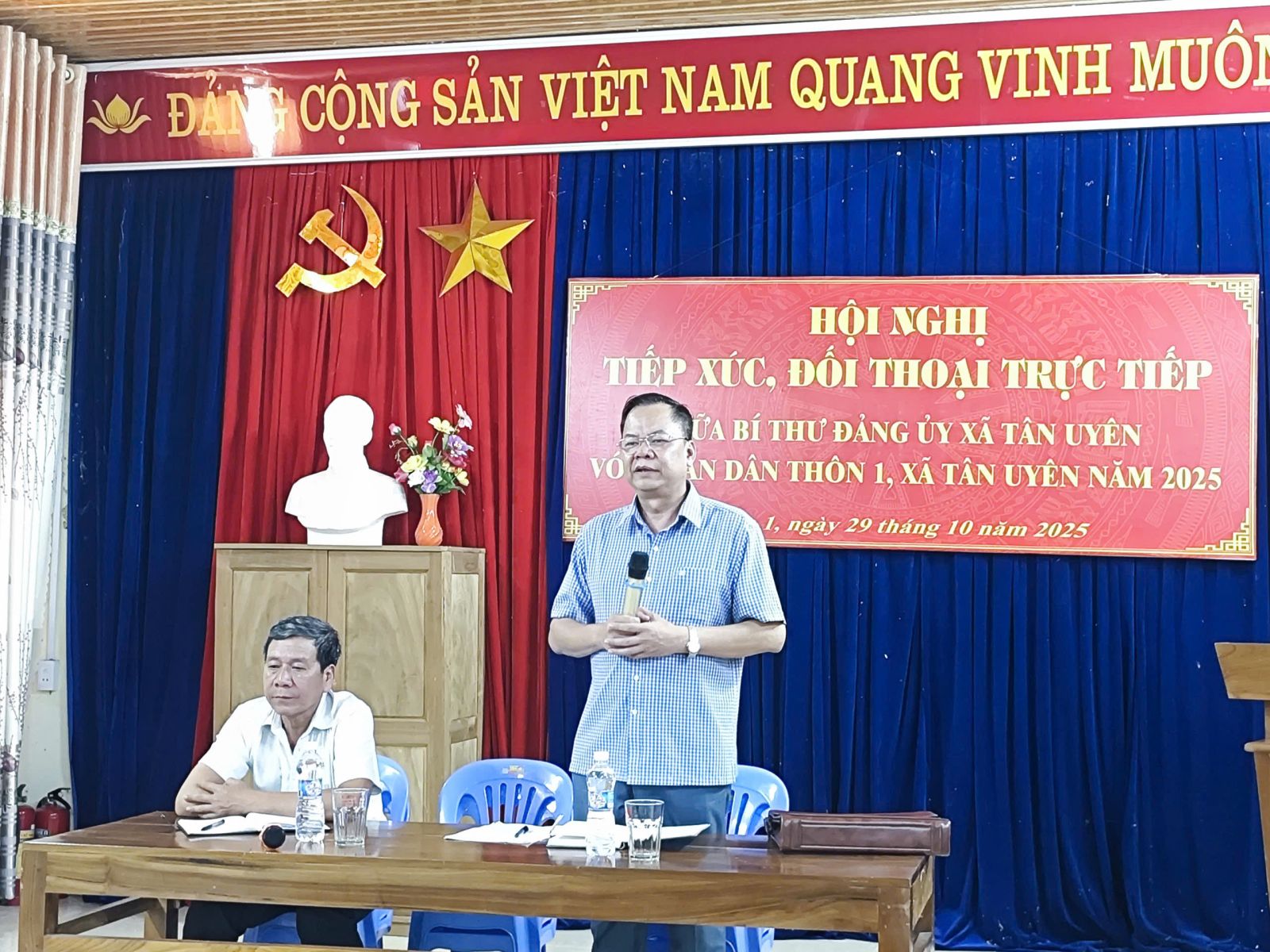 Ngày 29/10/2025, tại Nhà văn hóa thôn 1, đồng chí Dương Đình Đức - Ủy viên Ban Chấp hành Đảng bộ tỉnh, Bí thư Đảng ủy, Chủ tịch HĐND xã Tân Uyên có buổi tiếp xúc, đối thoại trực tiếp giữa với Nhân dân thôn 1. Dự hội nghị có đồng chí Chu Văn Thanh - Phó Bí thư, Chủ tịch UBND xã, đại diện lãnh đạo Ủy ban MTTQ xã, các ban, ngành, đoàn thể cùng đông đảo cán bộ, đảng viên và Nhân dân thôn 1.
