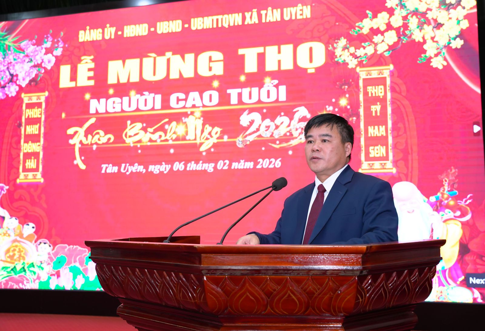 Phát biểu tại buổi Lễ, đồng chí Lò Văn Học – Phó Bí thư Thường trực Đang ủy chúc các cụ luôn dồi dào sức khỏe, tinh thần minh mẫn, sống vui, sống khỏe, sống có ích; tiếp tục là tấm gương sáng để con cháu noi theo, là điểm tựa tinh thần vững chắc cho gia đình và xã hội. Đồng chí Phó Bí thư Thường trực nhấn mạnh; trong những năm qua, cấp ủy, chính quyền xã Tân Uyên luôn quan tâm lãnh đạo, chỉ đạo và triển khai thực hiện đầy đủ, kịp thời các chế độ, chính sách của Đảng và Nhà nước đối với Người cao tuổi; chú trọng công tác chăm sóc sức khỏe, đời sống vật chất và tinh thần; tạo điều kiện để Người cao tuổi được tham gia các hoạt động xã hội, phát huy trí tuệ, kinh nghiệm quý báu trong xây dựng địa phương. Đồng thời đề nghị. UBND xã Tân Uyên sẽ tiếp tục phối hợp chặt chẽ với Ủy ban MTTQ Việt Nam xã, các đoàn thể và các thôn, bản để thực hiện tốt hơn nữa công tác chăm sóc, phụng dưỡng và phát huy vai trò Người cao tuổi; kịp thời động viên, thăm hỏi các cụ có hoàn cảnh khó khăn; xây dựng môi trường sống thân thiện, nghĩa tình, để Người cao tuổi luôn được quan tâm, tôn trọng và yêu thương.