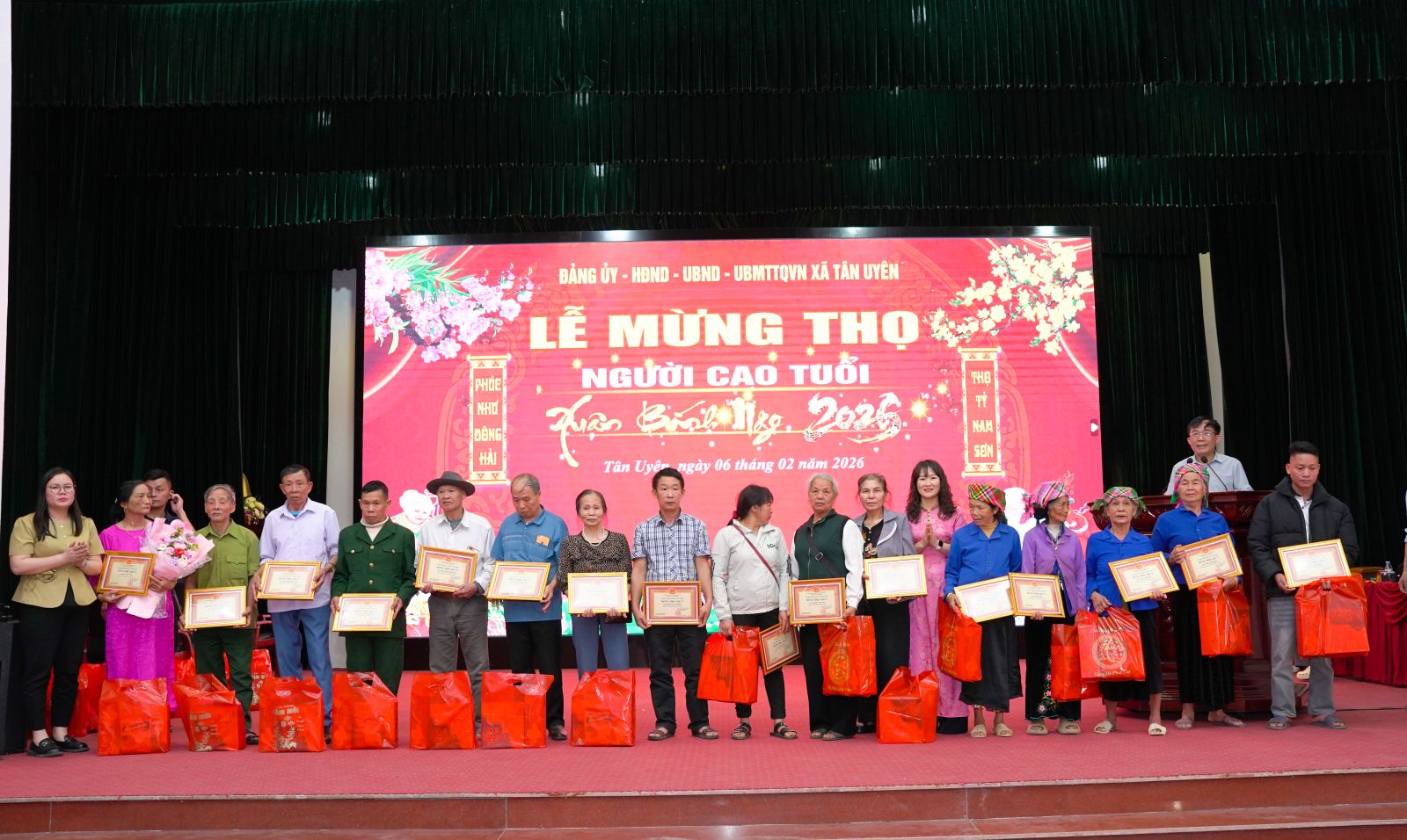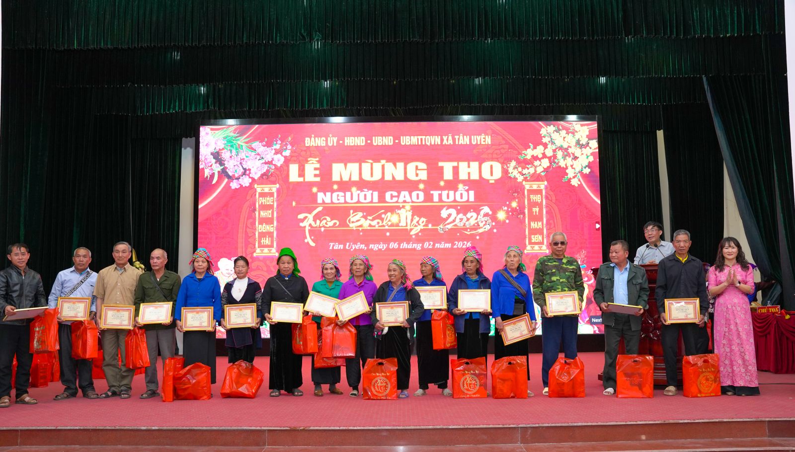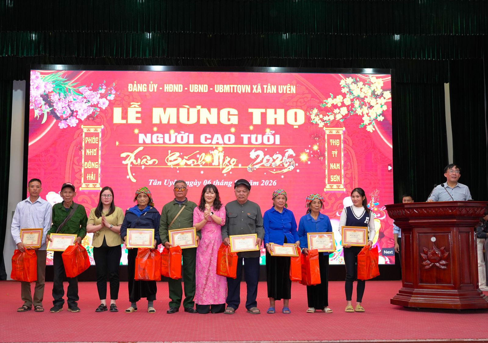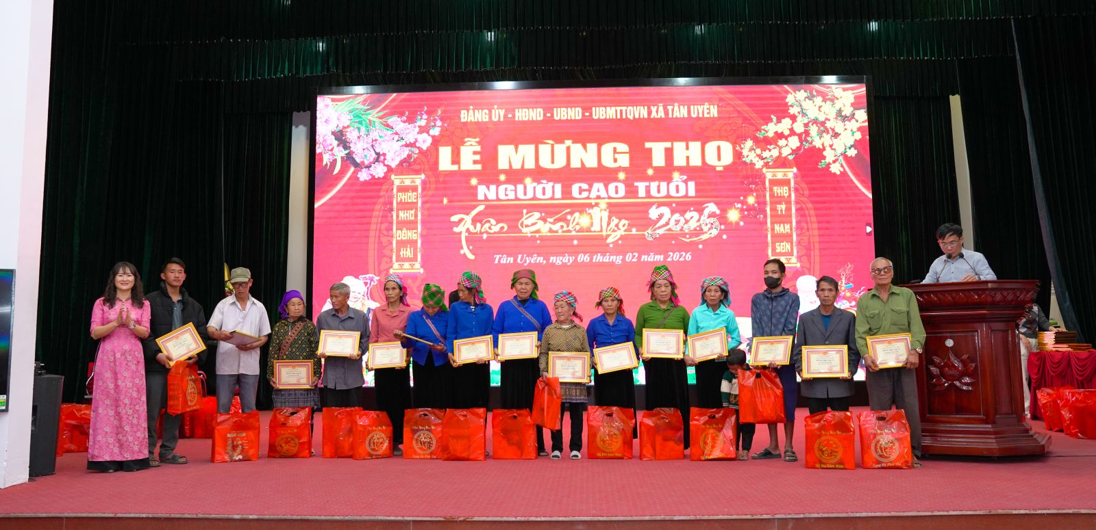 Trong không khí vui tươi, phấn khởi của những ngày đầu Xuân mới – Tết Nguyên đán Bính Ngọ năm 2026. Chiều ngày (6/02) Đảng ủy, HĐND, UBND, Ủy ban MTTQ Việt Nam xã Tân Uyên tổ chức buổi Lễ Chúc thọ, Mừng thọ cho 213 cụ Người cao tuổi trên địa bàn xã. Dự buổi Lễ có đồng chí đồng chí Lò Văn Học – Phó Bí thư Thường trực Đảng ủy; đồng chí Trương Thị Huế - Ủy viên BTV, Phó Chủ tịch HĐND xã; đồng chí Bùi Thị Minh Hải - Ủy viên BTV, Phó Chủ tịch UBND xã; lãnh đạo các ban, ngành, đoàn thể chính trị - xã hội.