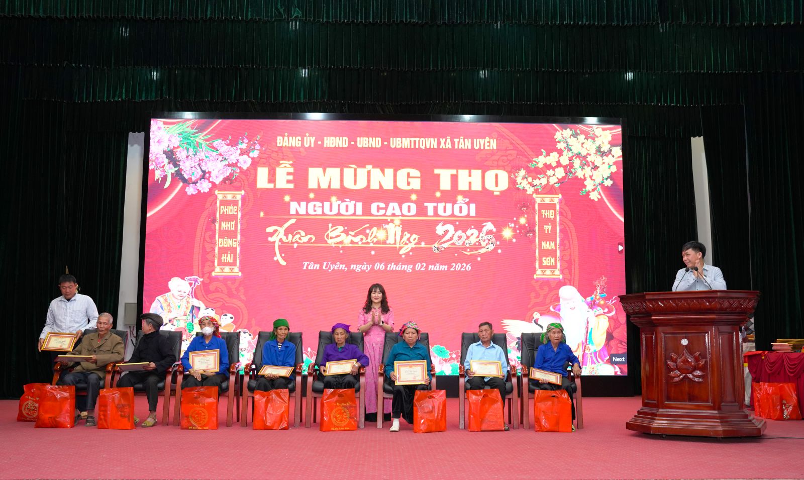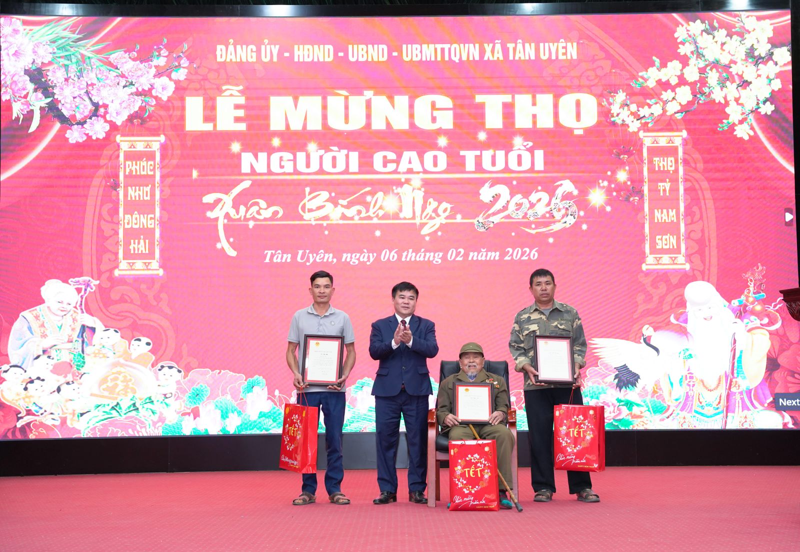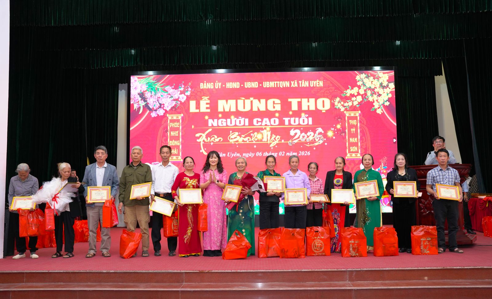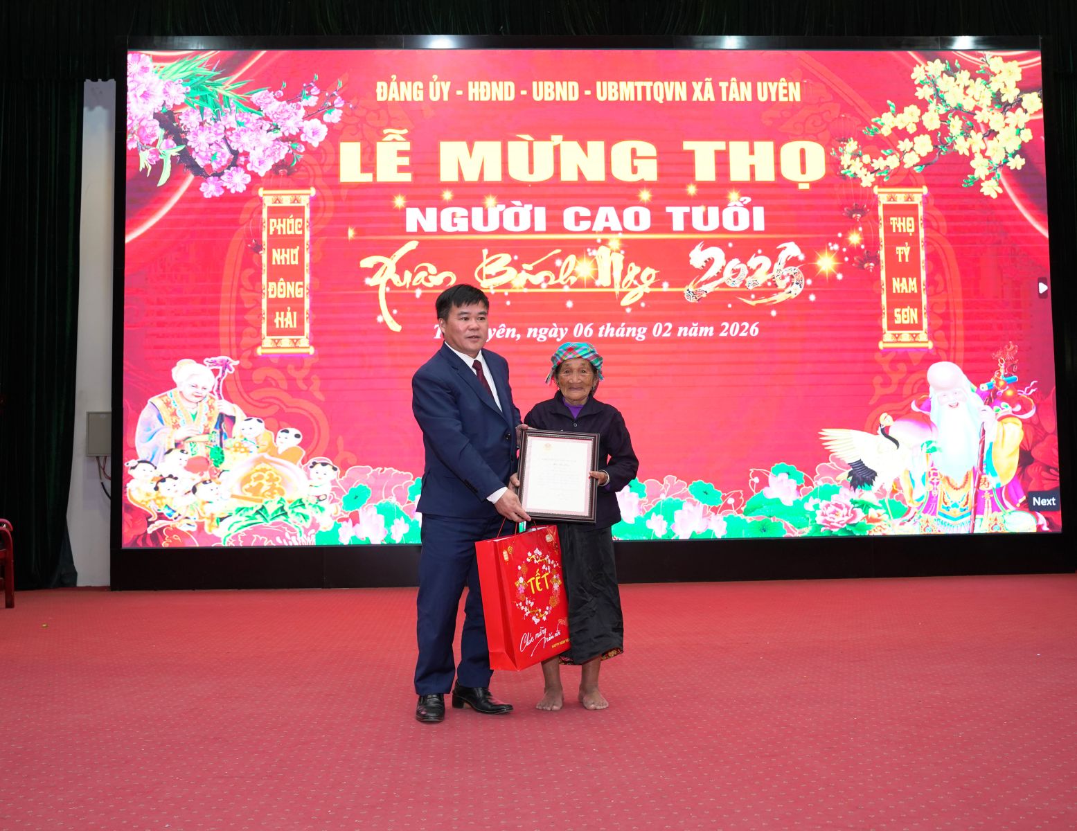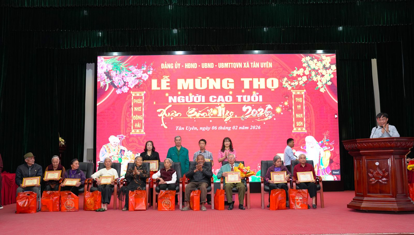 Trong không khí vui tươi, phấn khởi của những ngày đầu Xuân mới – Tết Nguyên đán Bính Ngọ năm 2026. Chiều ngày (6/02) Đảng ủy, HĐND, UBND, Ủy ban MTTQ Việt Nam xã Tân Uyên tổ chức buổi Lễ Chúc thọ, Mừng thọ cho 213 cụ Người cao tuổi trên địa bàn xã. Dự buổi Lễ có đồng chí đồng chí Lò Văn Học – Phó Bí thư Thường trực Đảng ủy; đồng chí Trương Thị Huế - Ủy viên BTV, Phó Chủ tịch HĐND xã; đồng chí Bùi Thị Minh Hải - Ủy viên BTV, Phó Chủ tịch UBND xã; lãnh đạo các ban, ngành, đoàn thể chính trị - xã hội.