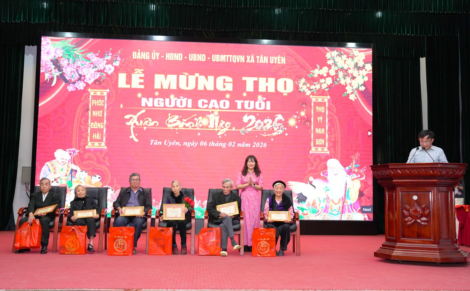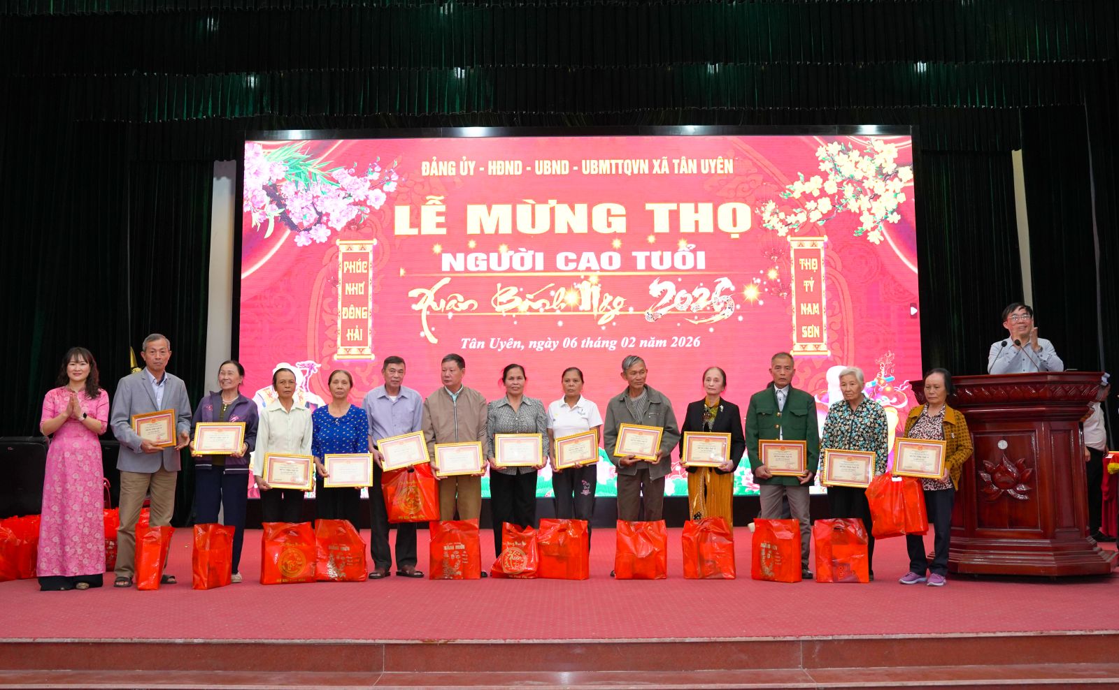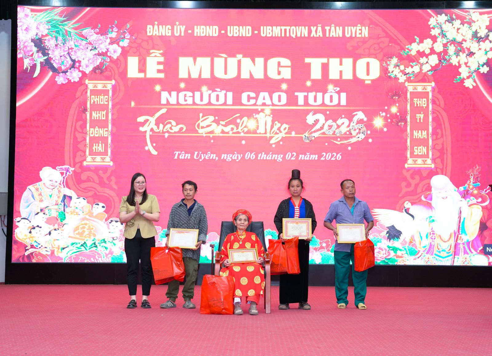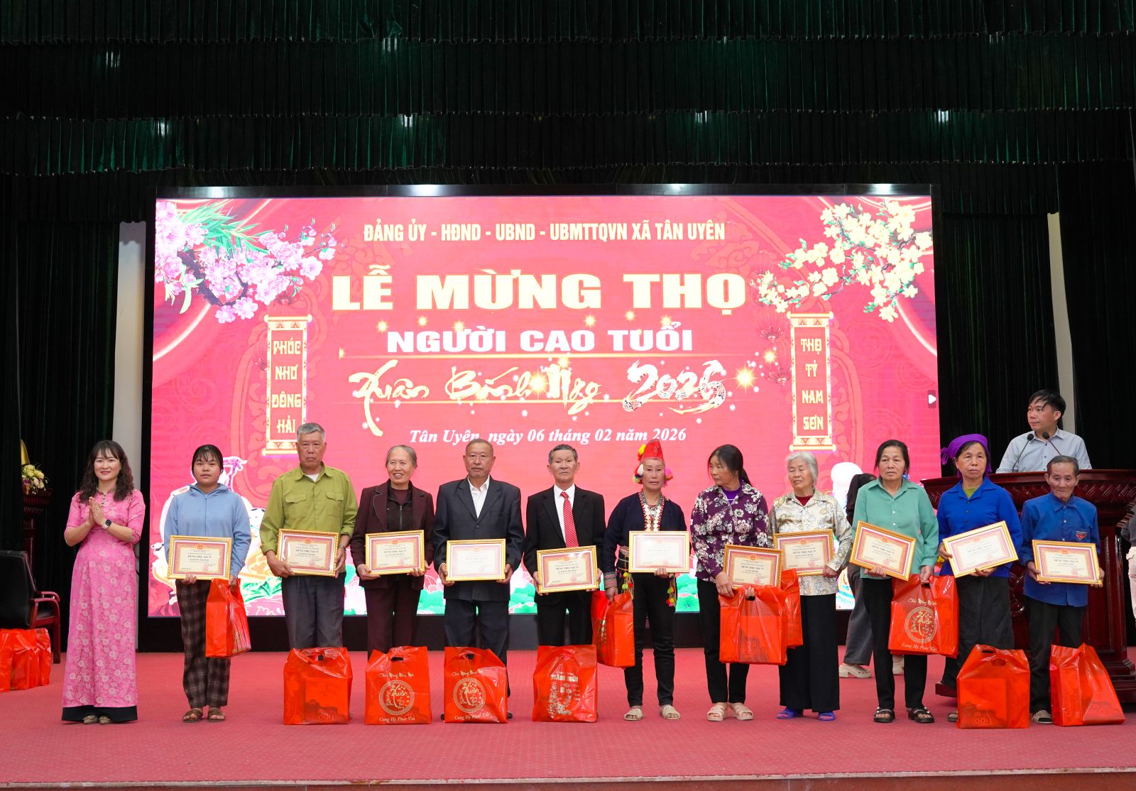 Trong không khí vui tươi, phấn khởi của những ngày đầu Xuân mới – Tết Nguyên đán Bính Ngọ năm 2026. Chiều ngày (6/02) Đảng ủy, HĐND, UBND, Ủy ban MTTQ Việt Nam xã Tân Uyên tổ chức buổi Lễ Chúc thọ, Mừng thọ cho 213 cụ Người cao tuổi trên địa bàn xã. Dự buổi Lễ có đồng chí đồng chí Lò Văn Học – Phó Bí thư Thường trực Đảng ủy; đồng chí Trương Thị Huế - Ủy viên BTV, Phó Chủ tịch HĐND xã; đồng chí Bùi Thị Minh Hải - Ủy viên BTV, Phó Chủ tịch UBND xã; lãnh đạo các ban, ngành, đoàn thể chính trị - xã hội.