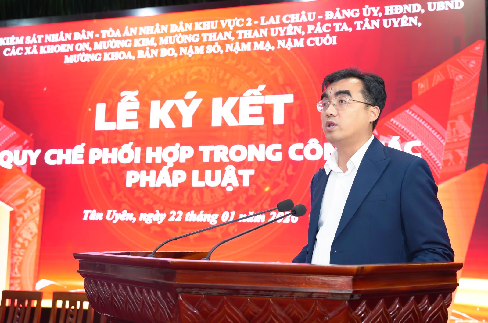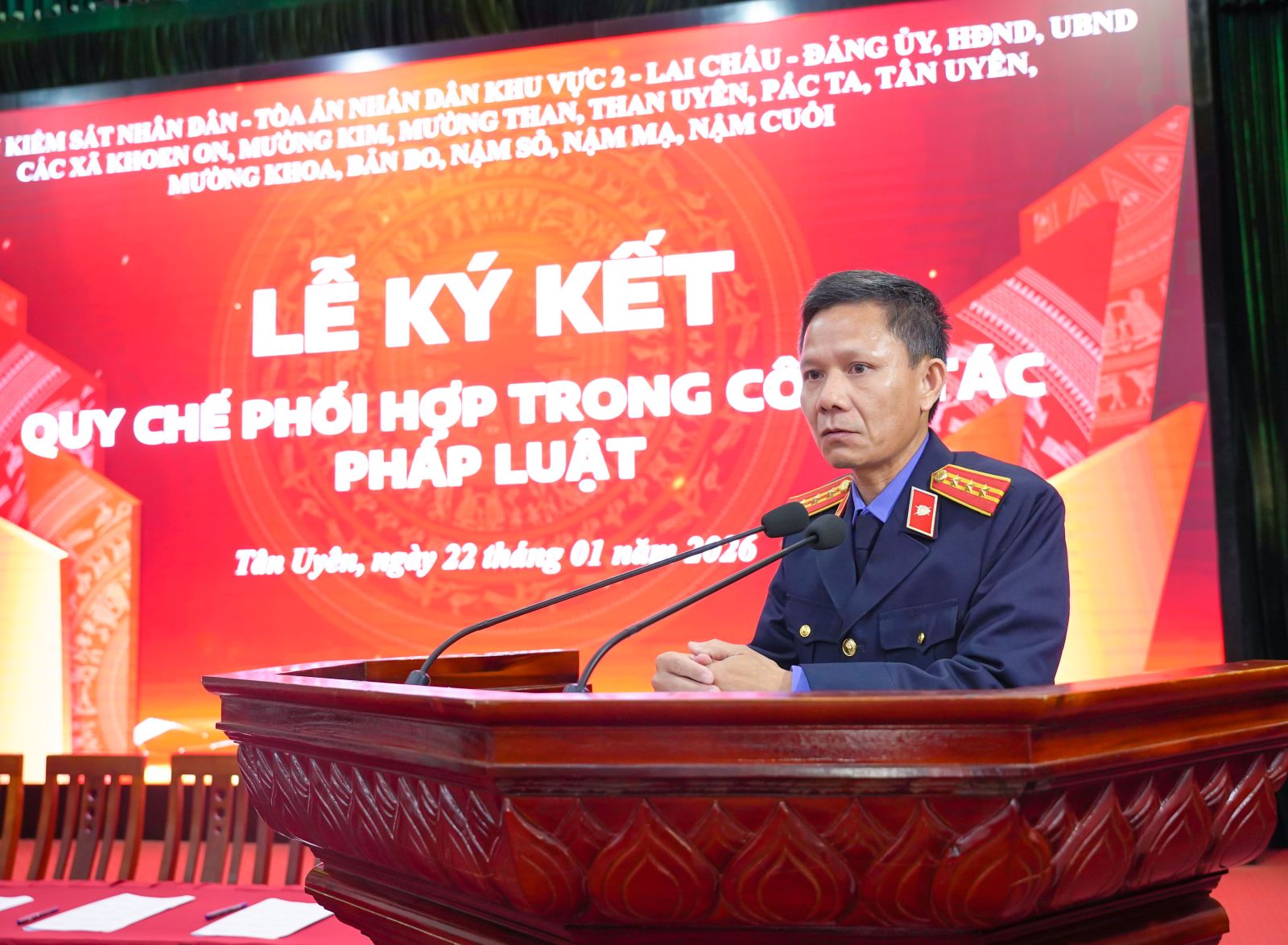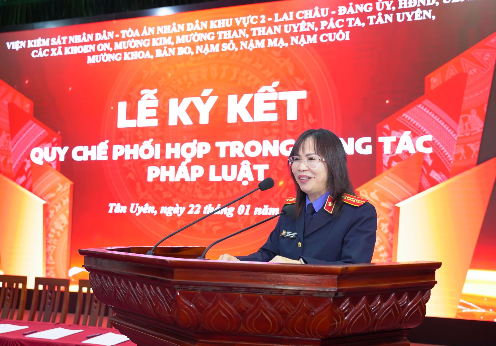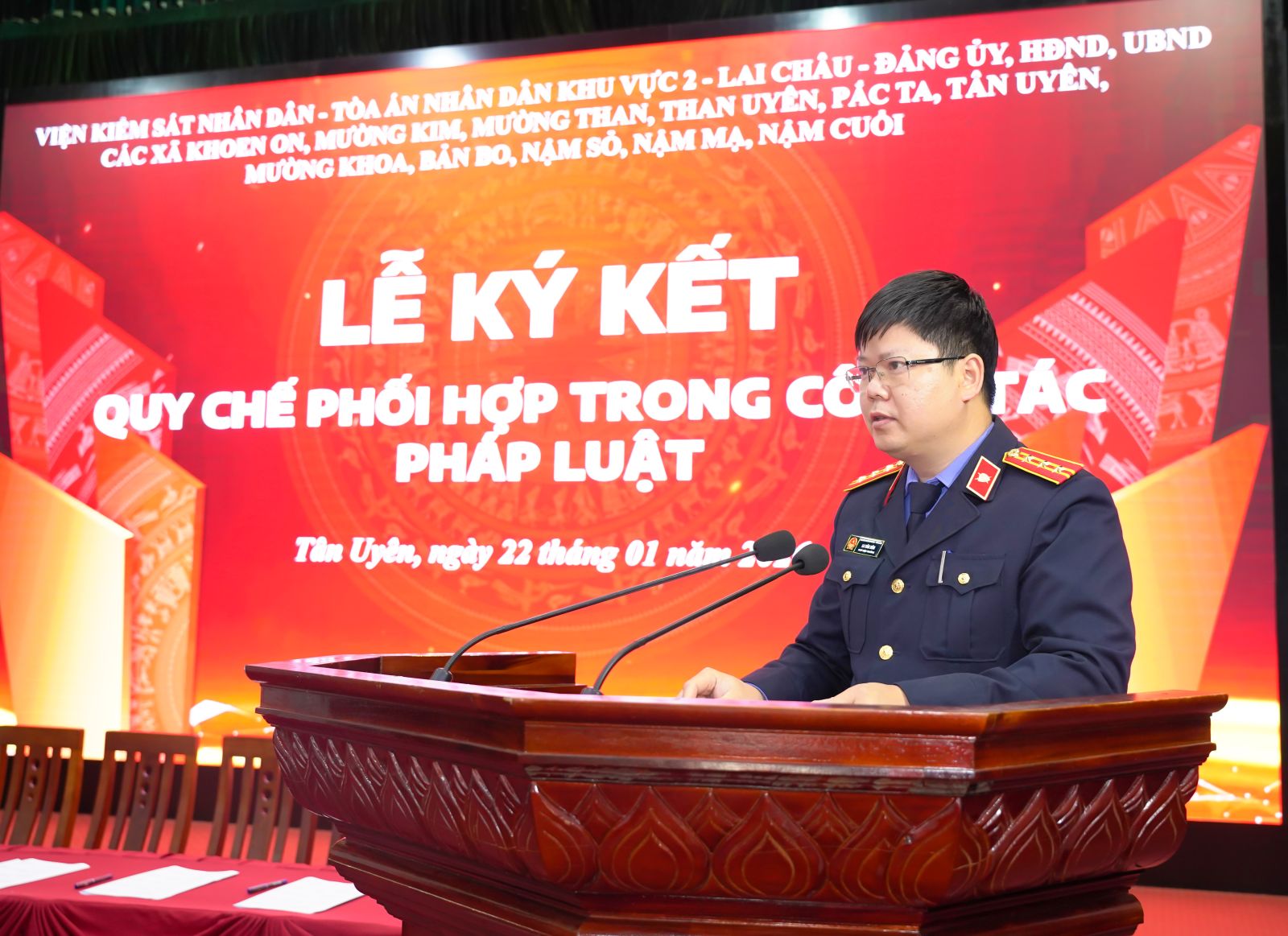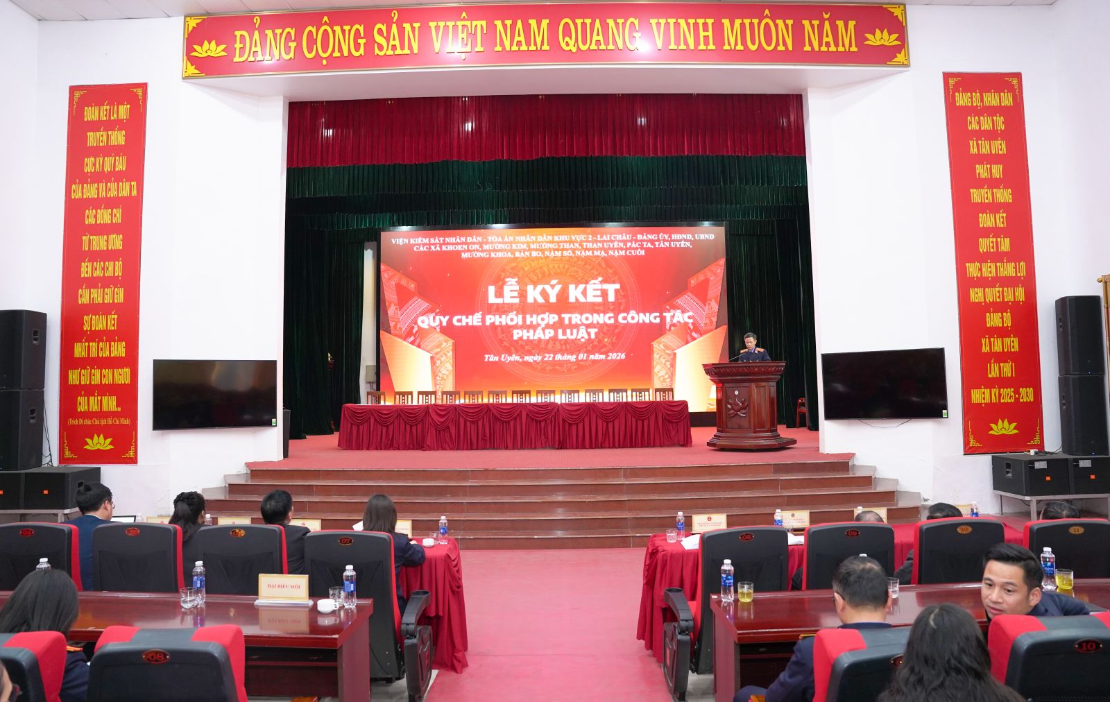 Chiều ngày (22/01), Tại Trung tâm Hội nghị - Văn hóa xã Tân Uyên, Tòa án nhân dân, Viện Kiểm sát nhân dân Khu vực 2 – Lai Châu phối hợp với các xã Tân Uyên, Khoe on, Mường Than, Nậm Sỏ, Pắc Ta, Mường Khoa, Mường Kim, Bản Bo, Nậm Cuổi, Nậm Mạ, Than Uyên, tổ chức Lễ ký kết quy chế phối hợp trong công tác pháp luật. Dự buổi Lễ có đồng chí Vũ Thị Kim Tuyến – Phó Viện trưởng Viện kiểm sát nhân dân tỉnh; lãnh đạo Đảng ủy các xã ký kết. Về phía xã Tân Uyên có đồng chí Lò Văn Học – Phó Bí thư Thường trực Đảng ủy; lãnh đạo Thường trực HĐND – UBND – UBMTTQVN xã; lãnh đạo, công chức Tòa án nhân dân, Viện kiểm sát nhân dân Khu vực 2 – Lai Châu.