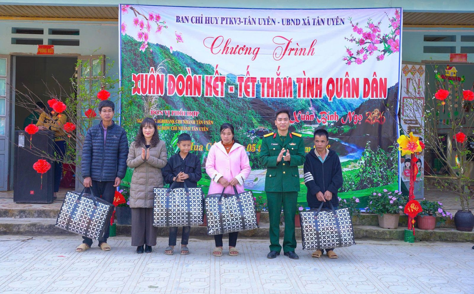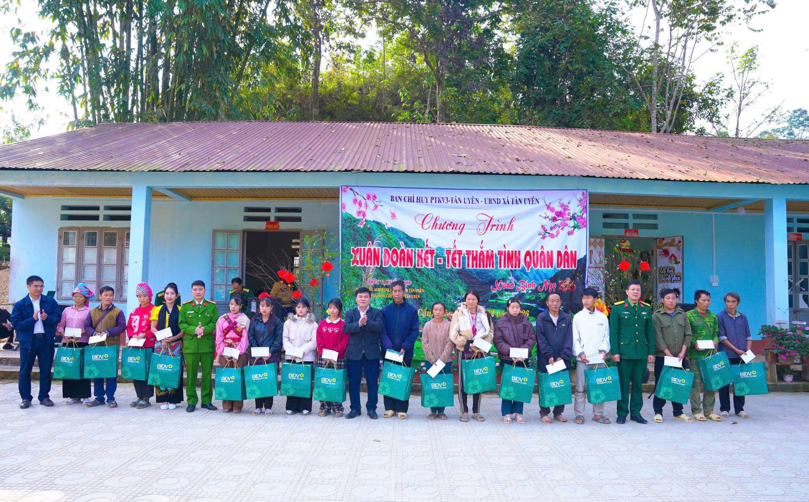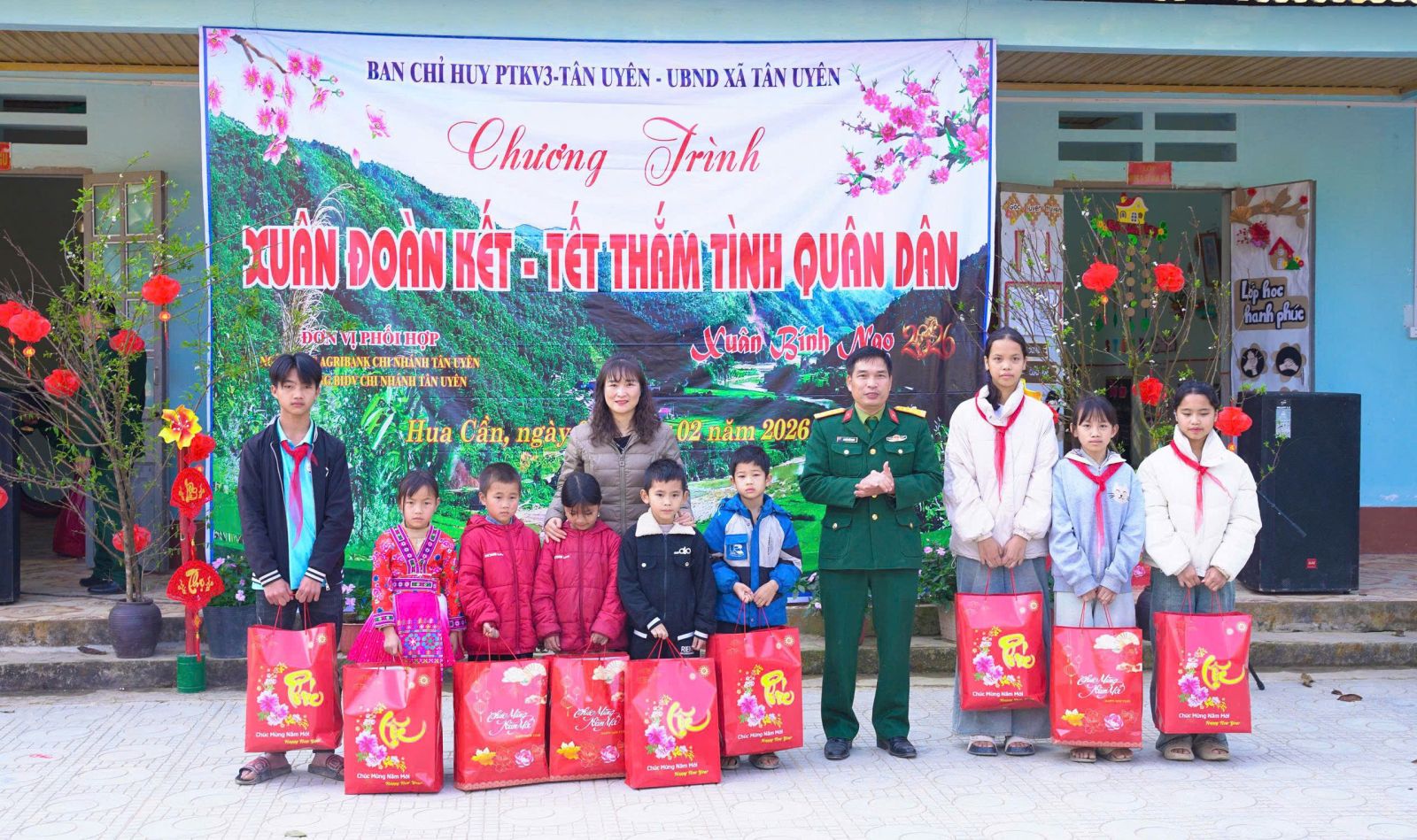 Sáng ngày (5/02), tại thôn Hua Cần xã. Ban Chỉ huy phòng thủ Khu vực 3- Tân Uyên, phối hợp với UBND xã Tân Uyên, Ngân hàng TMCP Đầu tư và phát triển Việt Nam chi nhánh Tân Uyên, Ngân hàng Nông nghiệp và phát triển nông thôn Việt Nam chi nhánh Tân Uyên, long trọng tổ chức Chương trình “Xuân đoàn kết- Tết thắm tình quân dân” nhân dịp tết Nguyên đán Bính Ngọ năm 2026. Tham dự Chương trình có đồng chí Đại tá: Nguyễn Hữu Đức- Chỉ huy trưởng Ban Chỉ huy PTKV3- Tân Uyên; cán bộ, chiến sỹ Ban Chỉ huy PTKV3- Tân Uyên; đồng chí Lò Văn Học – Phó Bí thư Thường trực Đảng ủy; đồng chí Bùi thị Minh Hải - Ủy viên Ban Thường vụ, Phó chủ tịch UBND xã; lãnh đạo các đơn vị Ngân hàng BIDV, Agribank chi nhánh Tân Uyên cùng đông đảo Nhân dân thôn Hua Cần.