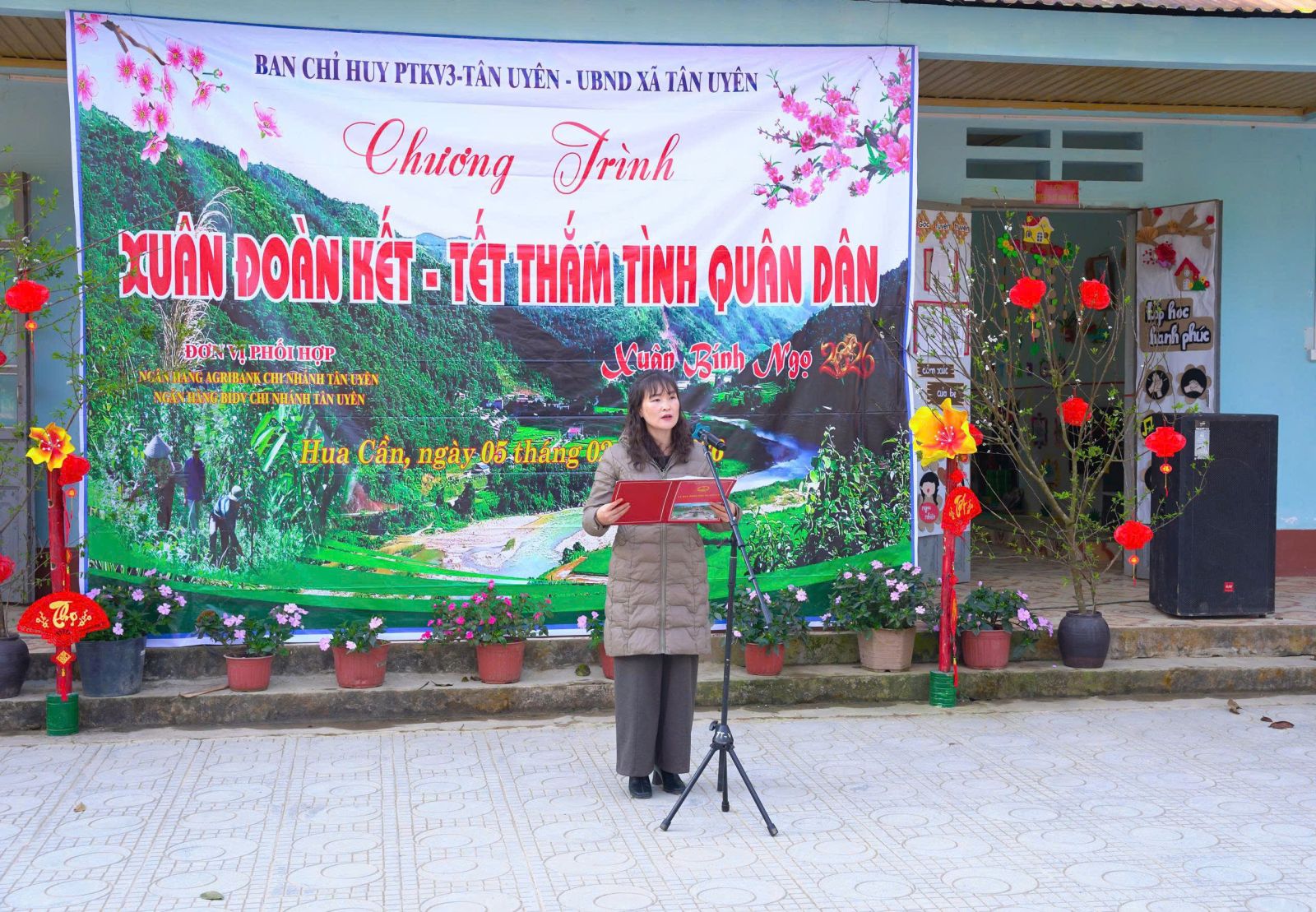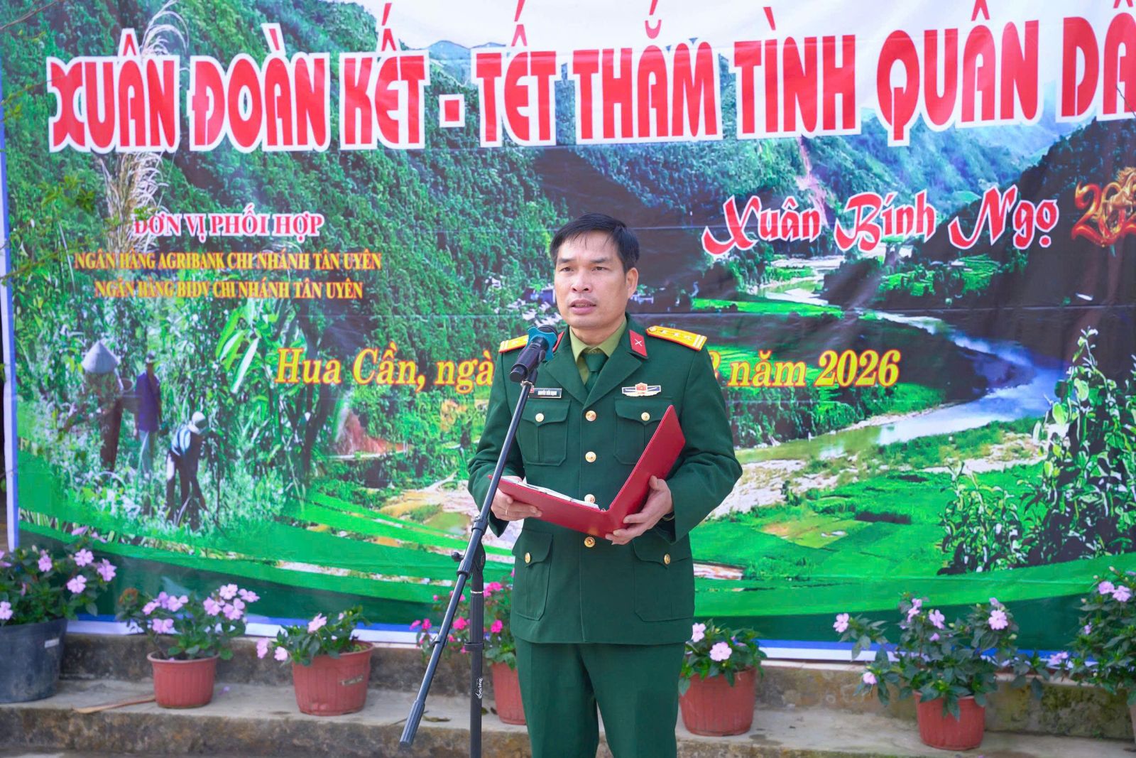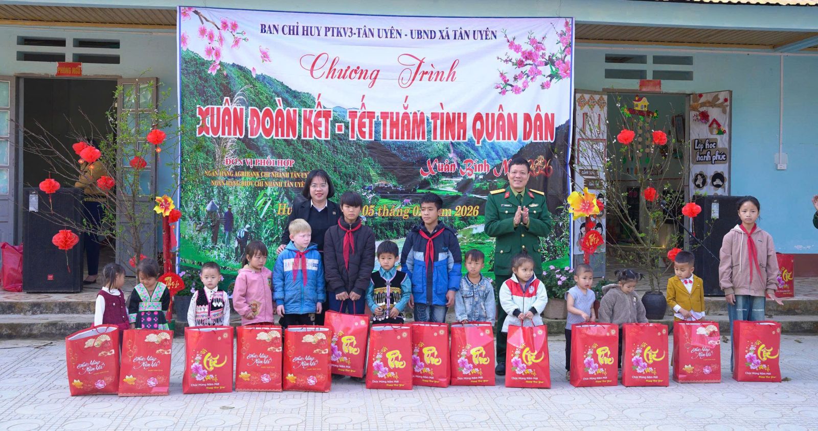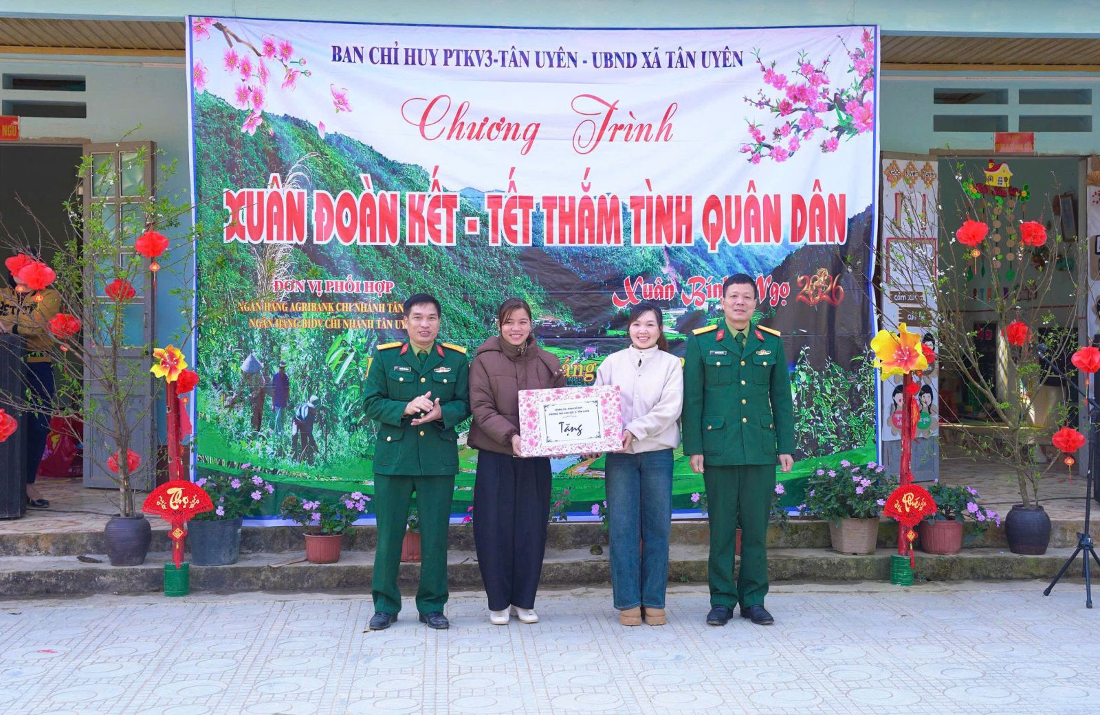 Sáng ngày (5/02), tại thôn Hua Cần xã. Ban Chỉ huy phòng thủ Khu vực 3- Tân Uyên, phối hợp với UBND xã Tân Uyên, Ngân hàng TMCP Đầu tư và phát triển Việt Nam chi nhánh Tân Uyên, Ngân hàng Nông nghiệp và phát triển nông thôn Việt Nam chi nhánh Tân Uyên, long trọng tổ chức Chương trình “Xuân đoàn kết- Tết thắm tình quân dân” nhân dịp tết Nguyên đán Bính Ngọ năm 2026. Tham dự Chương trình có đồng chí Đại tá: Nguyễn Hữu Đức- Chỉ huy trưởng Ban Chỉ huy PTKV3- Tân Uyên; cán bộ, chiến sỹ Ban Chỉ huy PTKV3- Tân Uyên; đồng chí Lò Văn Học – Phó Bí thư Thường trực Đảng ủy; đồng chí Bùi thị Minh Hải - Ủy viên Ban Thường vụ, Phó chủ tịch UBND xã; lãnh đạo các đơn vị Ngân hàng BIDV, Agribank chi nhánh Tân Uyên cùng đông đảo Nhân dân thôn Hua Cần.