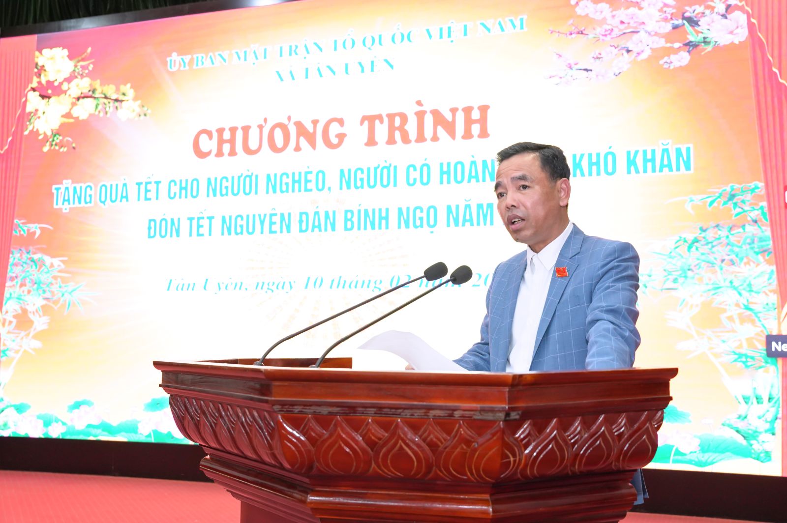 Nhân dịp Xuân mới Bính Ngọ, đồng chí Bí thư Đảng ủy xã chúc các gia đình sức khỏe, bình an, đón Tết vui tươi, ấm áp và tiếp tục vươn lên trong cuộc sống. Cấp ủy, chính quyền xã Tân Uyên cam kết sẽ tiếp tục nỗ lực, phát huy vai trò của cả hệ thống chính trị, cùng Mặt trận Tổ quốc và các đoàn thể chăm lo tốt hơn nữa đời sống vật chất, tinh thần của nhân dân, với tinh thần không để ai bị bỏ lại phía sau.