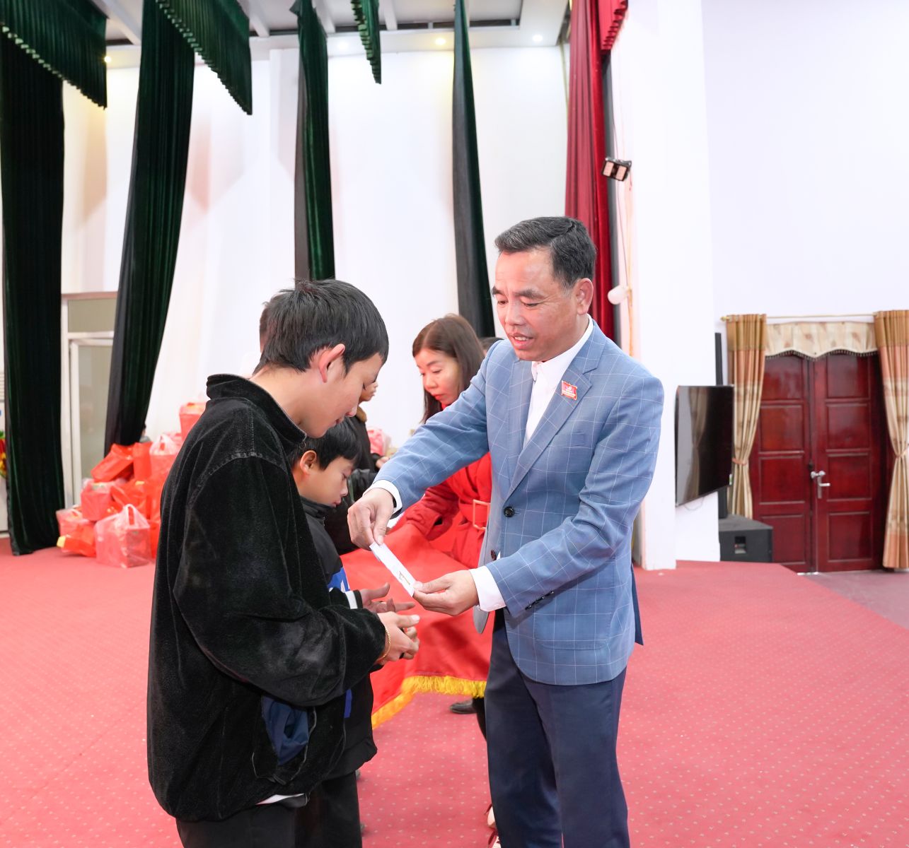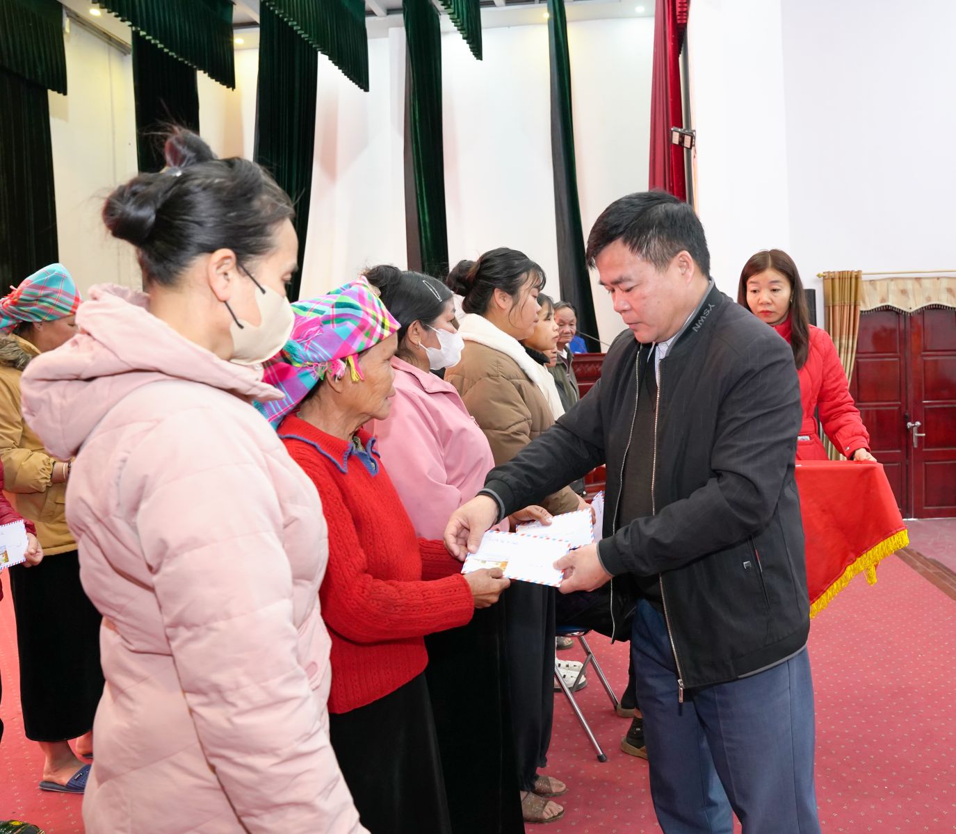Ảnh: Đồng chí Nguyễn Minh Hiệu, Bí thư Đảng ủy; đồng chí Lò Văn Học, Phó Bí thư Thường trực Đảng ủy; đồng chí Chu Văn Thanh, Phó Bí thư, Chủ tịch UBND xã trao quà cho các người nghèo, người có hoàn cảnh khó khăn