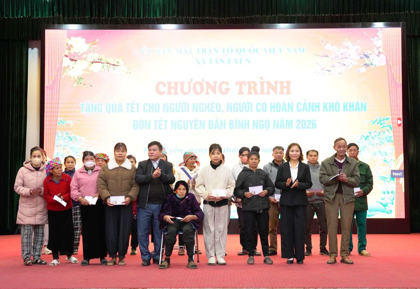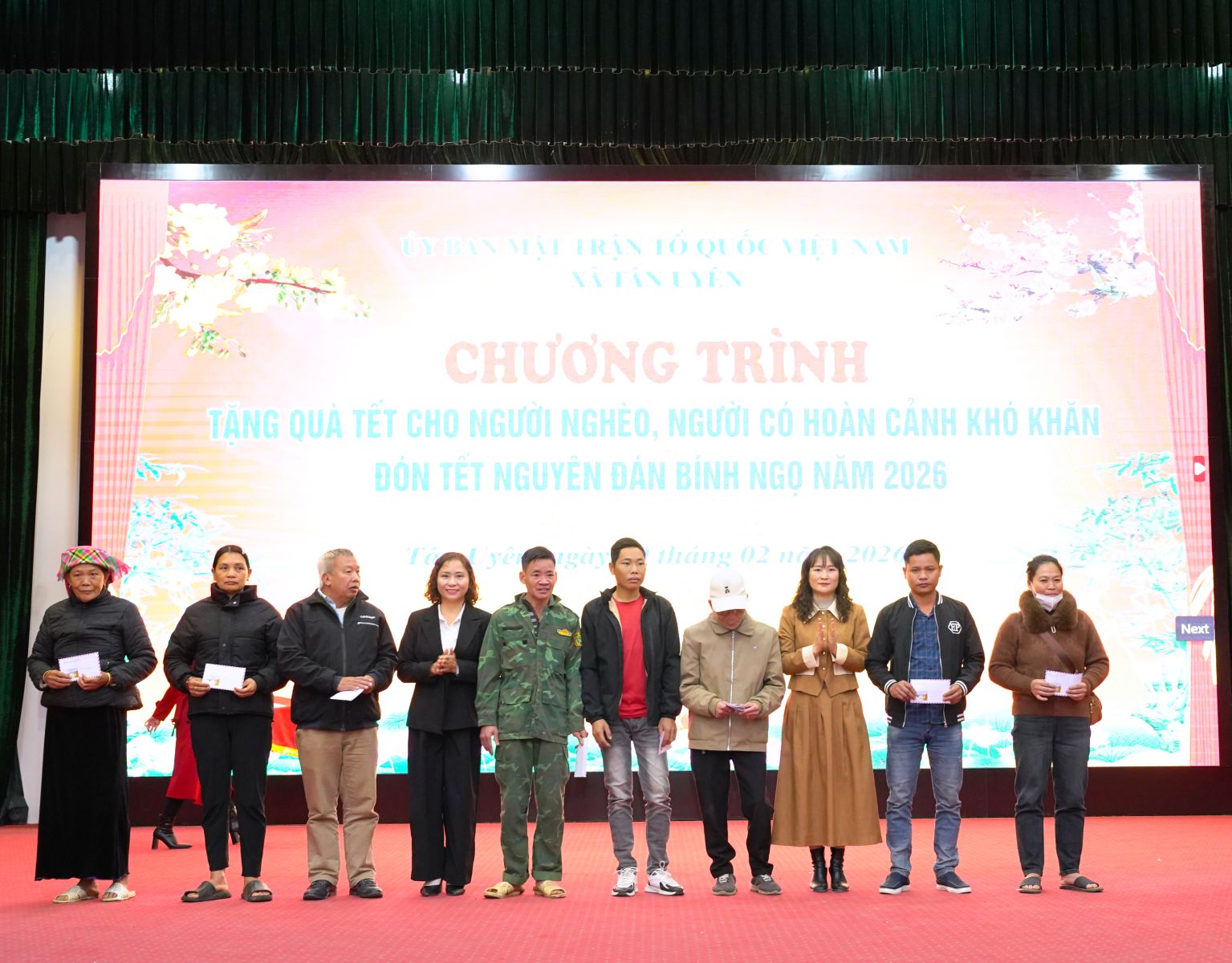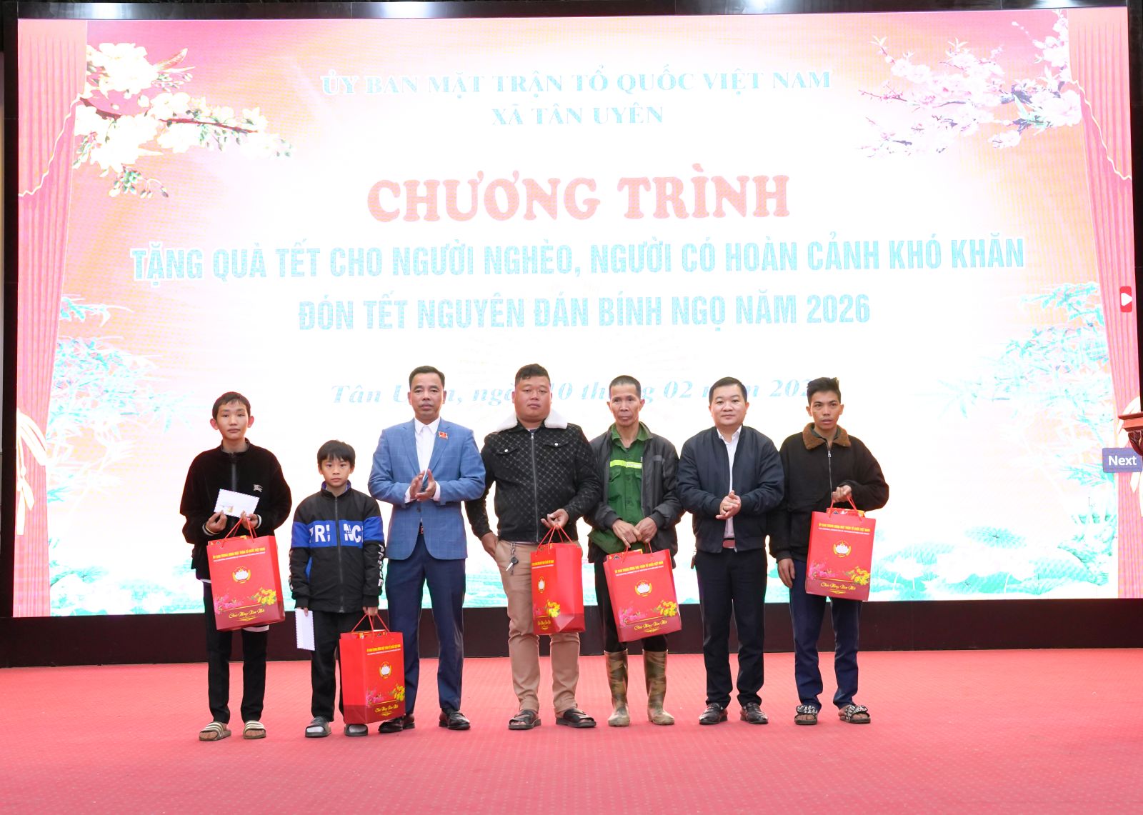 Nhằm chăm lo đời sống vật chất, tinh thần cho người nghèo, người có hoàn cảnh khó khăn, trong dịp Tết cổ truyền. Sáng ngày 10/02, tại Trung tâm Hội nghị - Văn hóa xã, Ủy ban Mặt trận Tổ quốc Việt Nam xã Tân Uyên tổ chức Chương trình trao tặng quà Tết cho người nghèo, người có hoàn cảnh khó khăn nhân dịp Tết Nguyên đán Bính Ngọ năm 2026. Dự Chương trình có các đồng chí Nguyễn Minh Hiệu - Ủy viên Ban Chấp hành Đảng bộ tỉnh, Bí thư Đảng ủy; đồng chí Lò Văn Học – Phó Bí thư Thường trực Đảng ủy; đồng chí Chu Văn Thanh - Phó Bí thư, Chủ tịch UBND xã; lãnh đạo UBND – UBMTTQVN xã; lãnh đạo các ban, ngành, đoàn thể chính trị - xã hội xã; Trưởng các thôn, bản và các hộ nghèo, hộ có hoàn cảnh khó khăn được nhận quà.