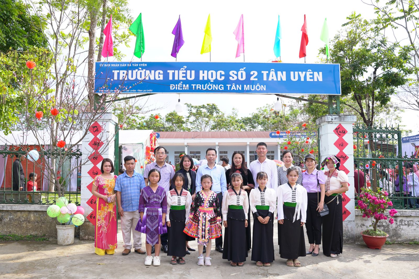 Ảnh: Đồng chí Nguyễn Minh Hiệu - Ủy viên BCH Đảng bộ tỉnh, Bí thư Đảng ủy xã cùng đoàn công tác chụp ảnh lưu niệm cùng Ban giám hiệu, giáo viên và học sinh Trường TH số 2 Tân Uyên