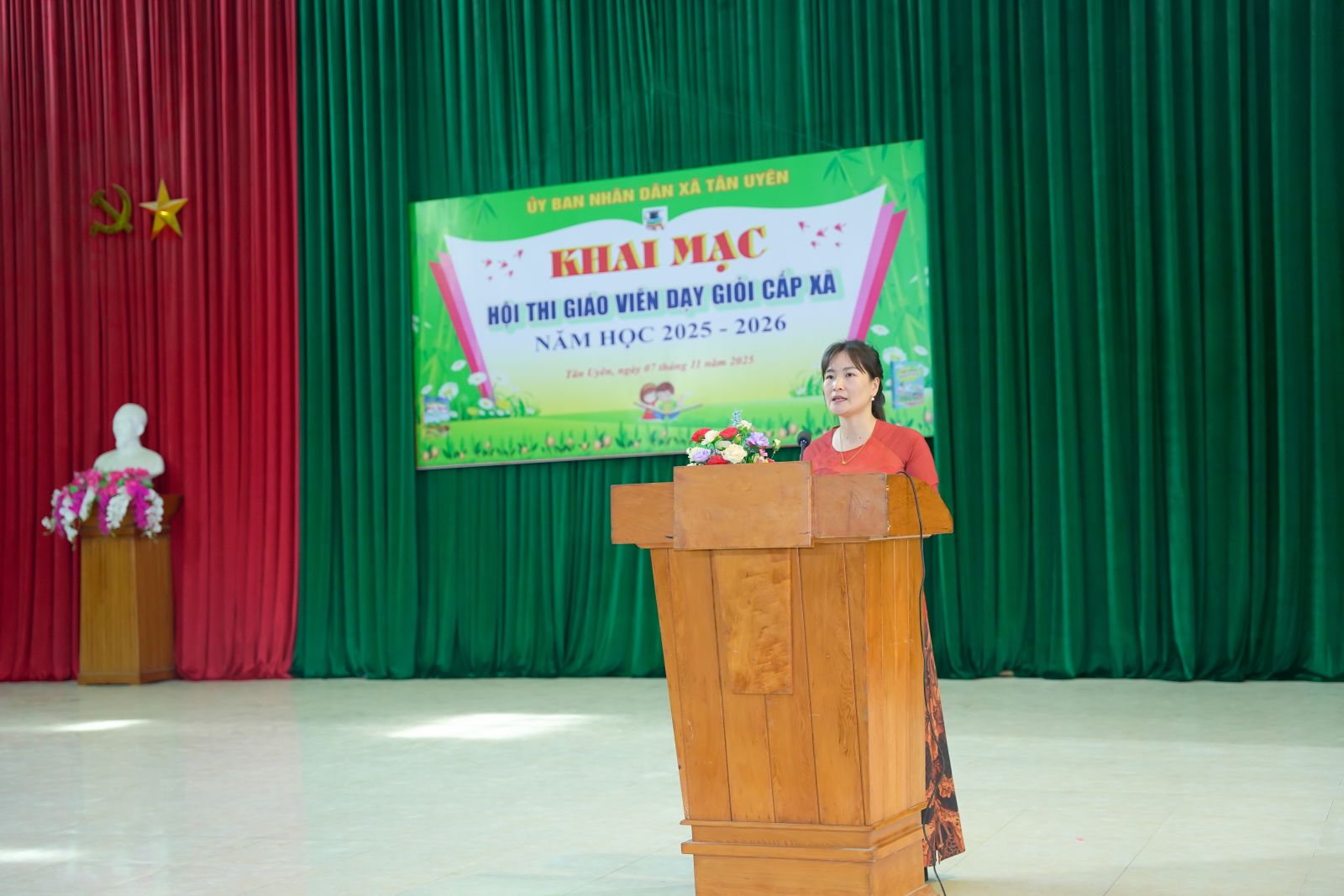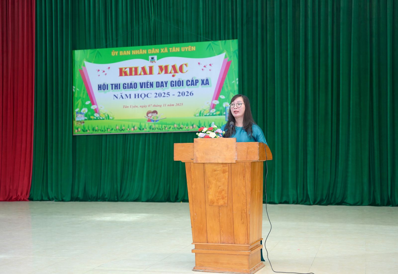 Phát biểu khai mạc Hội thi, đồng chí Bùi Thị Minh Hải - Ủy viên Ban Thường vụ, Phó Chủ tịch UBND xã nhấn mạnh. Hội thi giáo viên dạy giỏi cấp xã năm học 2025 - 2026. Đây là năm đầu tiên xã Tân Uyên tổ chức Hội thi dưới mô hình chính quyền hai cấp, đánh dấu bước chuyển quan trọng trong công tác quản lý, điều hành và phát triển giáo dục ở địa phương - một dấu mốc có ý nghĩa sâu sắc đối với sự nghiệp “trồng người”. Đồng thời, Hội thi là dịp để tôn vinh tài năng, tâm huyết và sáng tạo của các thầy giáo, cô giáo, mà còn là cơ hội để đánh giá toàn diện hơn về chất lượng đội ngũ nhà giáo, thúc đẩy phong trào đổi mới phương pháp dạy học, đáp ứng yêu cầu giáo dục trong giai đoạn. Tin tưởng rằng, với truyền thống đoàn kết, tinh thần trách nhiệm và lòng yêu nghề của đội ngũ cán bộ, giáo viên; với sự quan tâm, đồng hành của các cấp ủy Đảng, chính quyền và nhân dân, ngành giáo dục xã Tân Uyên sẽ tiếp tục gặt hái được nhiều thành công mới, xứng đáng với niềm tin và kỳ vọng của Đảng bộ, chính quyền và nhân dân.