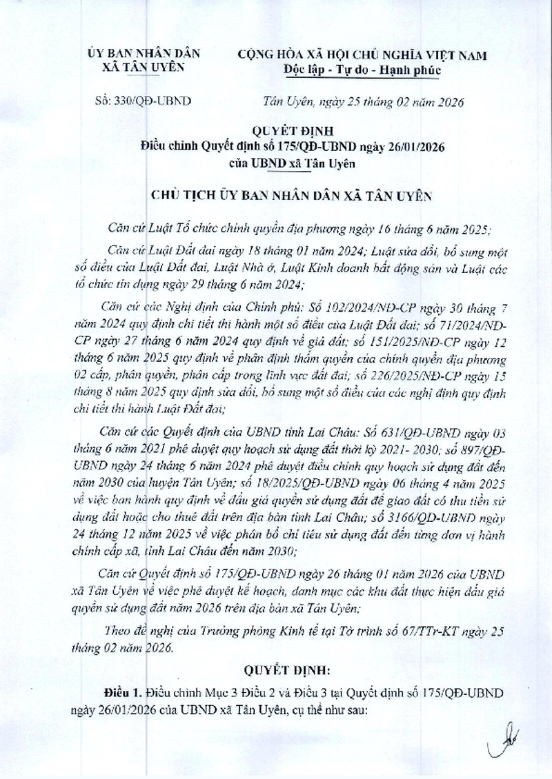 | Tiêu đề văn bản | Quyết định điều chỉnh Quyết định số 175/QĐ-UBND ngày 26/01/2026 của UBND xã Tân Uyên | ||
