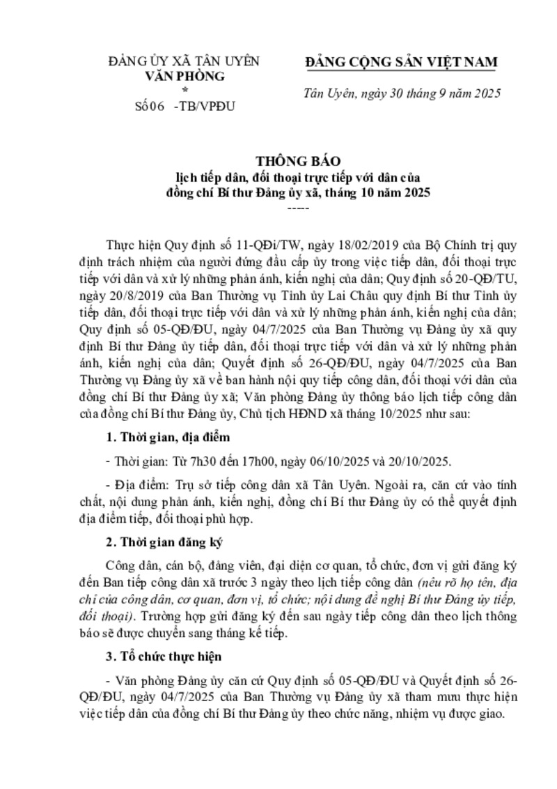 | Tiêu đề văn bản | Thông báo lịch tiếp dân, đối thoại trực tiếp với dân của đồng chí Bí thư Đảng ủy xã, tháng 10 năm 2025 | ||